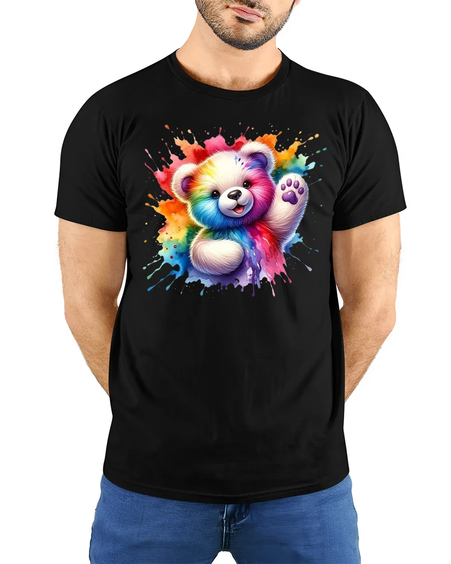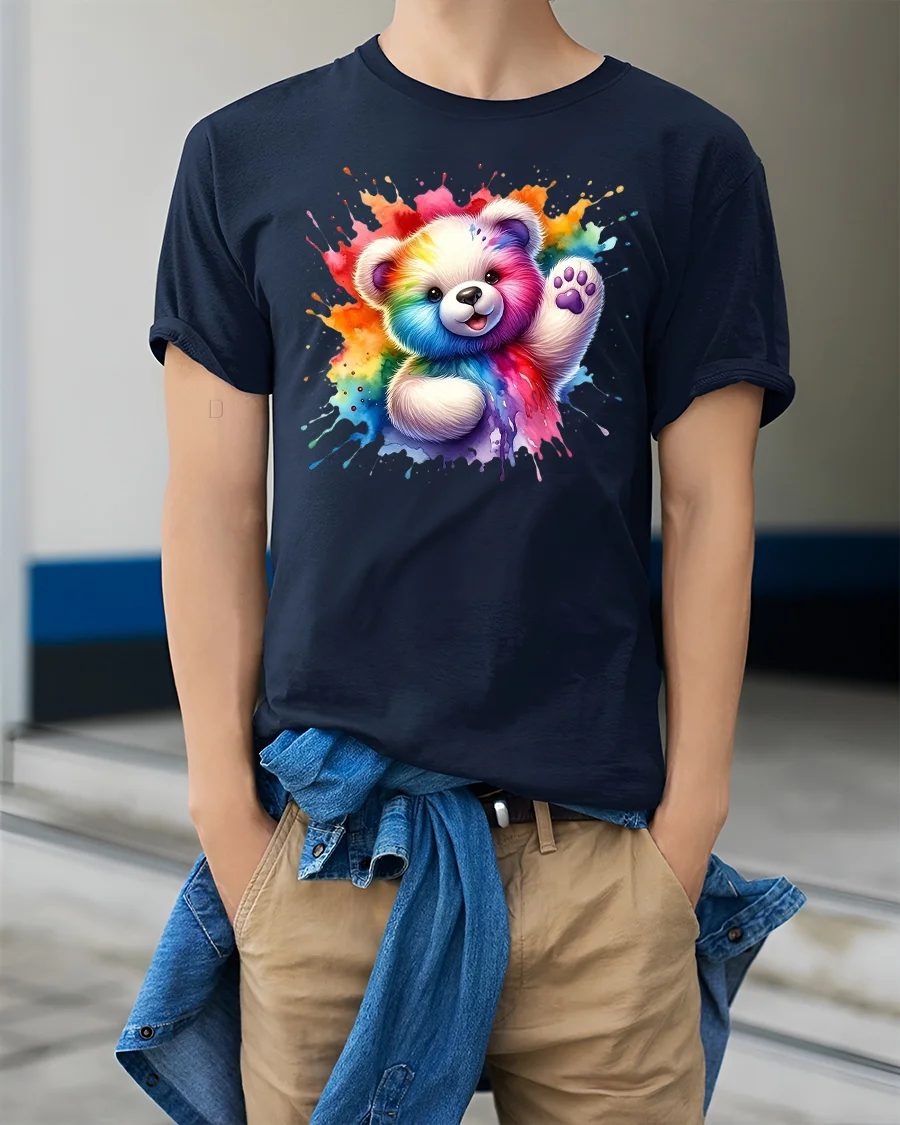 Rainbow Bear T-Shirt Cute Color Splash Graphic Tee is a bright and cheerful design that brings joy to every outfit.