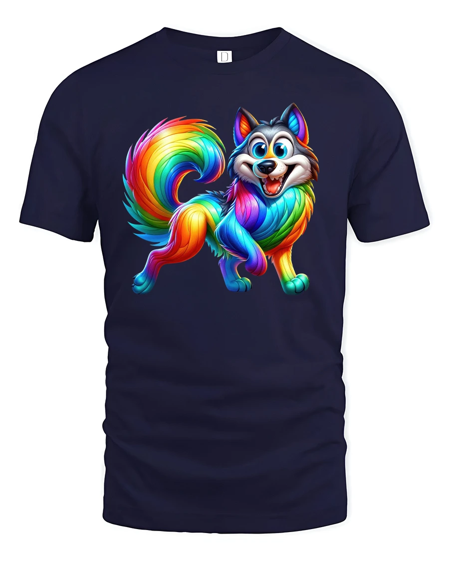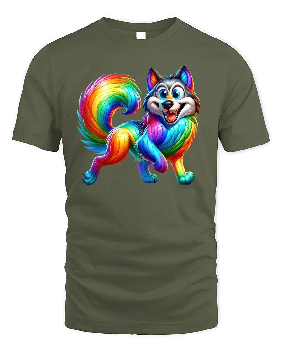Show your love for color, fun, and furry friends with this adorable rainbow husky tee.