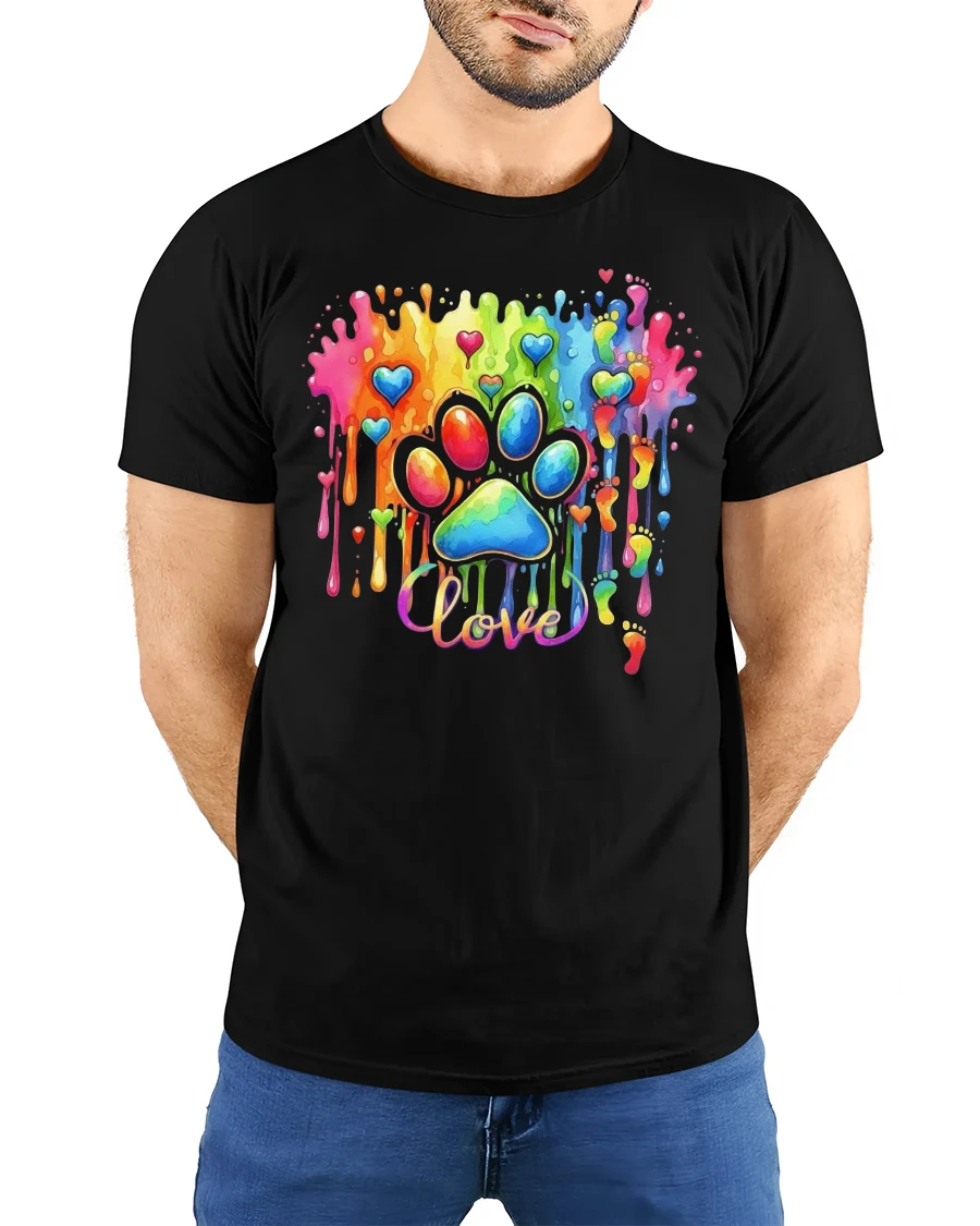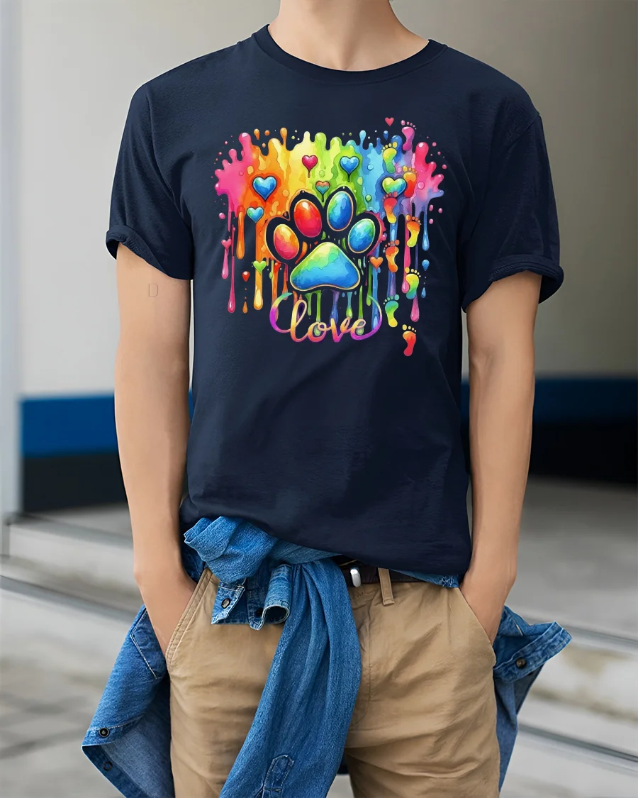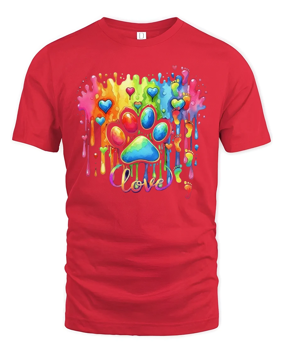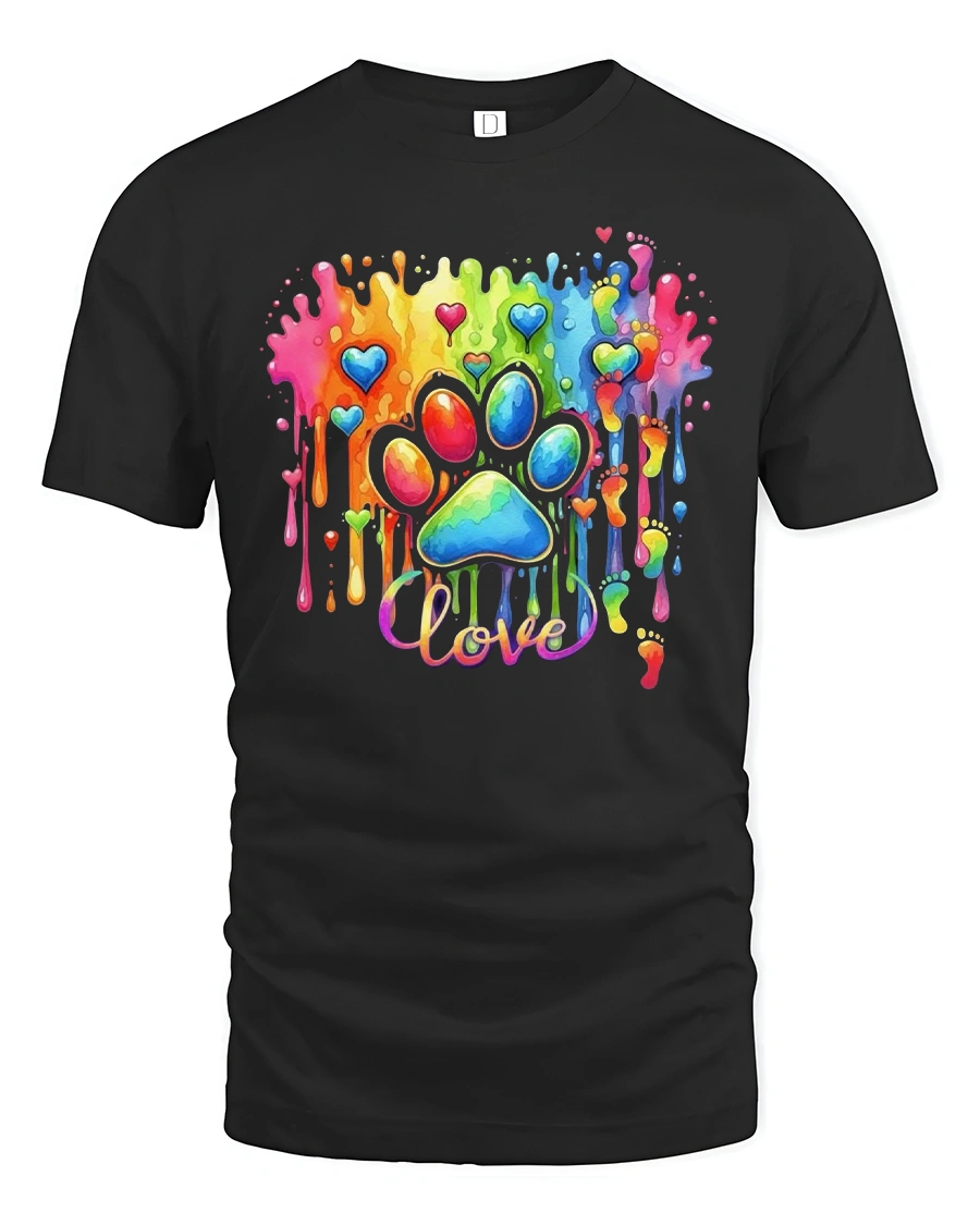 The Rainbow Love Paw Print Color Splash Artistic Graphic T Shirt celebrates emotion creativity and unconditional love through vibrant design.