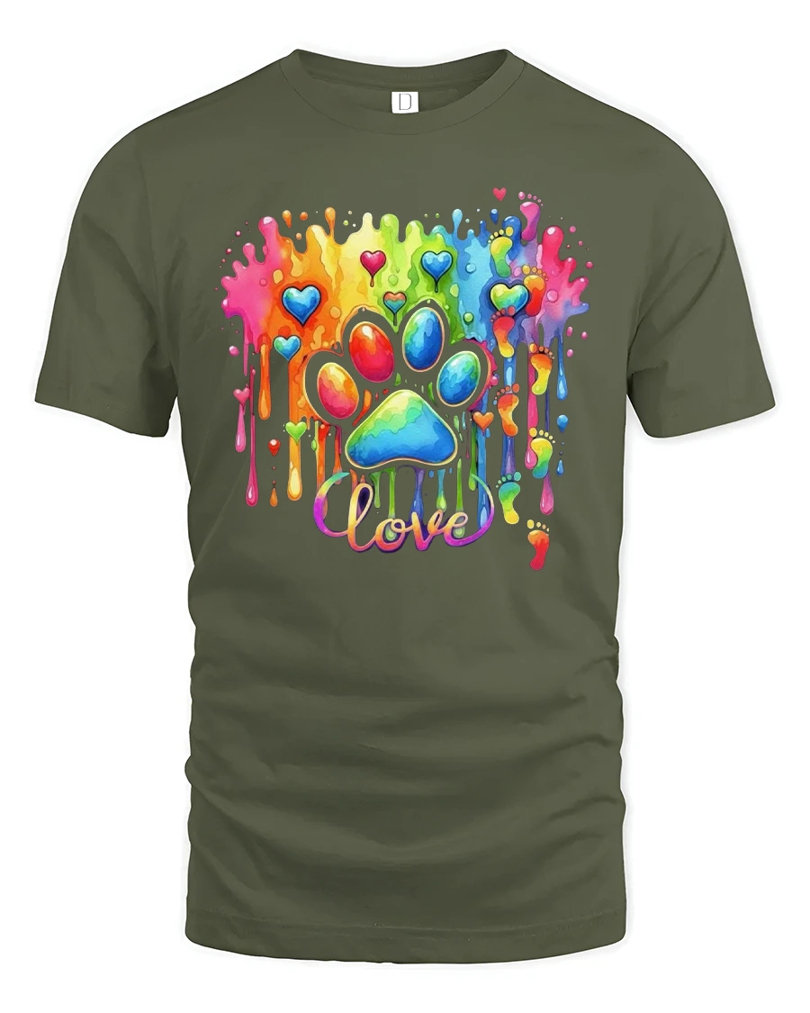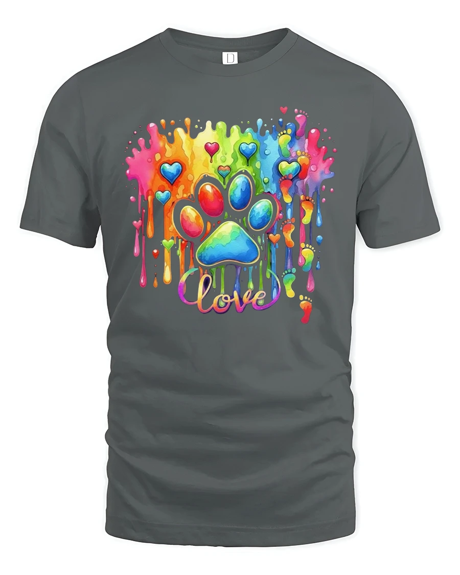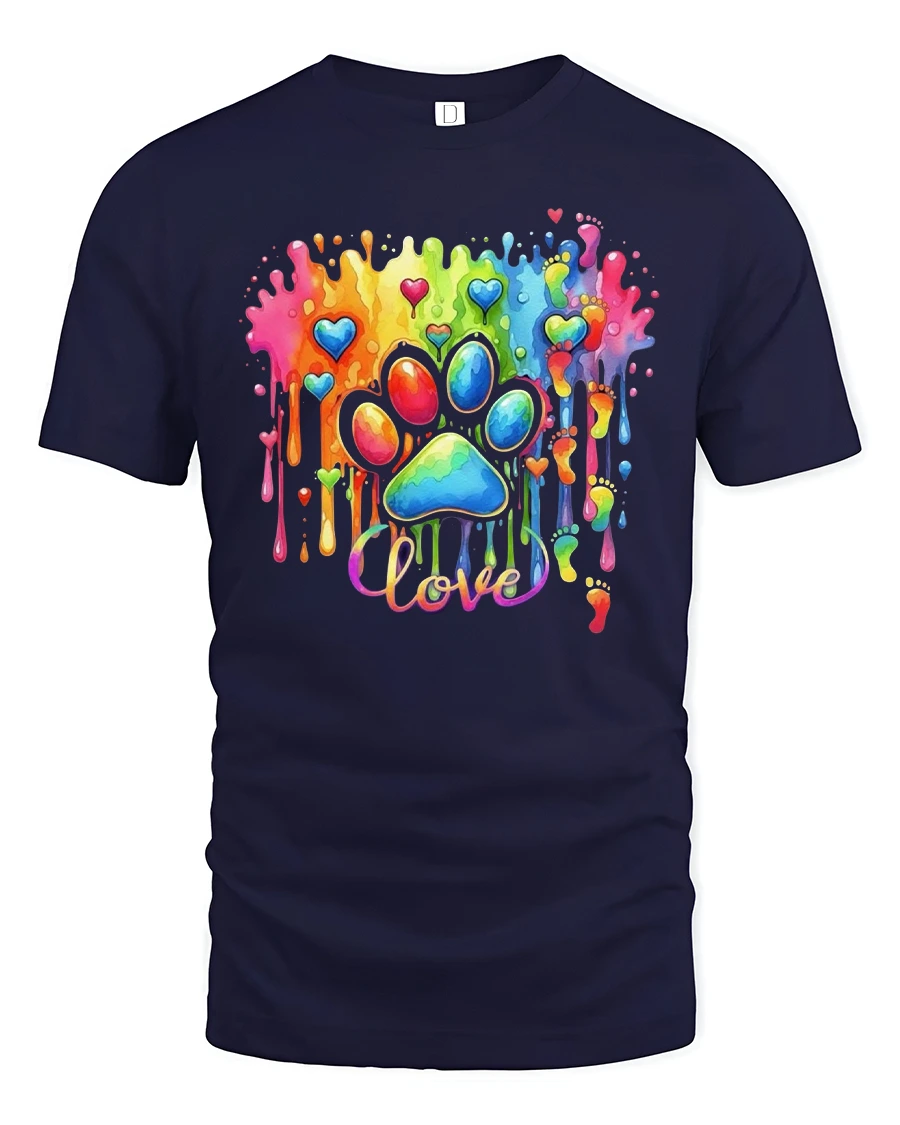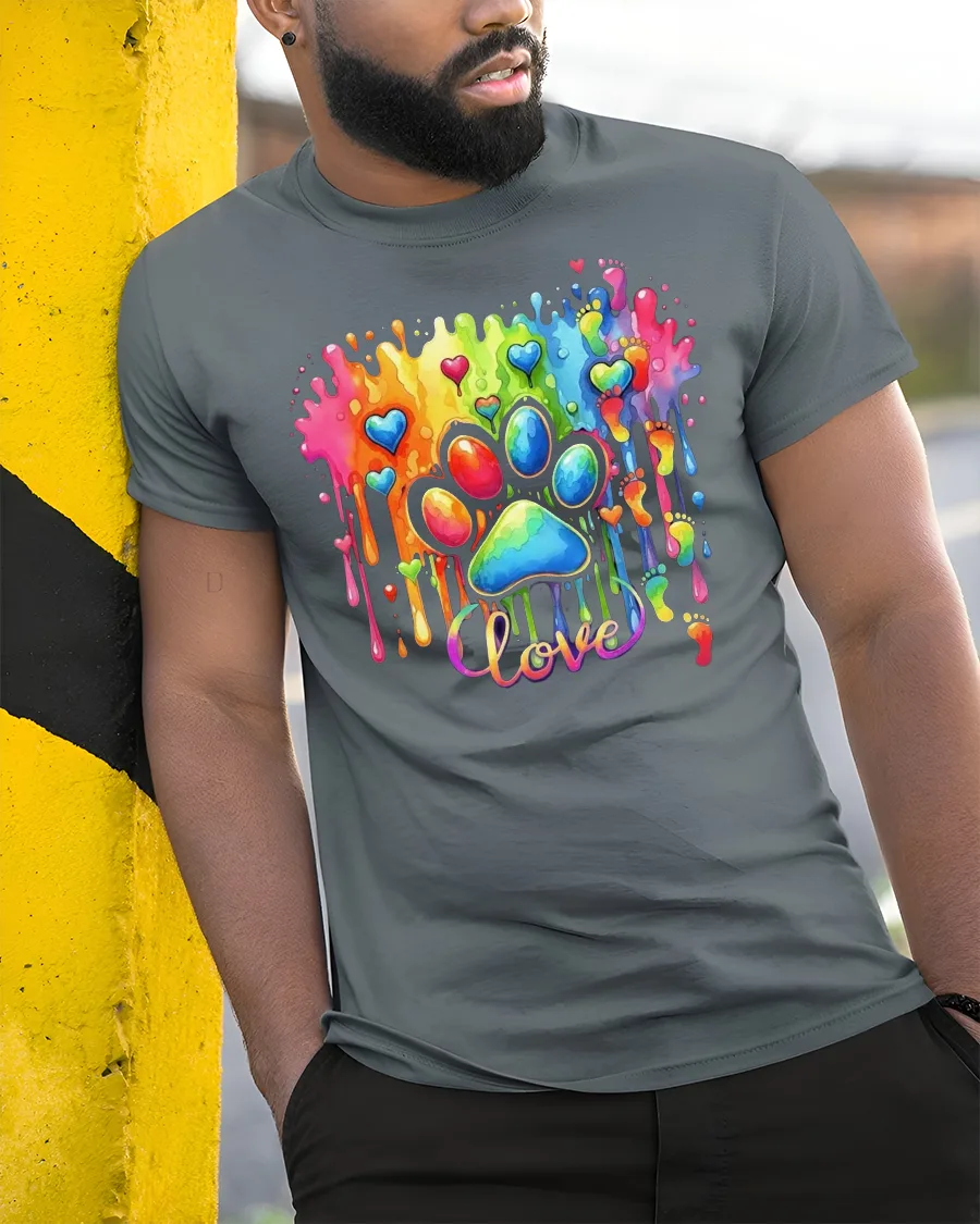 The Rainbow Love Paw Print Color Splash Artistic Graphic T Shirt adds meaning and personality to any wardrobe.