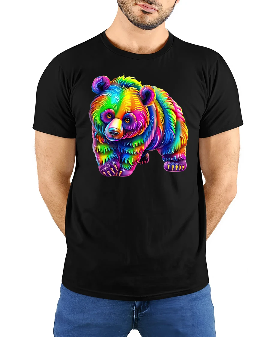 Perfect for casual wear, festivals, or making a statement in everyday life, this rainbow panda t-shirt is designed for comfort and style. The neon-inspired details pop against the background, giving the panda an energetic and lively vibe that makes it perfect for fans of colorful and artistic fashion.