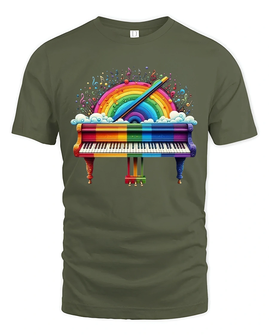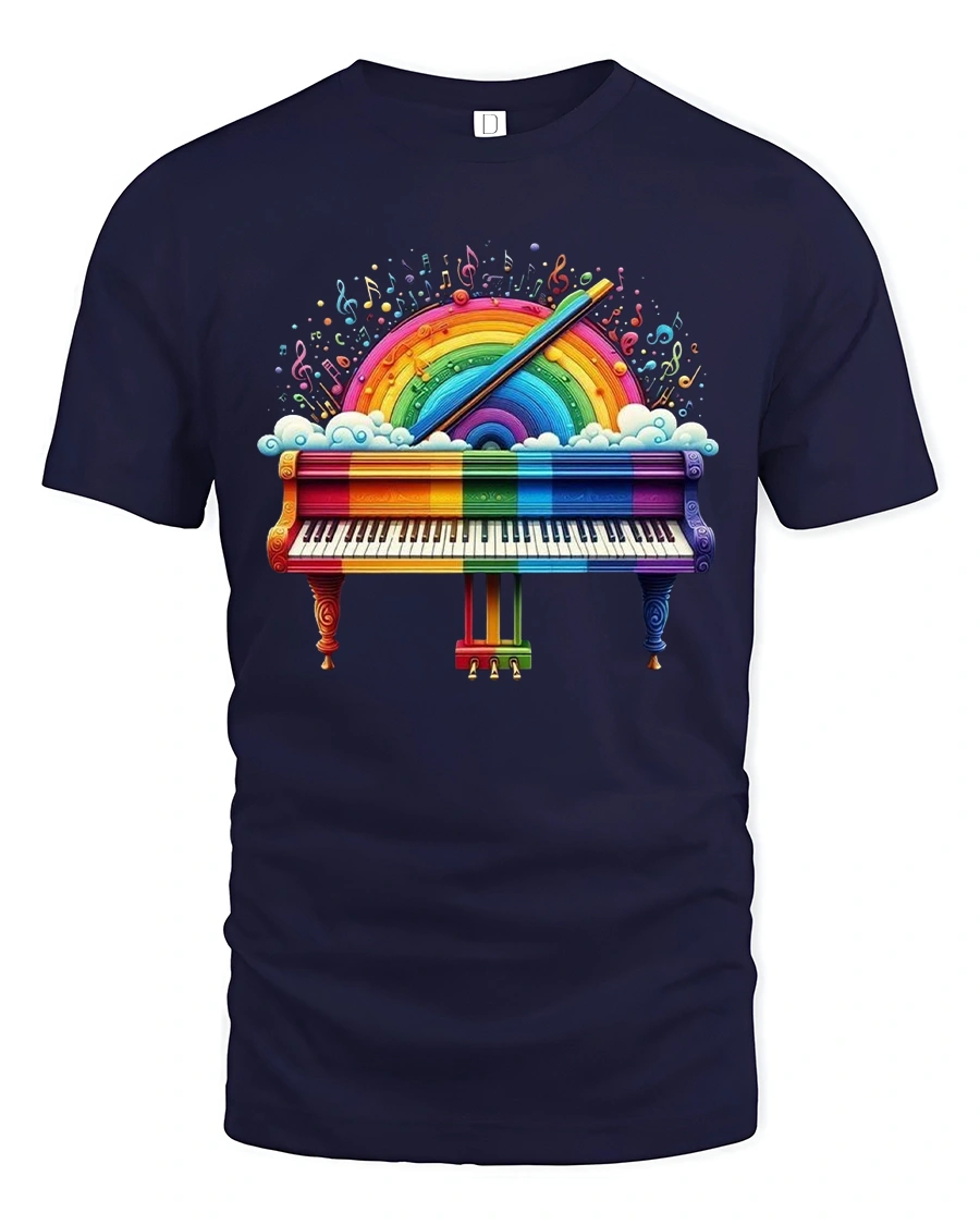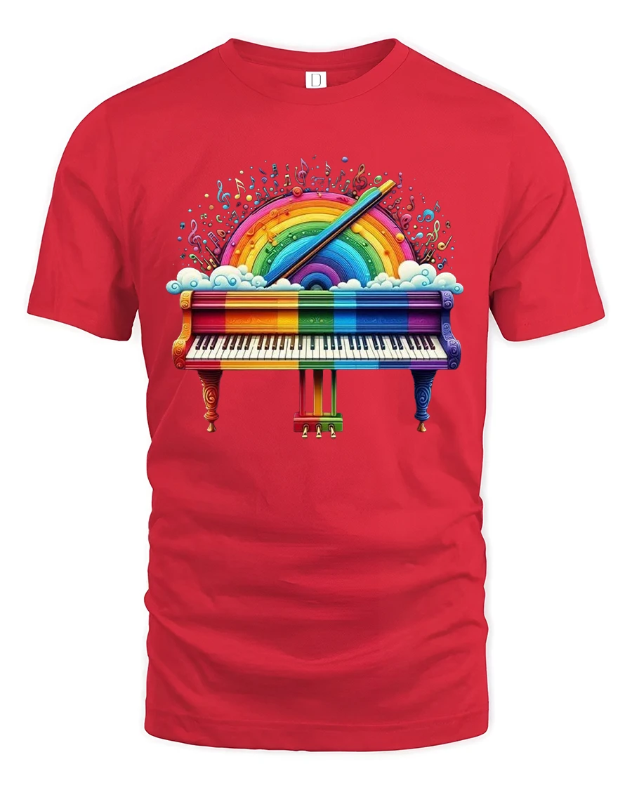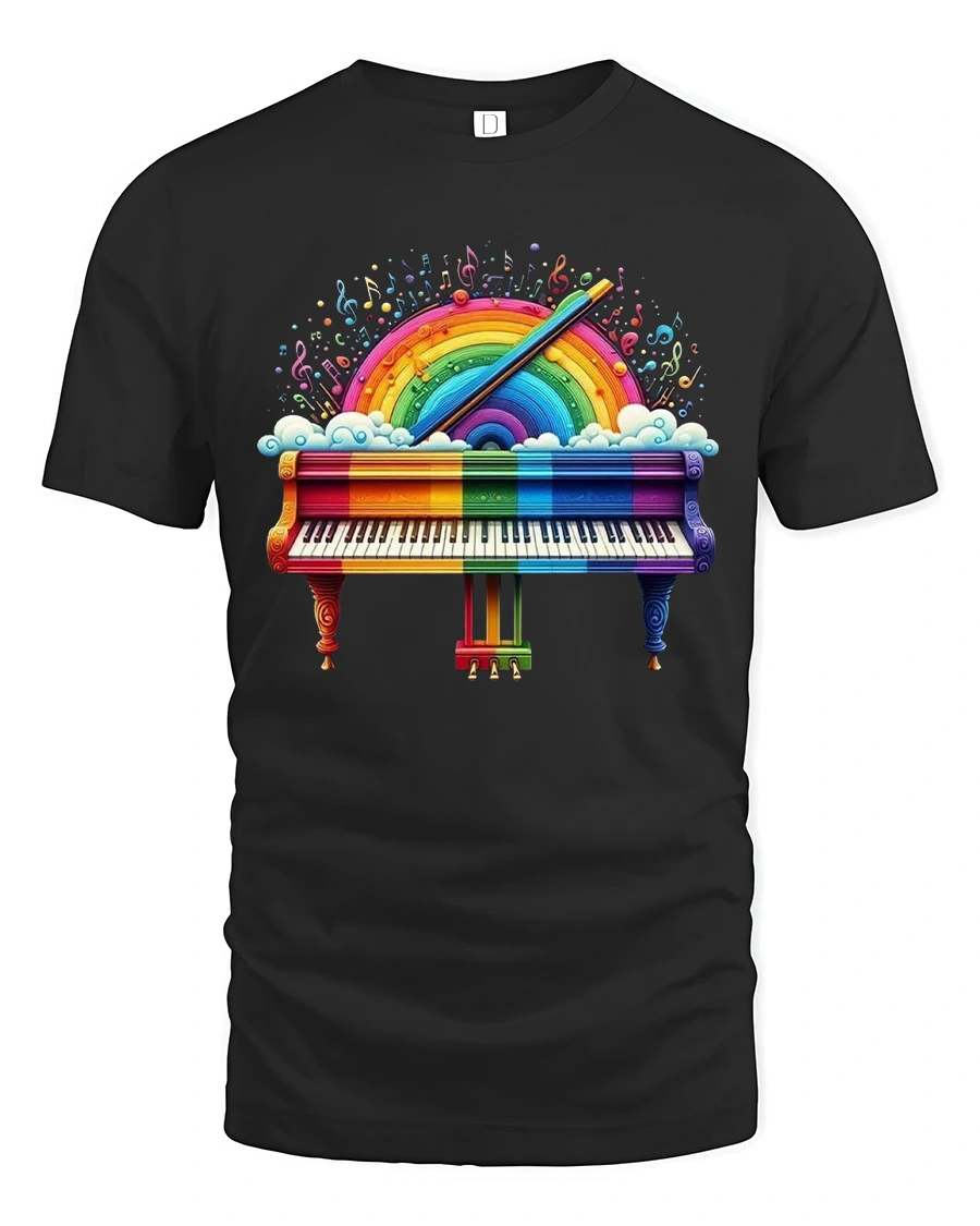 Rainbow Piano Magic Colorful Music Art Vibrant Graphic TShirt Tee brings a joyful burst of creativity with its bright and energetic musical design. The artwork features a beautifully detailed rainbow grand piano surrounded by whimsical clouds, glowing music notes, and a radiant rainbow backdrop. Its vivid colors and playful composition create a sense of movement and happiness that appeals to anyone who loves expressive and artistic designs.
