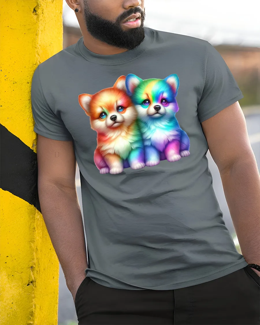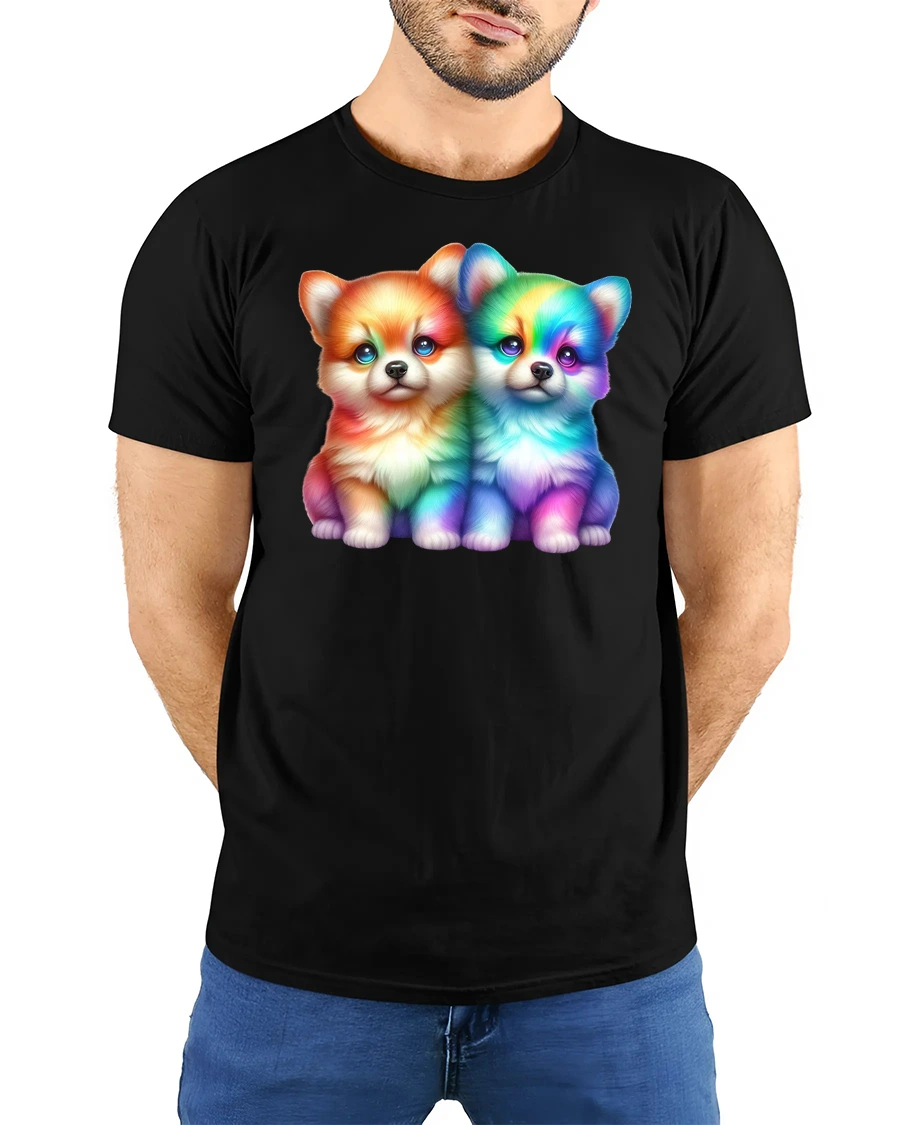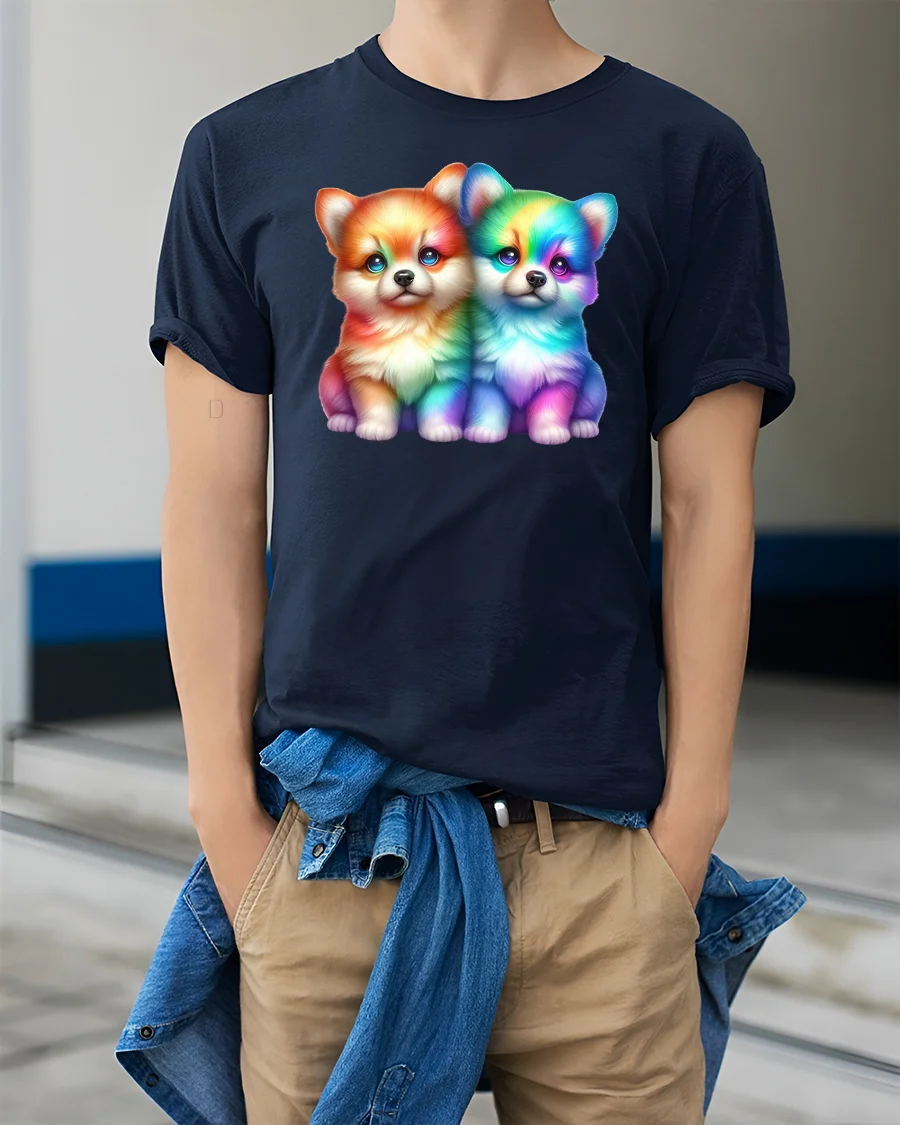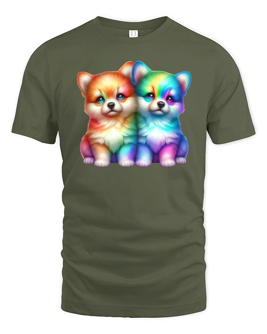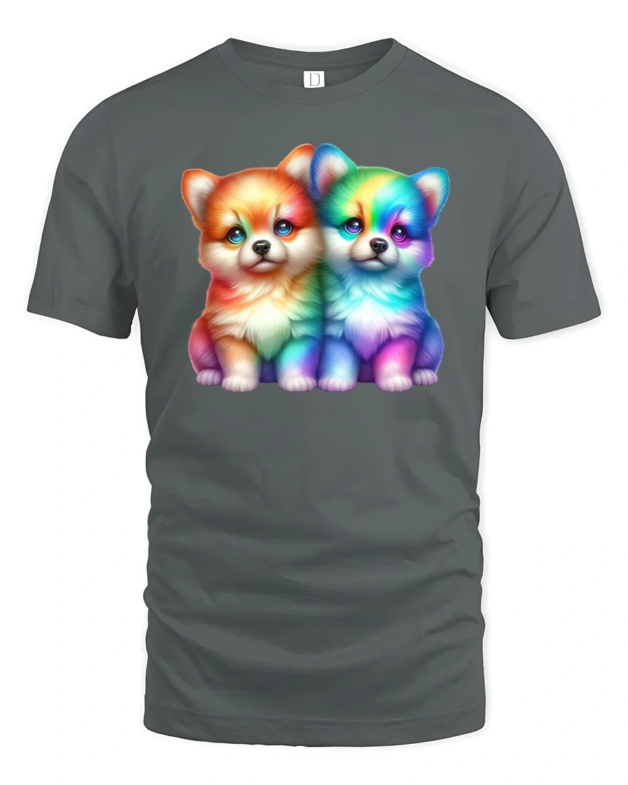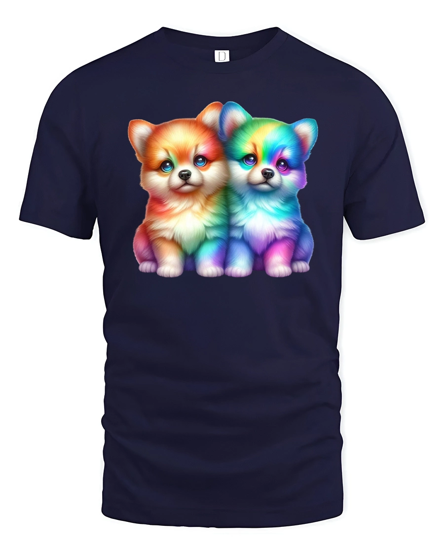 Brighten your wardrobe with the Rainbow Puppies Cute Tee with Colorful Dog Artwork. This shirt features two adorable puppies in a vibrant rainbow design, making it the perfect statement piece for dog lovers. The playful, eye-catching artwork captures the charm and innocence of puppies while adding a fun splash of color to your outfit.