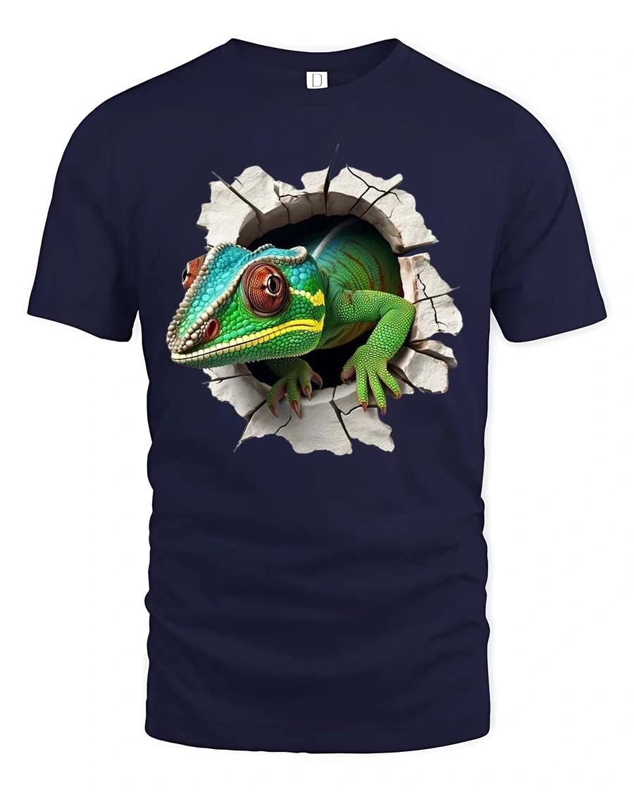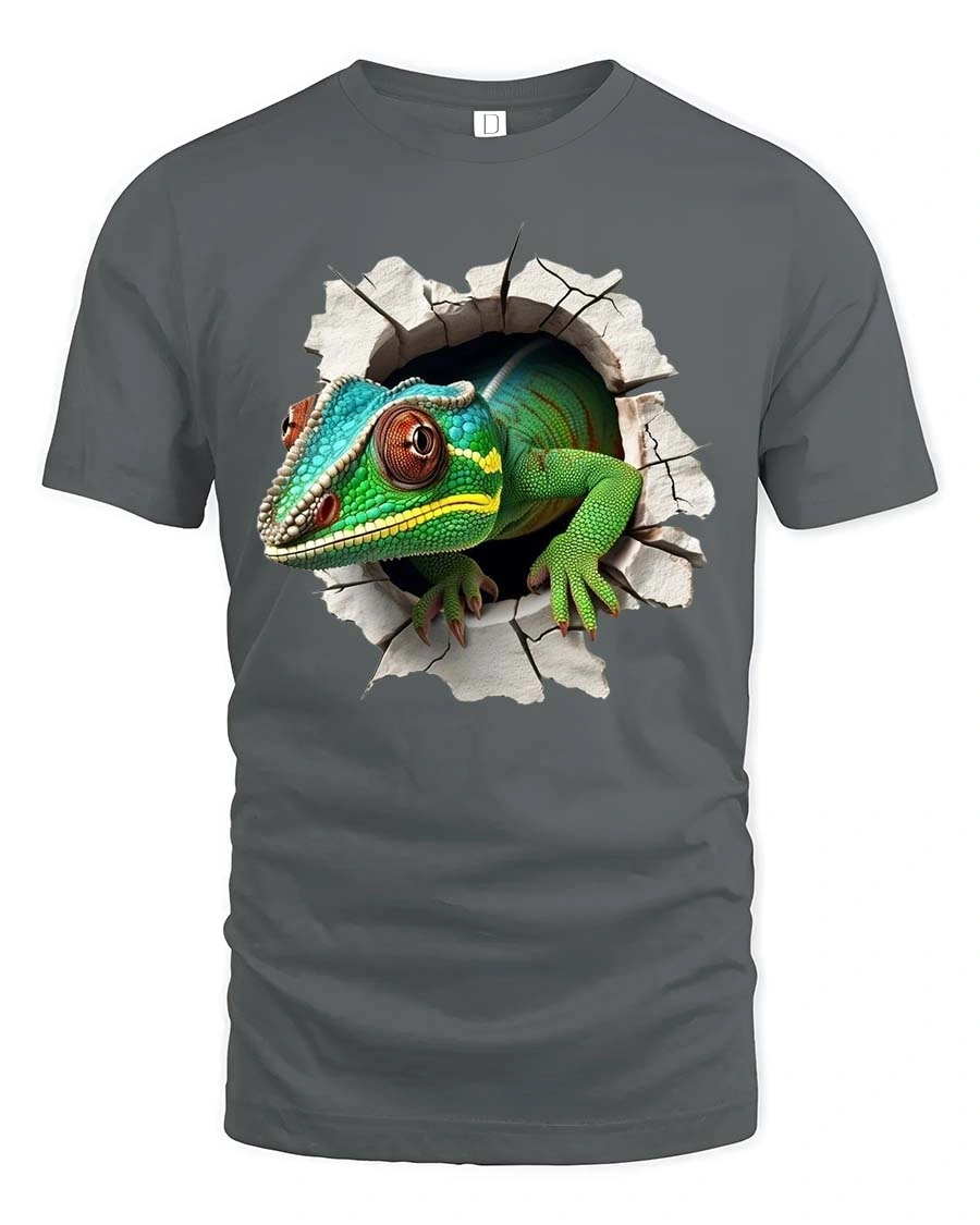 The imaginative wall breaking effect combined with the colorful gecko creates a memorable design that adds character and adventurous style to everyday fashion.