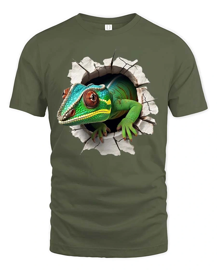 Realistic Gecko Breaking Wall Funny Lizard Graphic Tshirt features a bold and eye catching design that creates the illusion of a curious gecko bursting through a cracked wall.