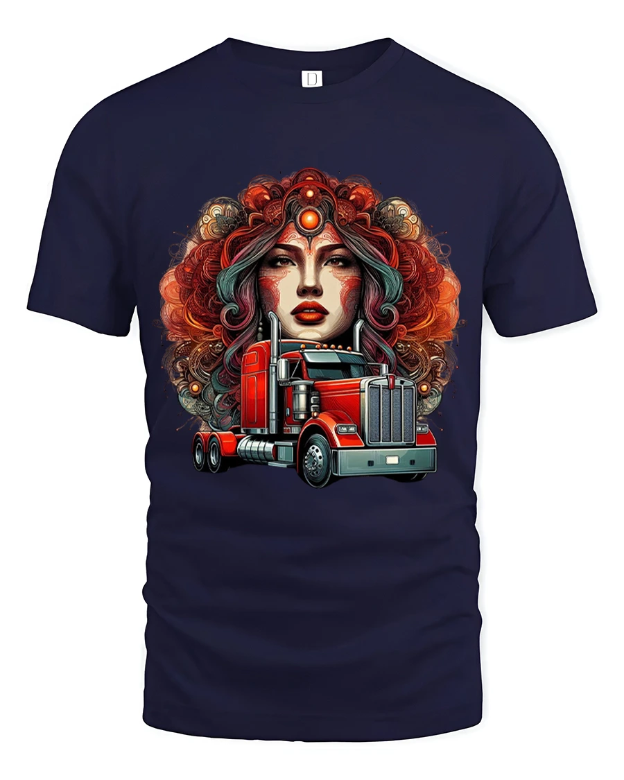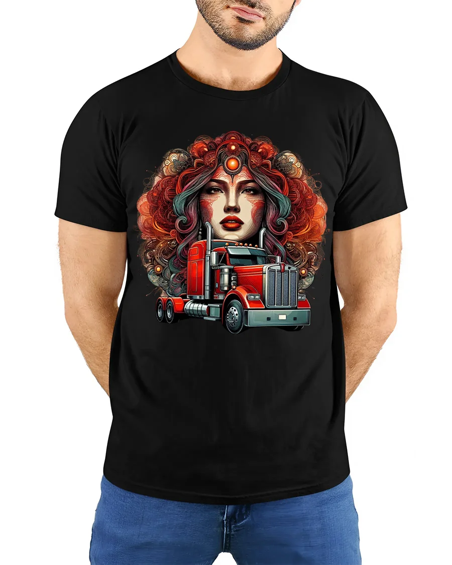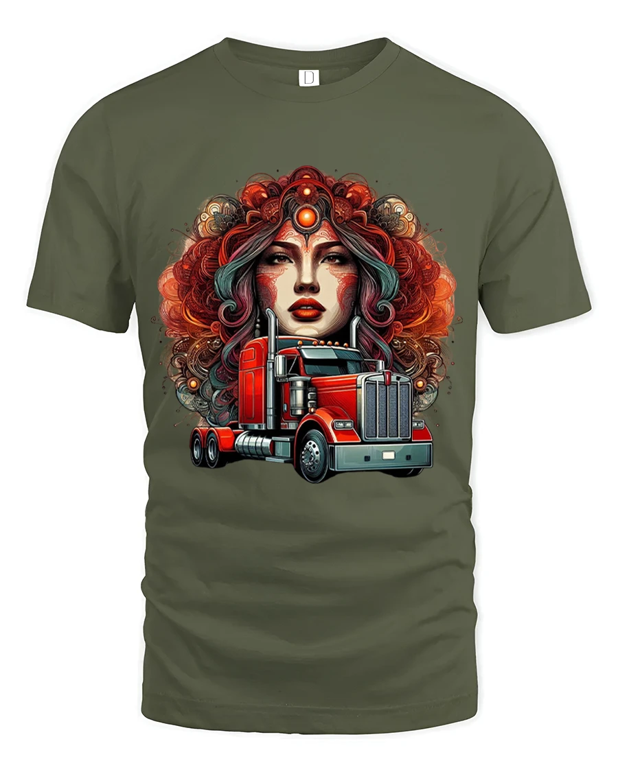 Red Semi Truck Goddess Graphic T Shirt Bold Trucker Art blends strength, beauty, and highway power into one unforgettable design. Featuring a striking goddess portrait rising behind a detailed red semi truck, this artwork captures the spirit of the open road with a dramatic and artistic twist. The rich colors and intricate details create a powerful visual statement that celebrates trucking culture with style and confidence.