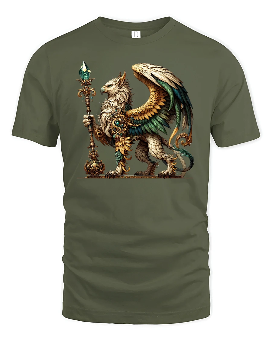 Regal Griffin Warrior Fantasy Staff Art Graphic Tee is a bold and majestic piece for lovers of mythology, fantasy art, and legendary creatures. Featuring a powerful griffin adorned in ornate golden armor and holding a magical staff topped with a glowing gem, this t-shirt embodies strength, wisdom, and mystical energy. It’s the perfect statement piece for fantasy fans, gamers, and collectors of mythical art.