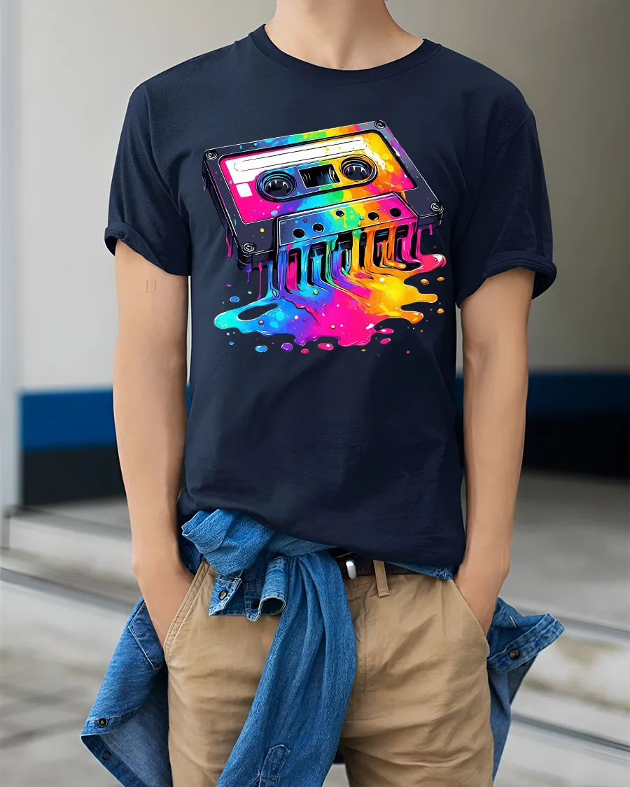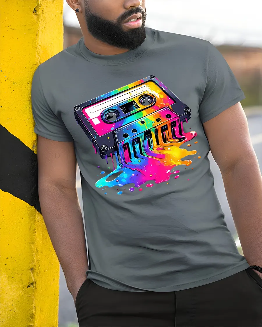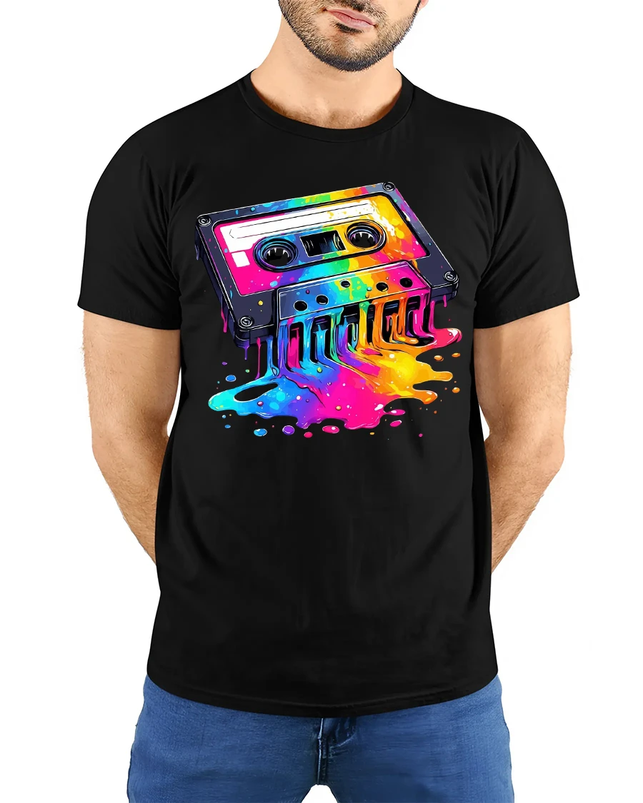The Retro Color Splash Cassette Music Art Graphic Tee Shirt celebrates classic music culture with a bold modern artistic twist.
