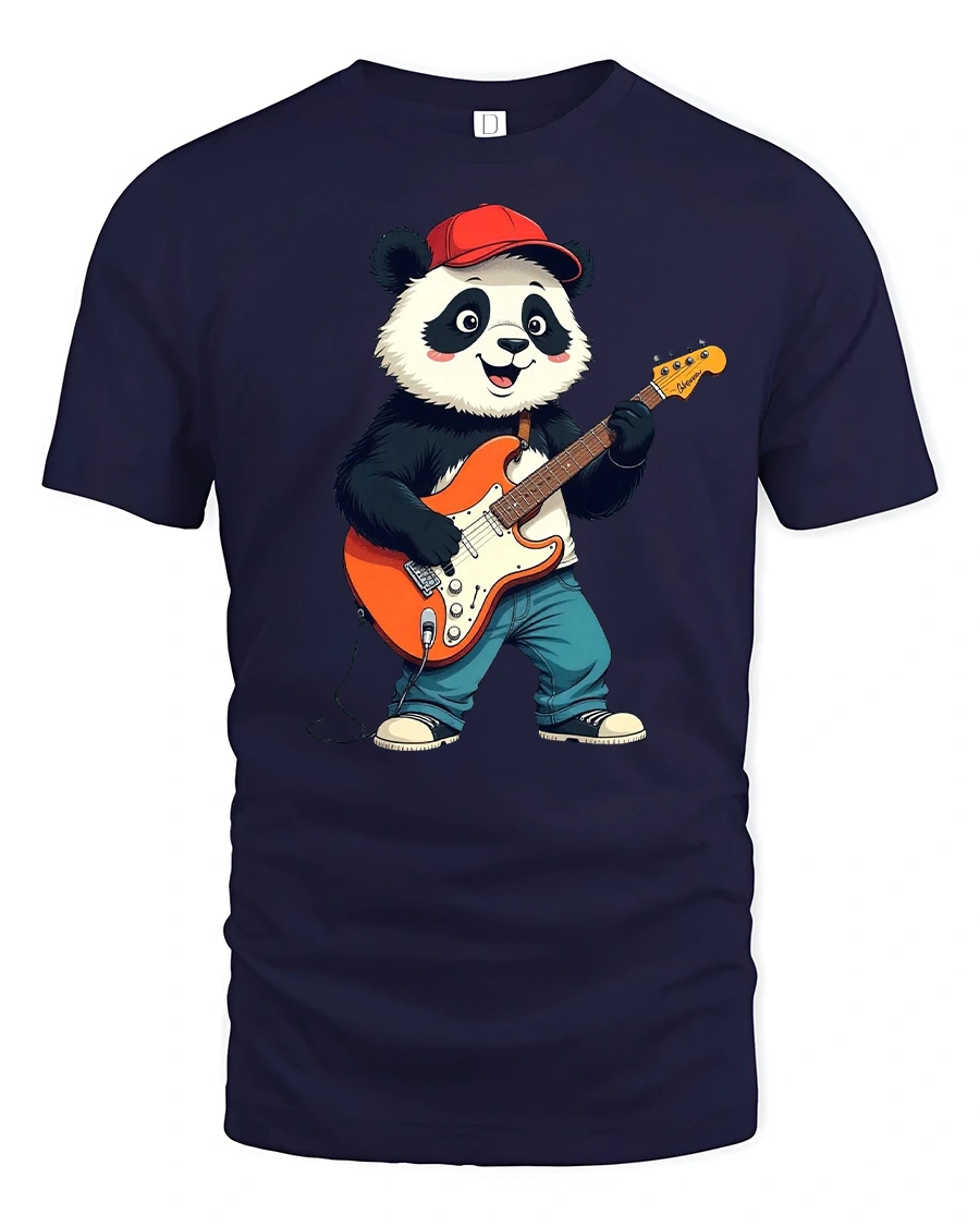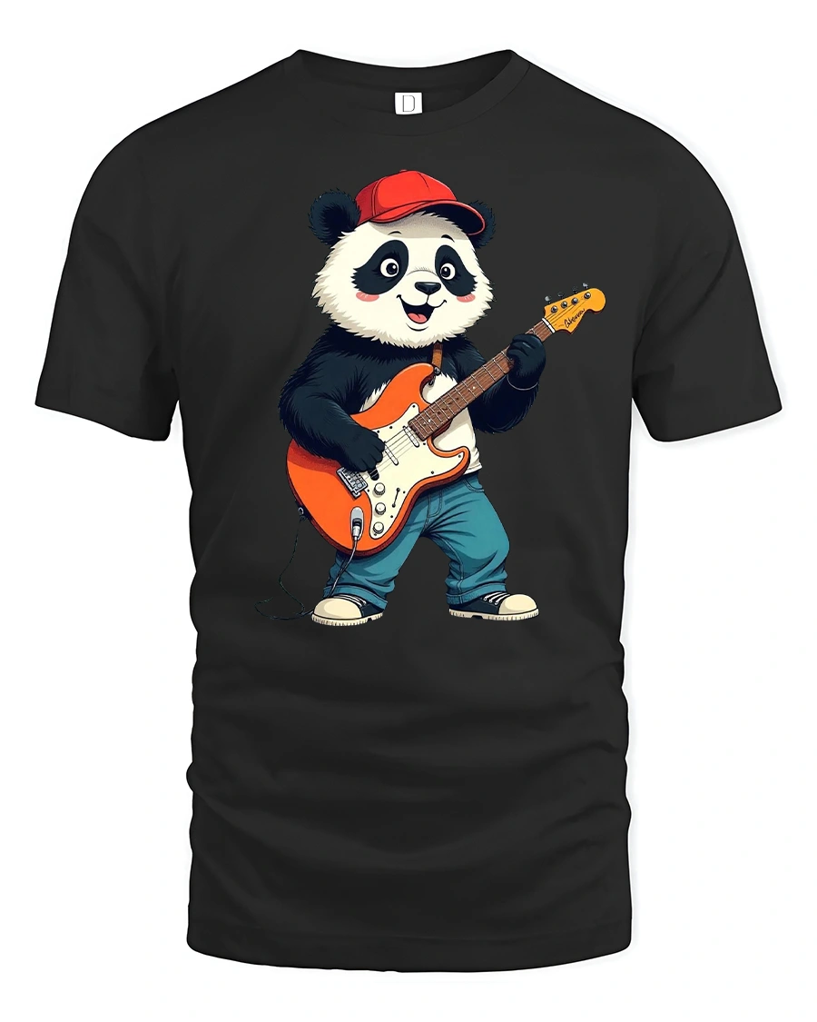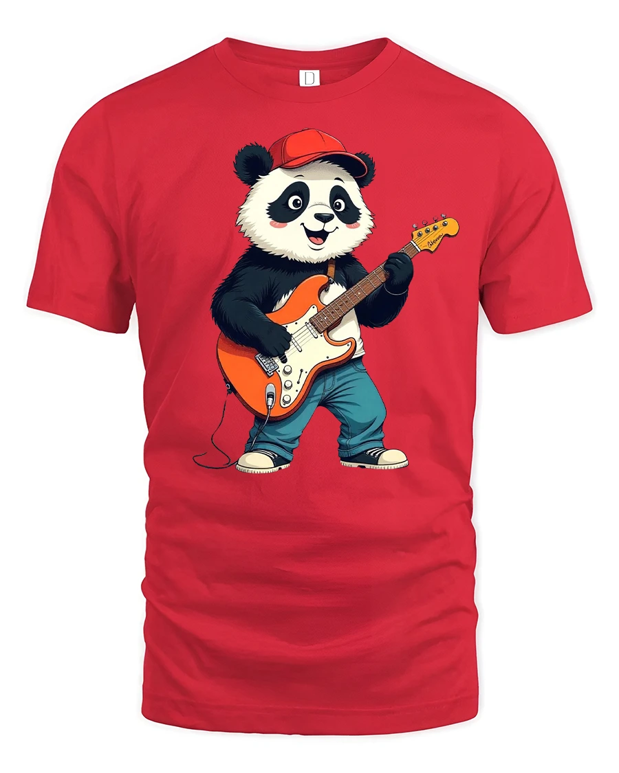 This eye-catching design features a happy panda wearing a red cap and holding an electric guitar, ready to rock the stage.