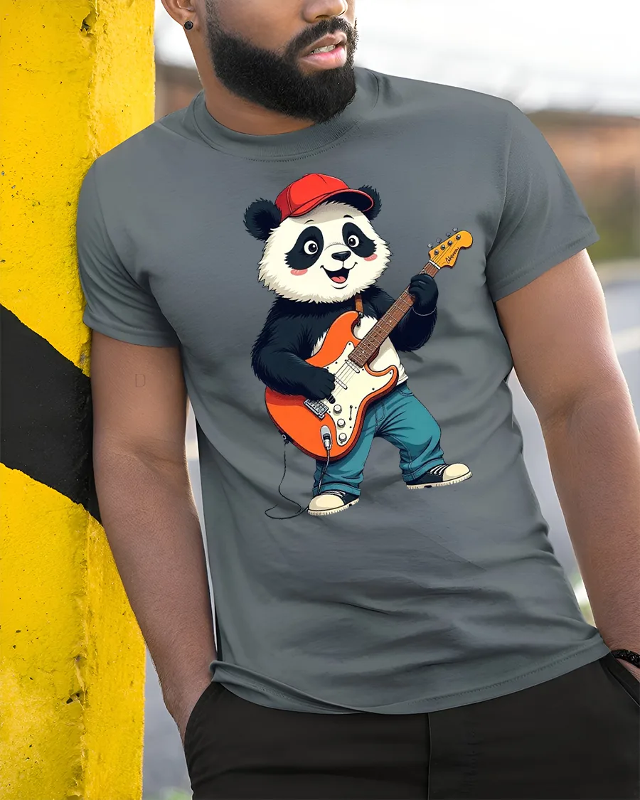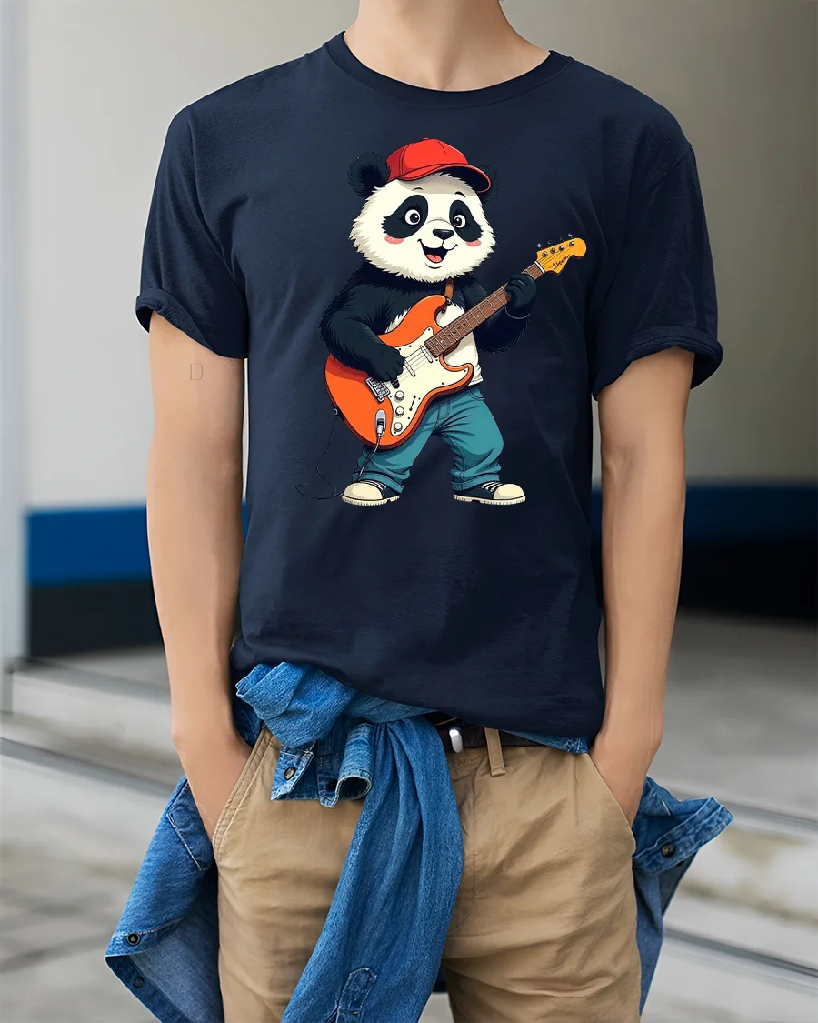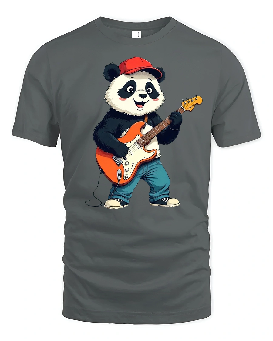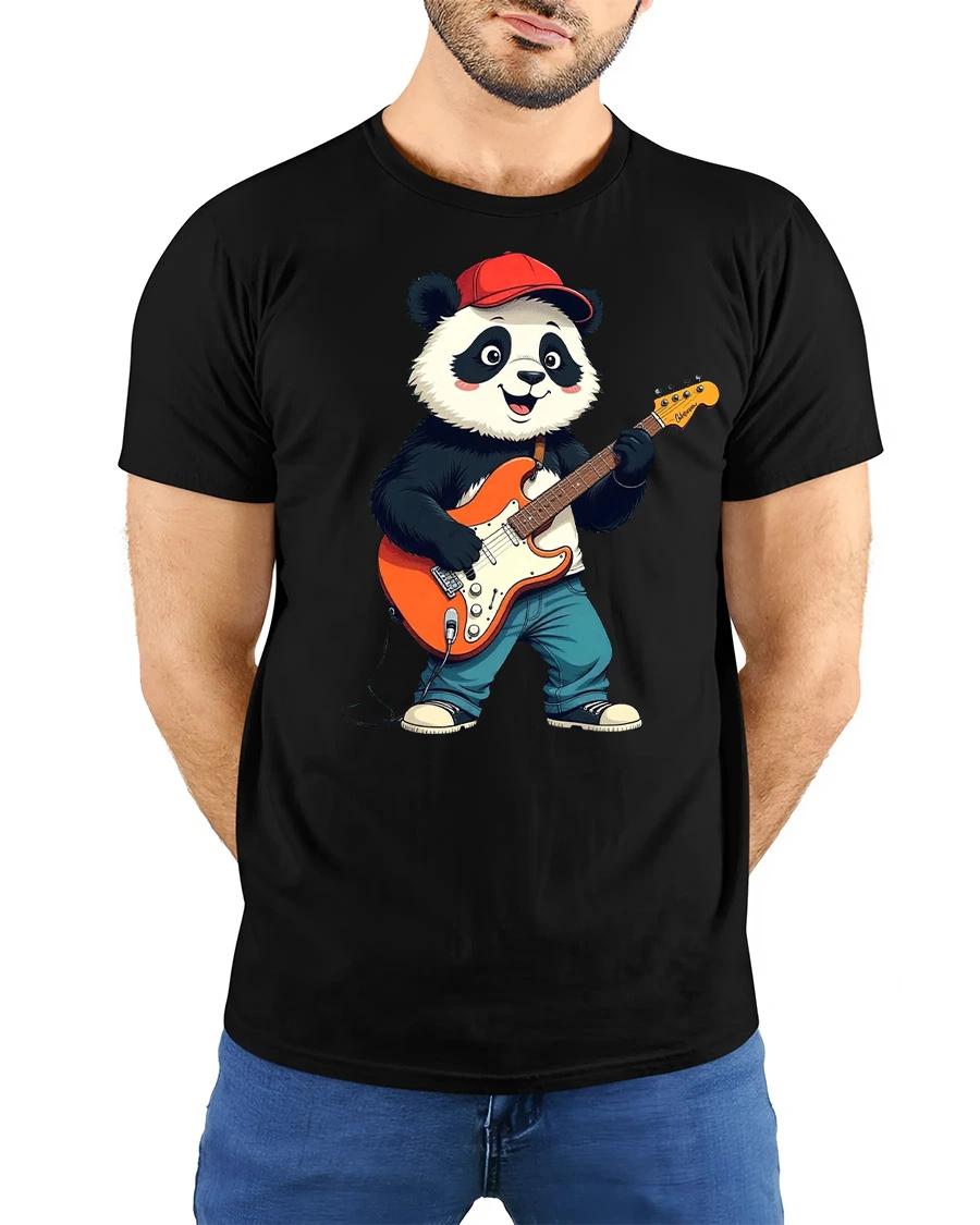 This eye-catching design features a happy panda wearing a red cap and holding an electric guitar, ready to rock the stage.
