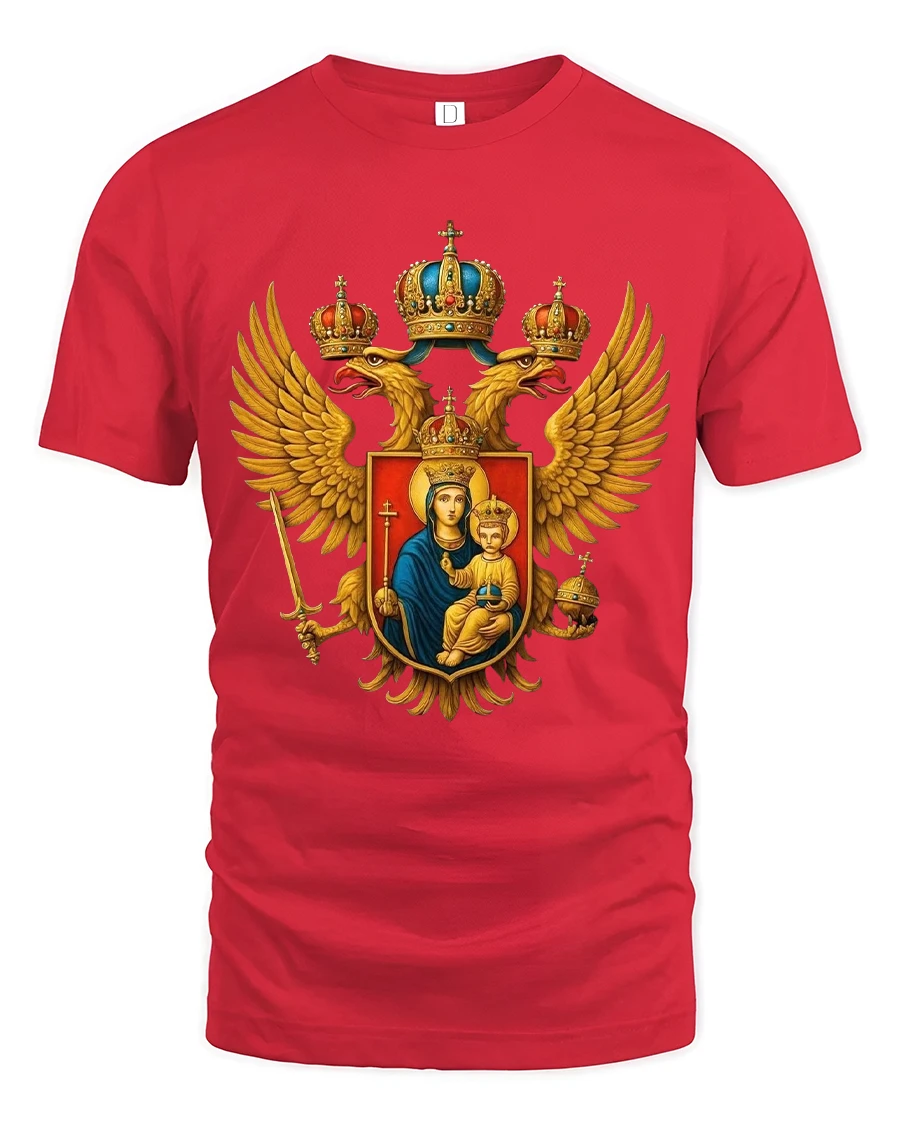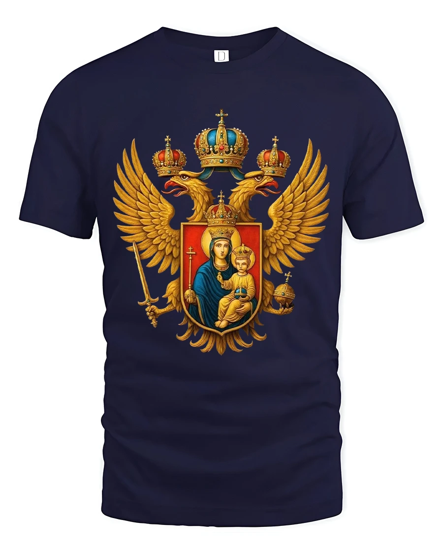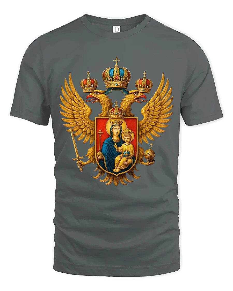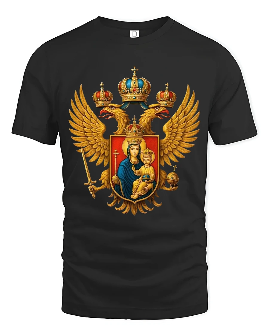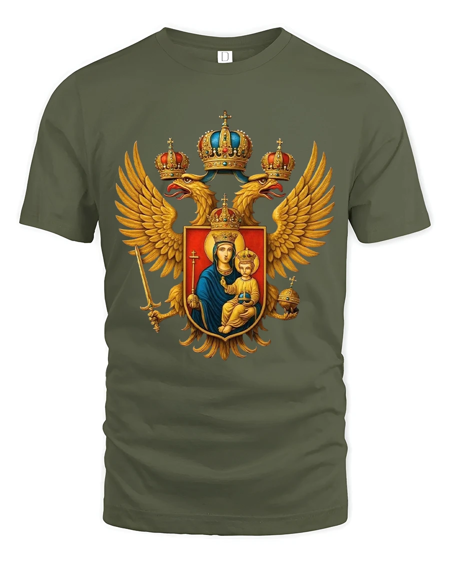 The Royal Double Eagle Madonna Icon Byzantine Style Graphic T Shirt presents a powerful fusion of sacred symbolism and imperial artistry.