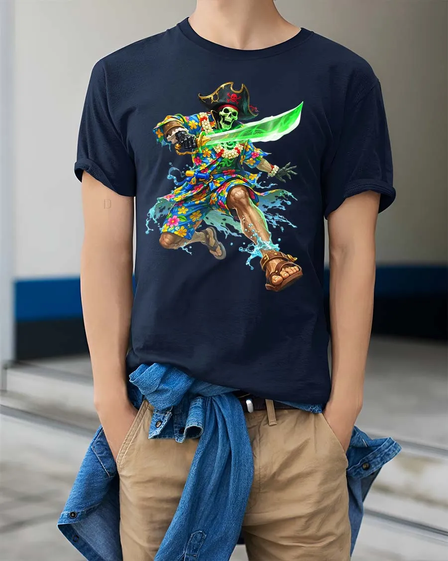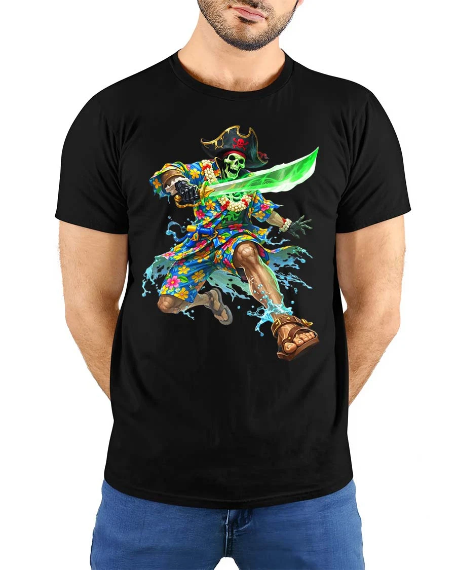 The design features a dynamic skeleton pirate in colorful beach wear swinging a glowing sword with water splashes around.