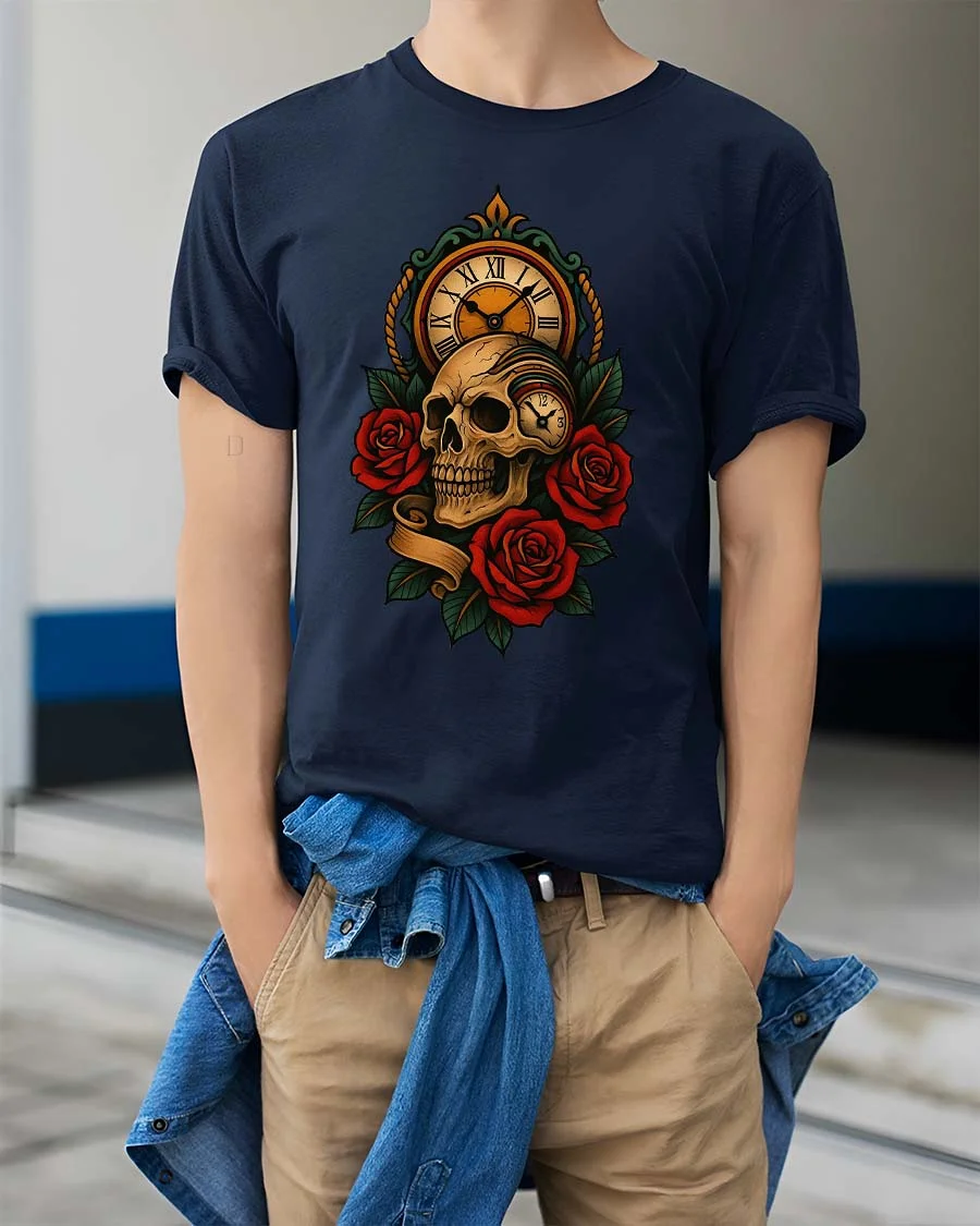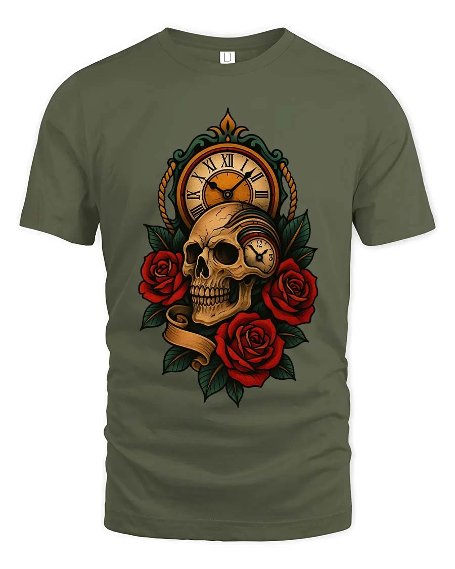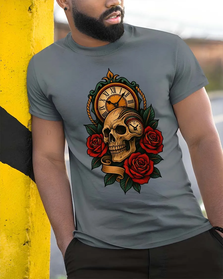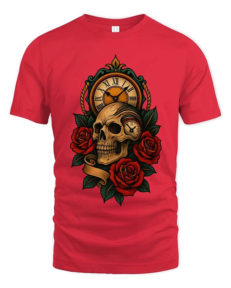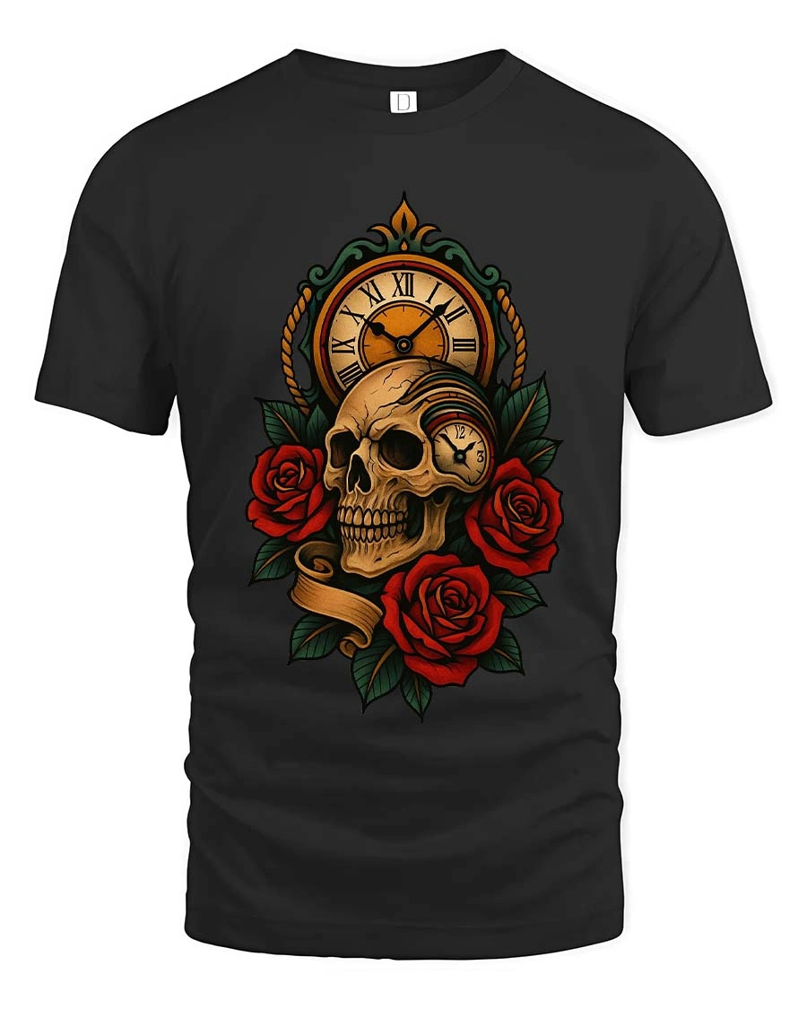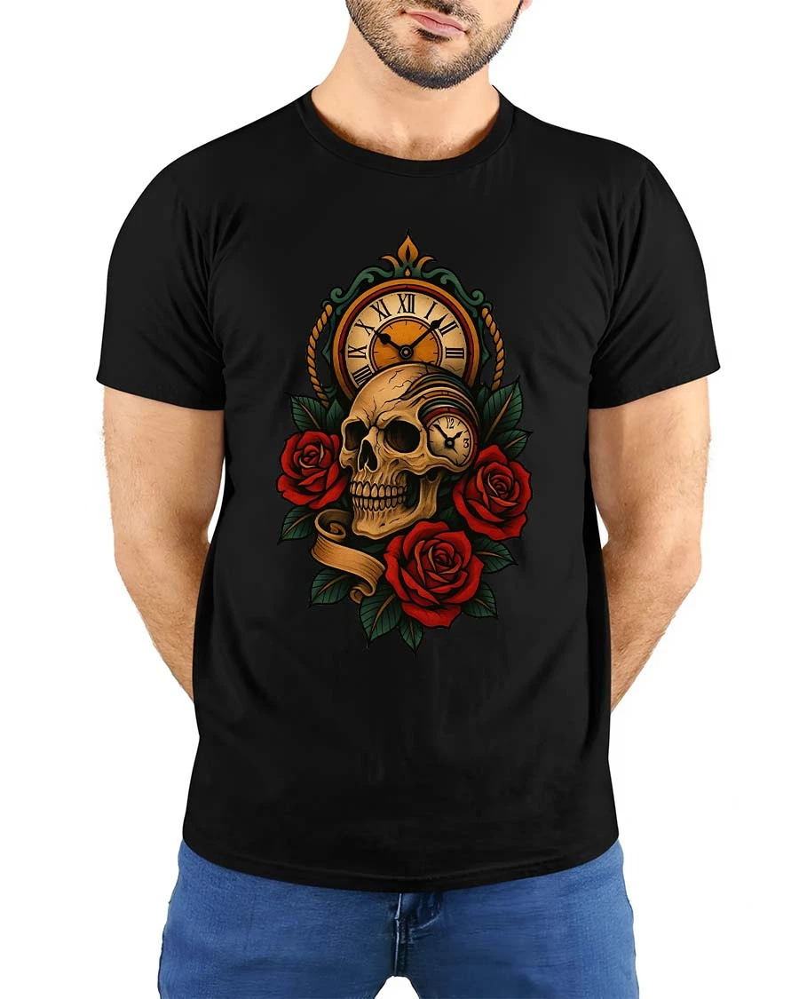 The design features a detailed skull paired with a vintage clock and deep red roses, representing the timeless connection between life, beauty, and the passage of time.