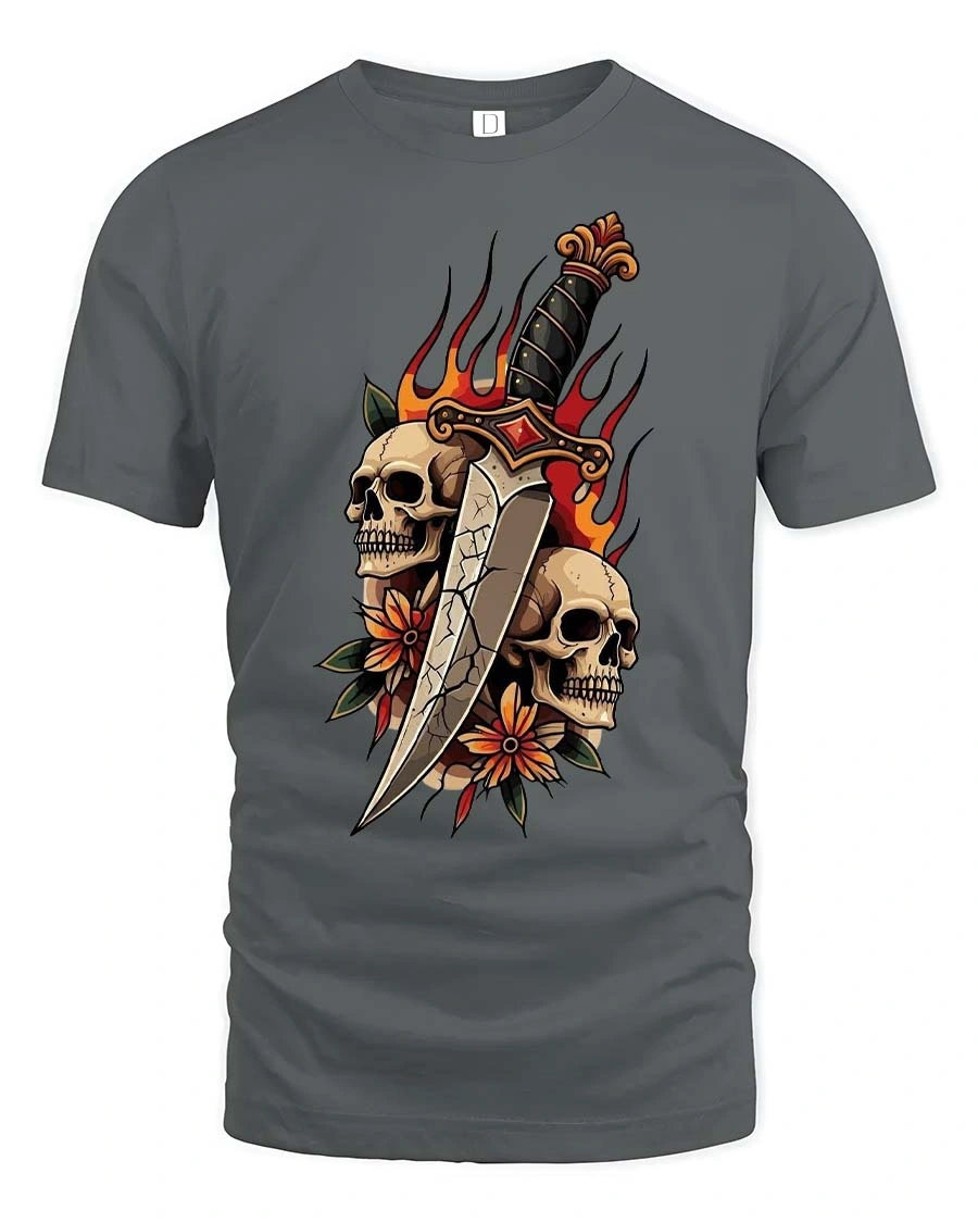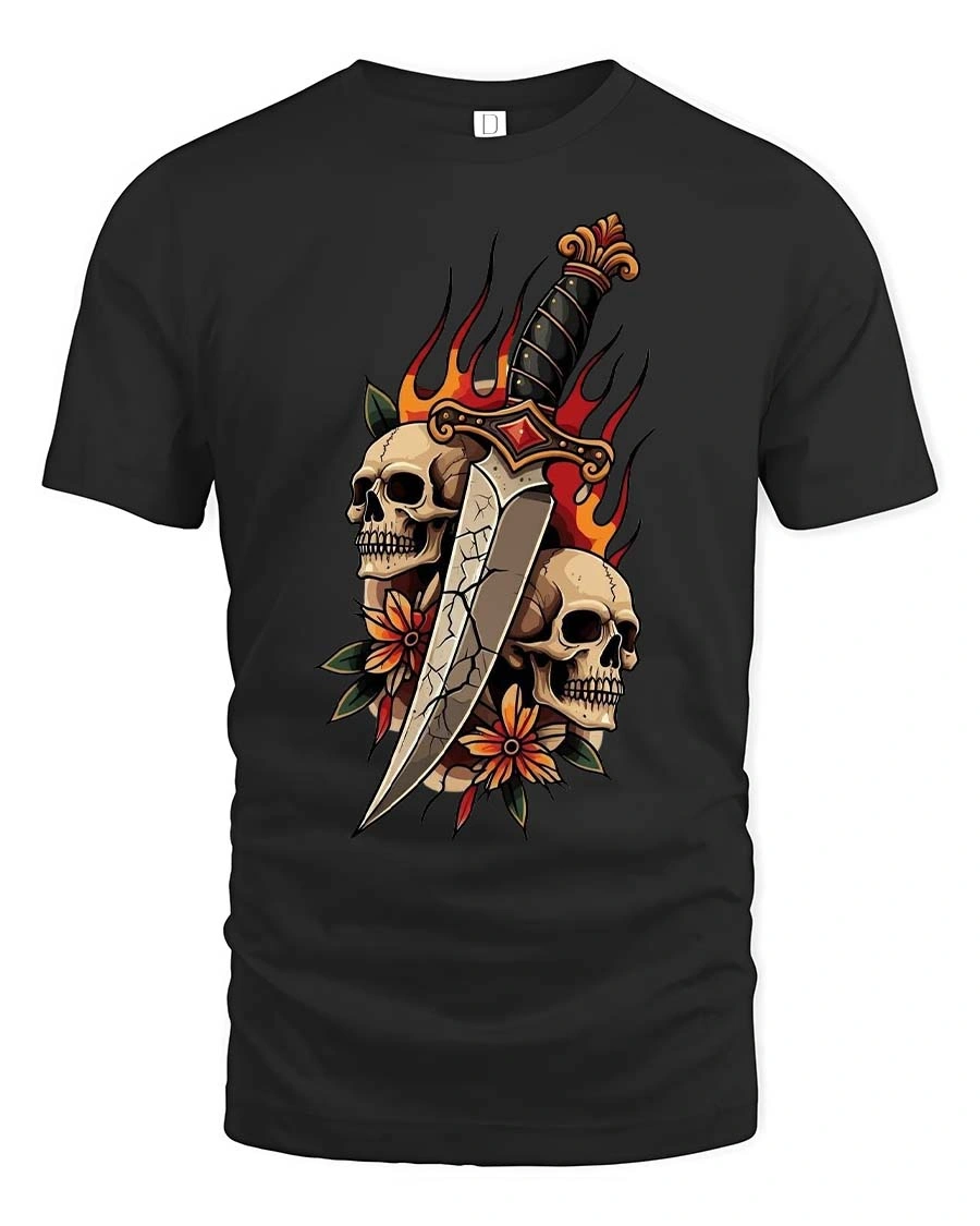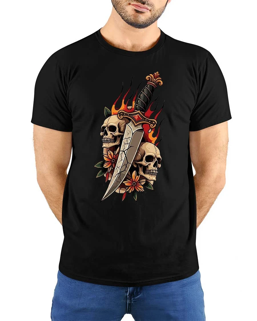 Featuring a detailed dagger surrounded by skulls, flames, and floral accents, this graphic tee captures a bold and edgy aesthetic with a timeless artistic feel.