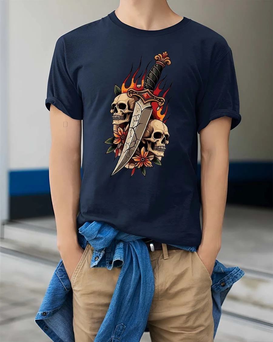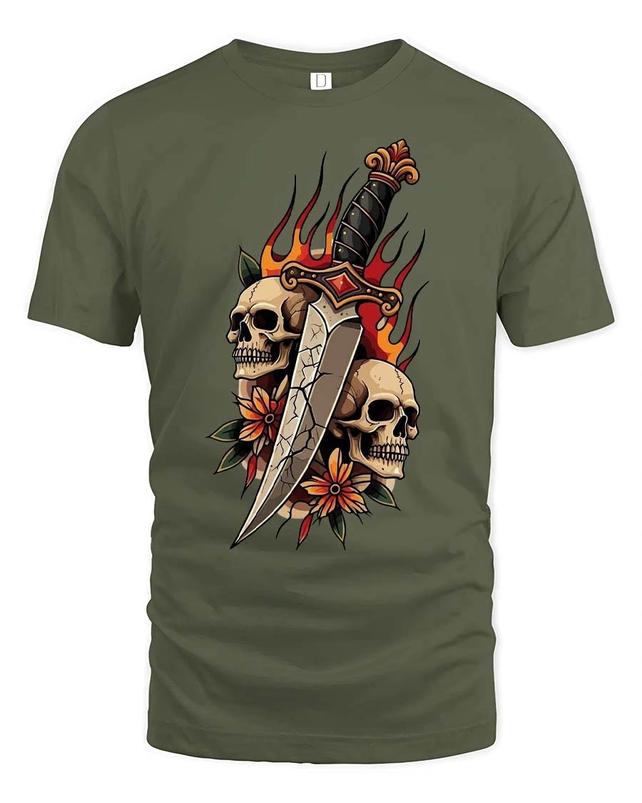 Skull Dagger Flame Graphic T Shirt Tattoo Style Bold Design