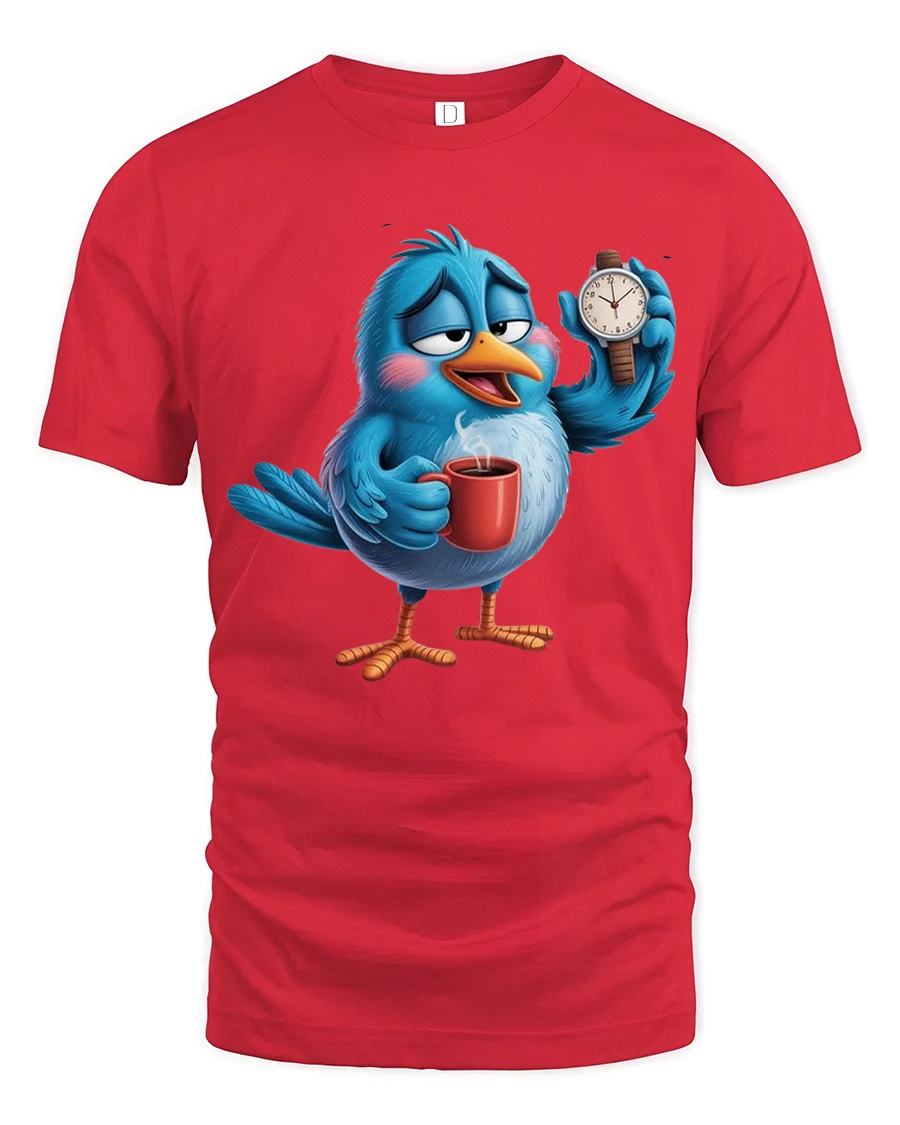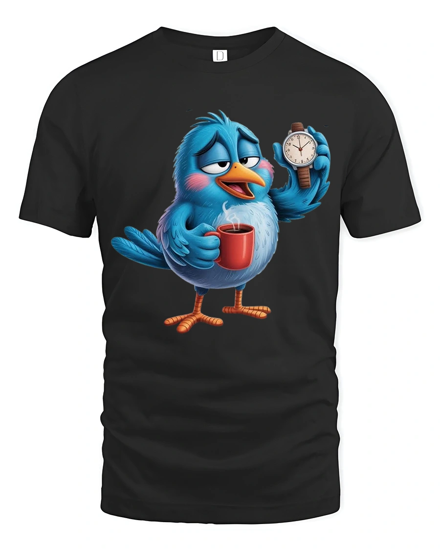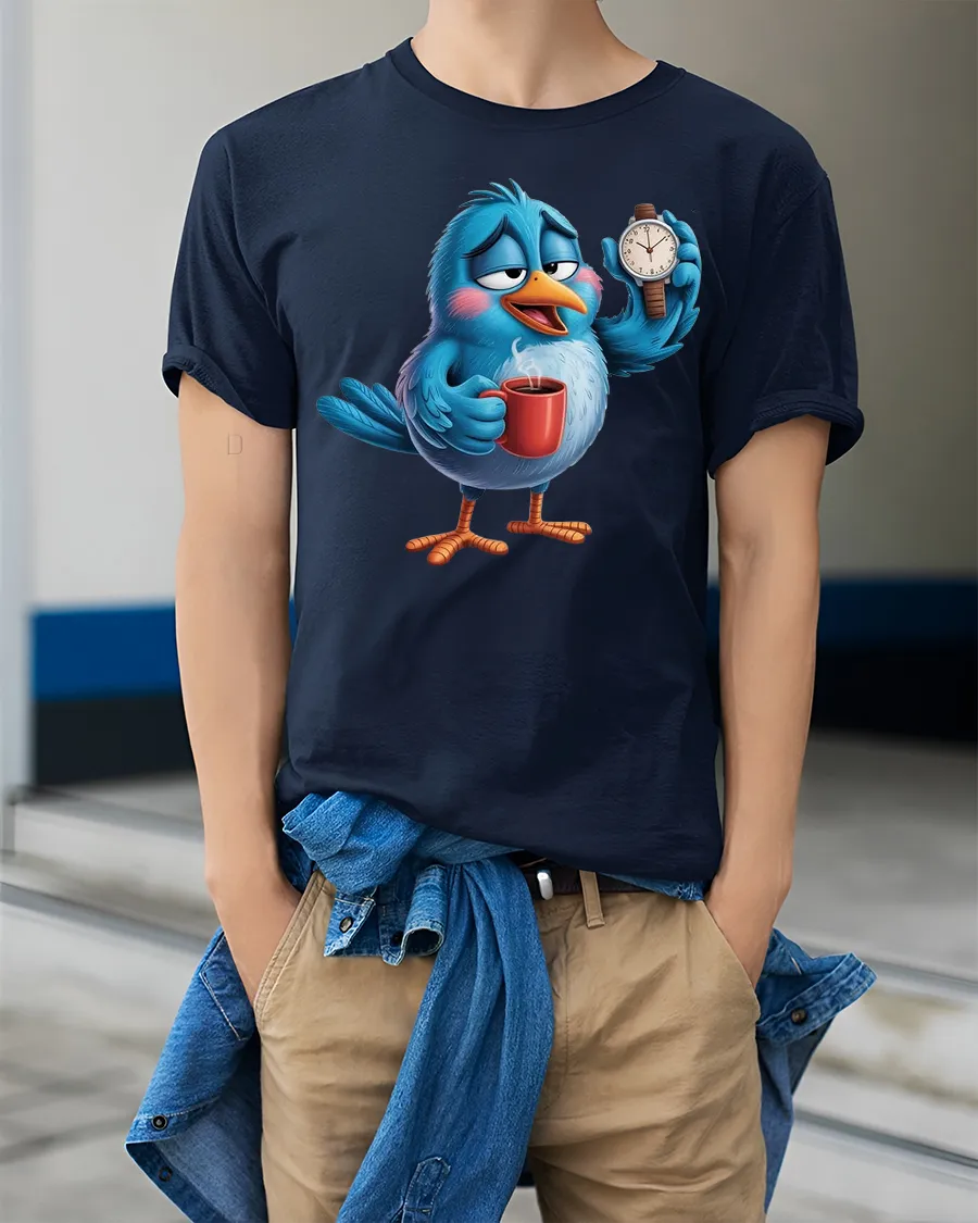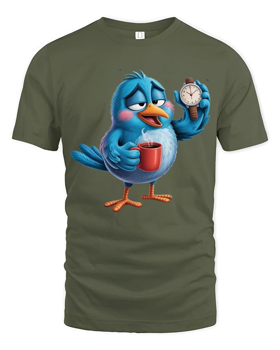 Sleepy Coffee Bird Morning Humor Cartoon Graphic Tshirt Tee captures the perfect slow morning mood in a playful cartoon design.