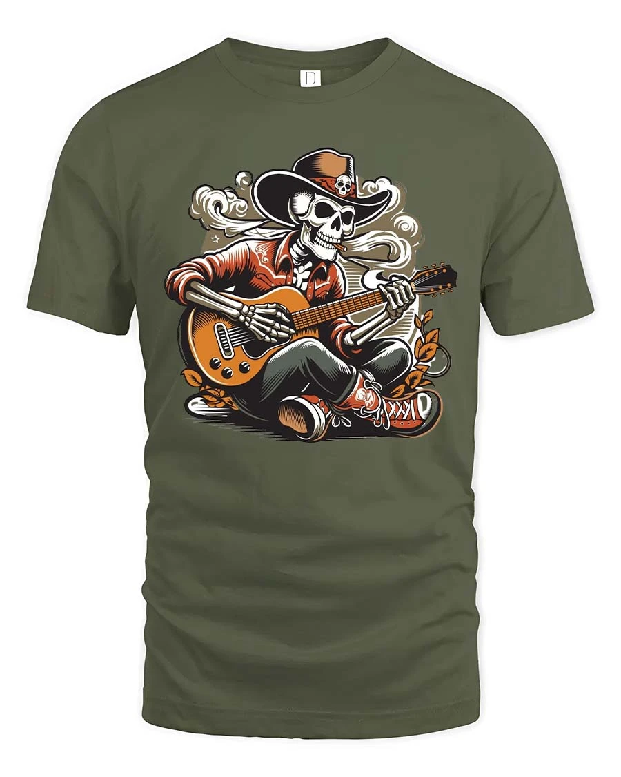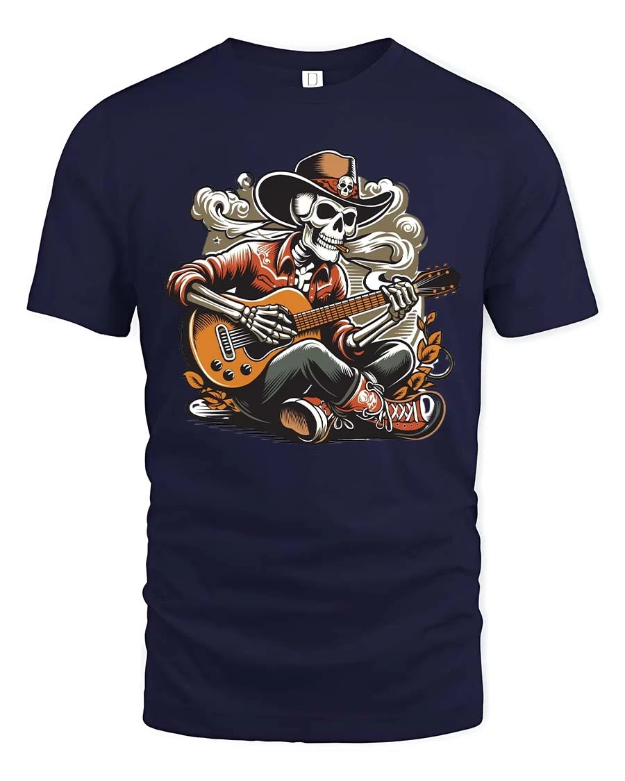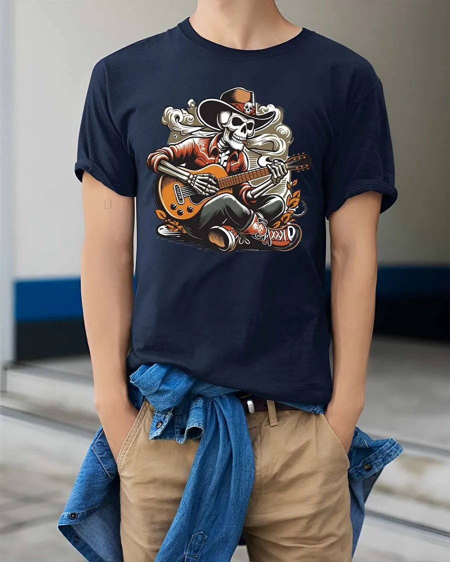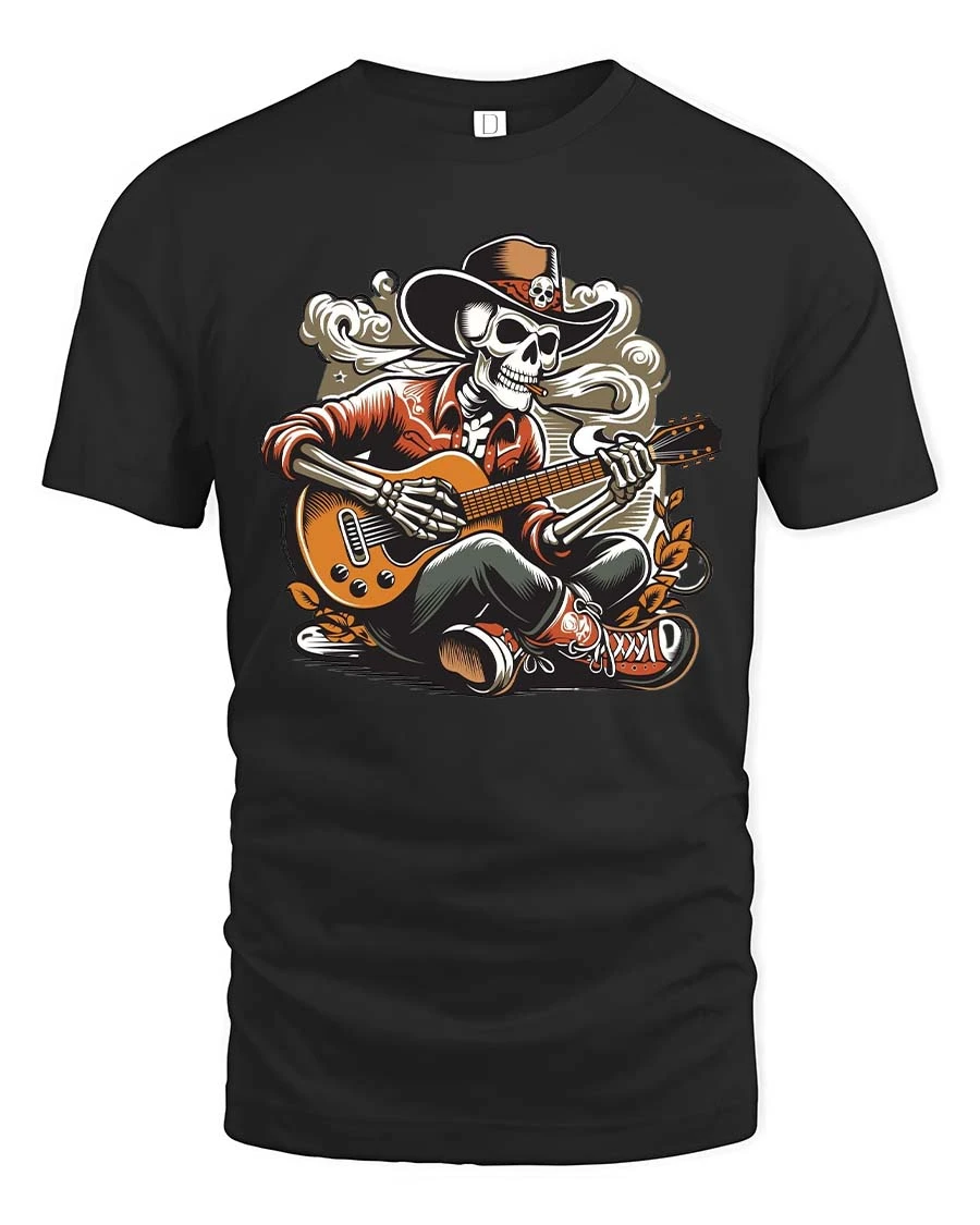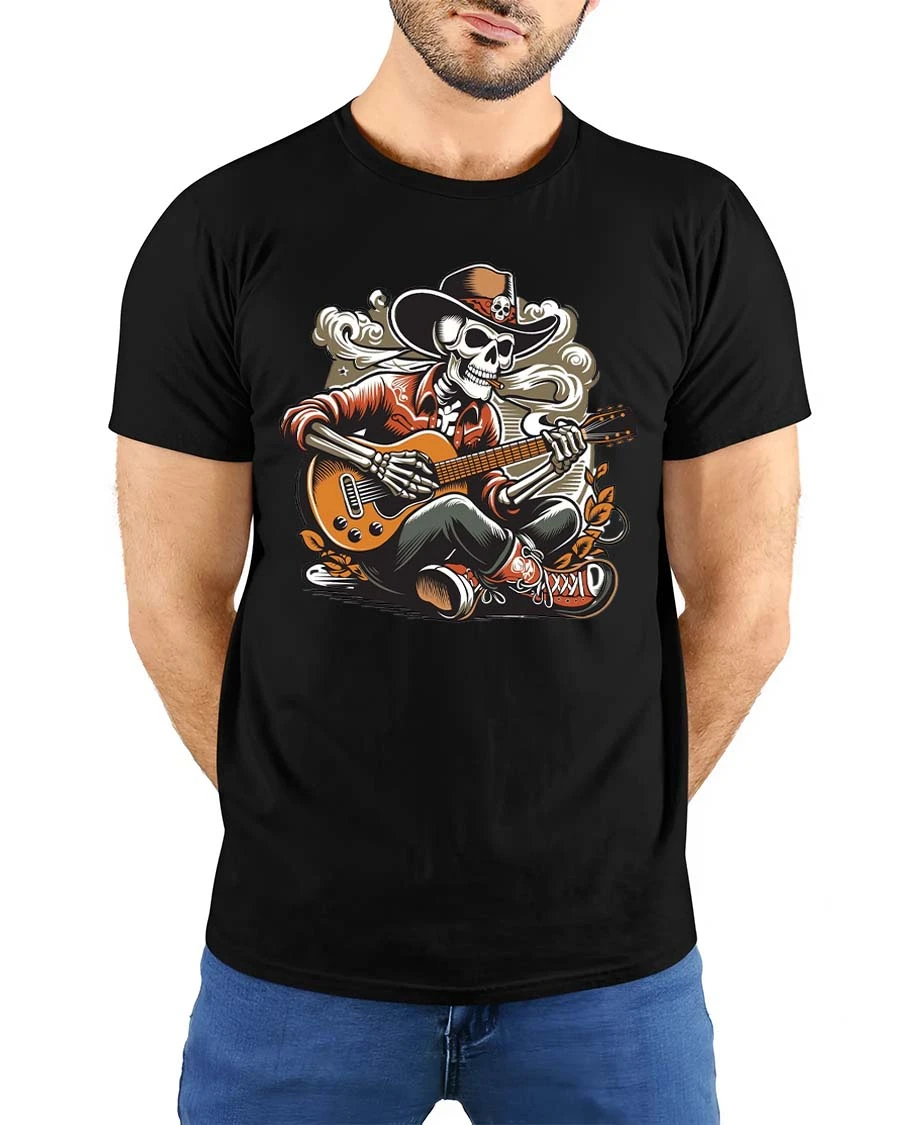The detailed illustration gives the shirt a retro concert poster feeling that stands out whether you wear it at a festival, casual hangout, music event, or weekend outing. The skeleton guitarist theme blends rock attitude with playful creativity, making the shirt a great conversation starter and a favorite piece in any graphic tee collection. The bold artwork works perfectly with everyday street style and adds a fun rebellious touch.