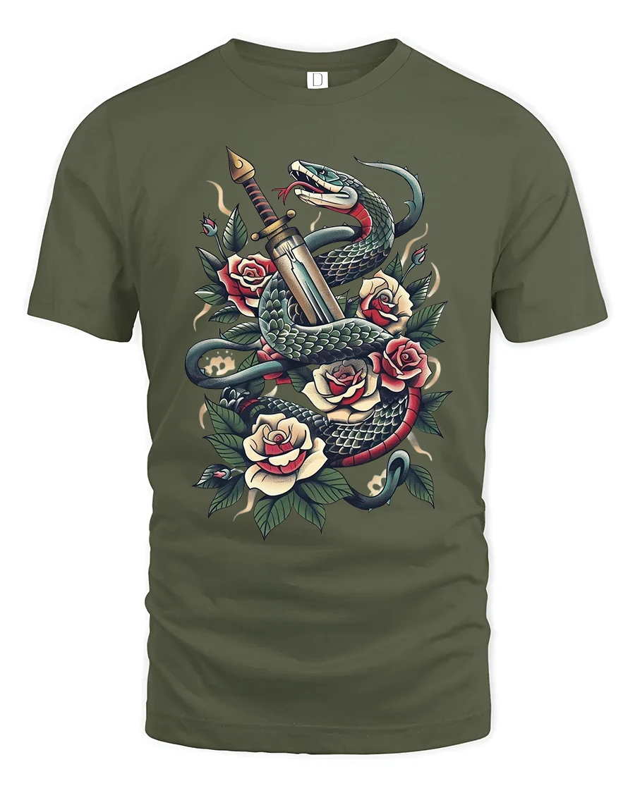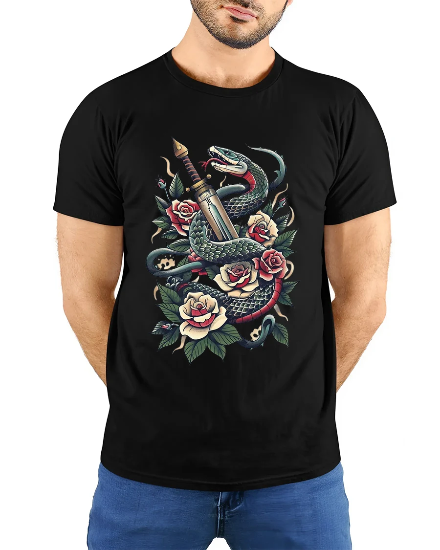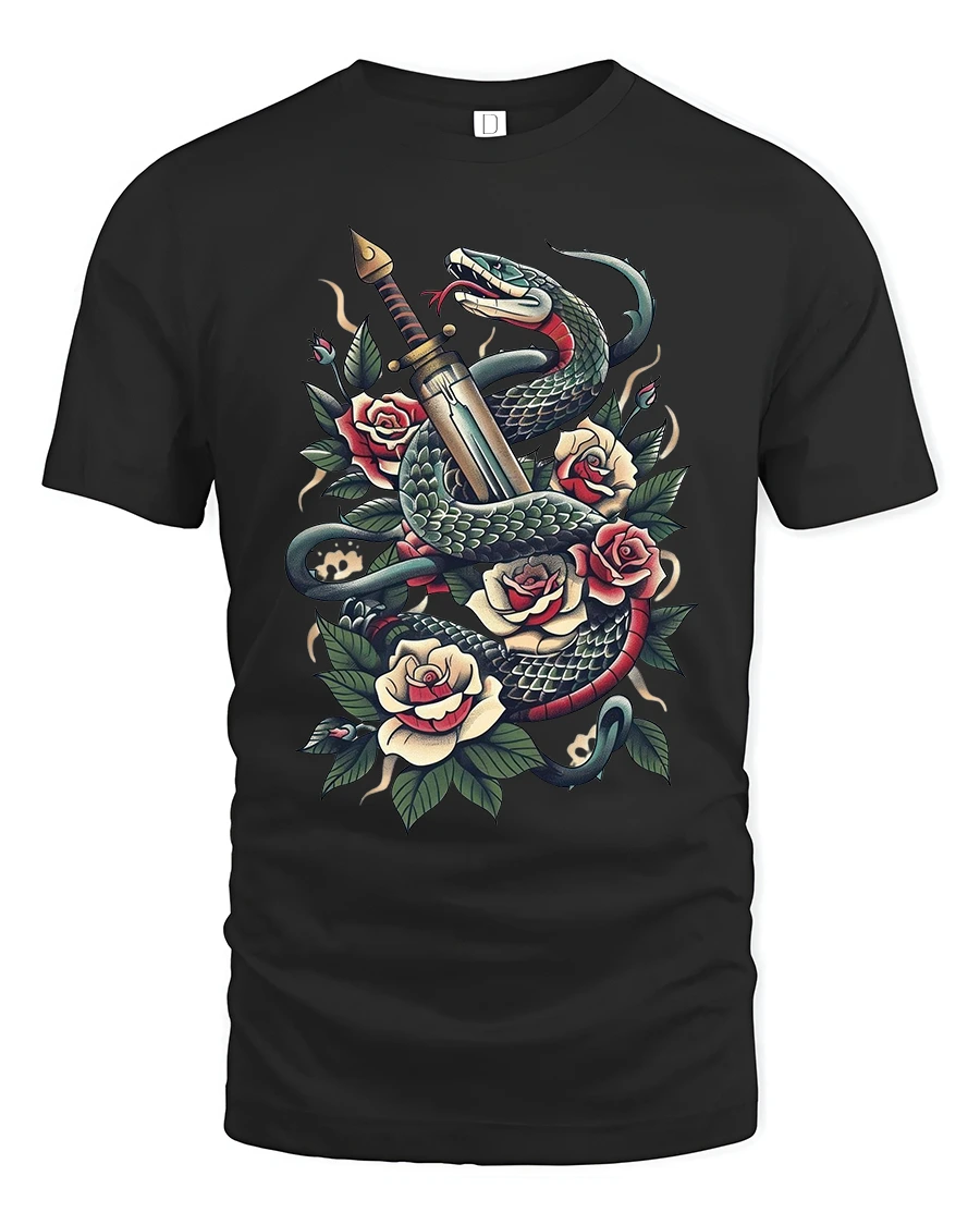 Snake And Dagger With Roses Classic Tattoo Art Graphic T Shirt brings timeless tattoo symbolism into a powerful wearable design.