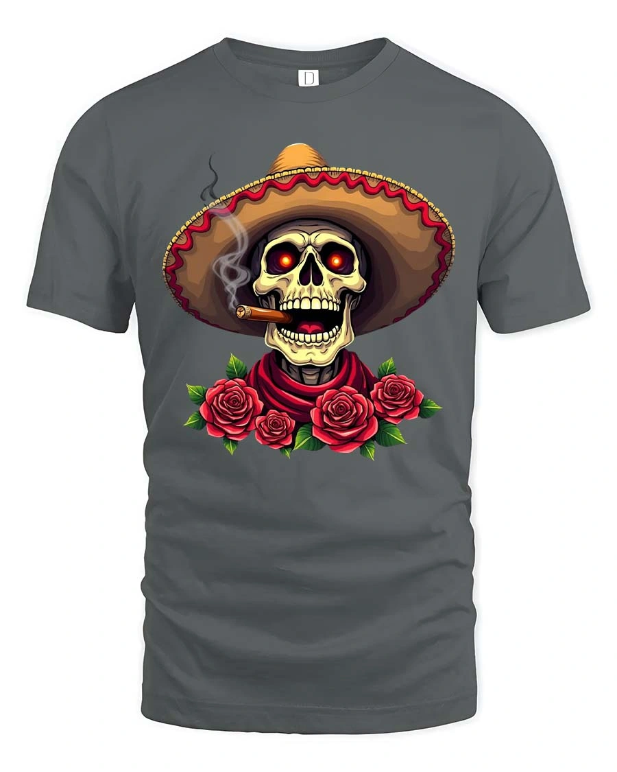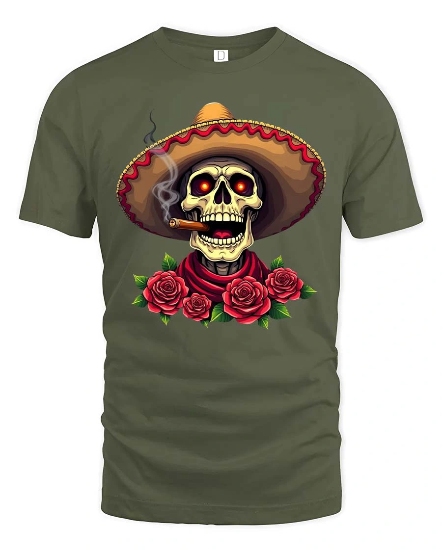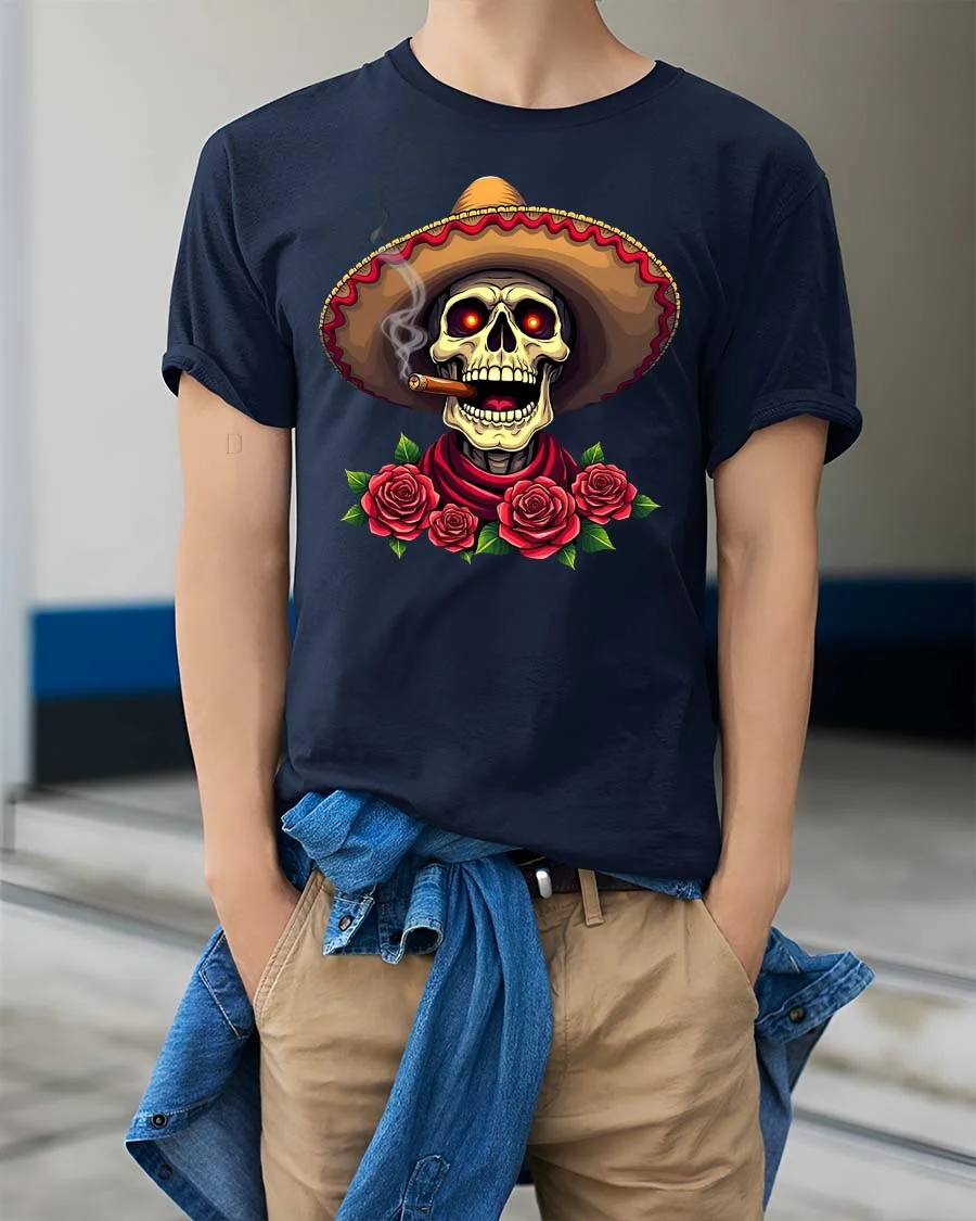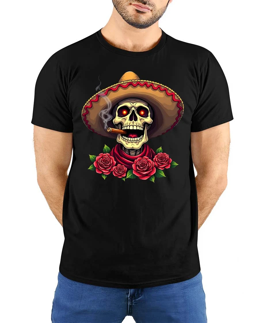 Sombrero Skull Rose Day Of The Dead Style tshirt features a striking illustration of a skull wearing a sombrero surrounded by detailed roses creating a bold festive artistic expression.