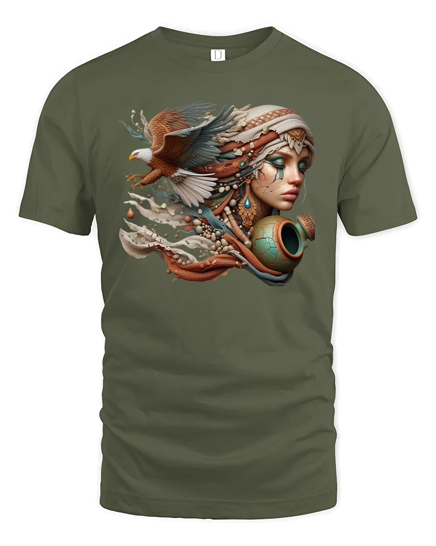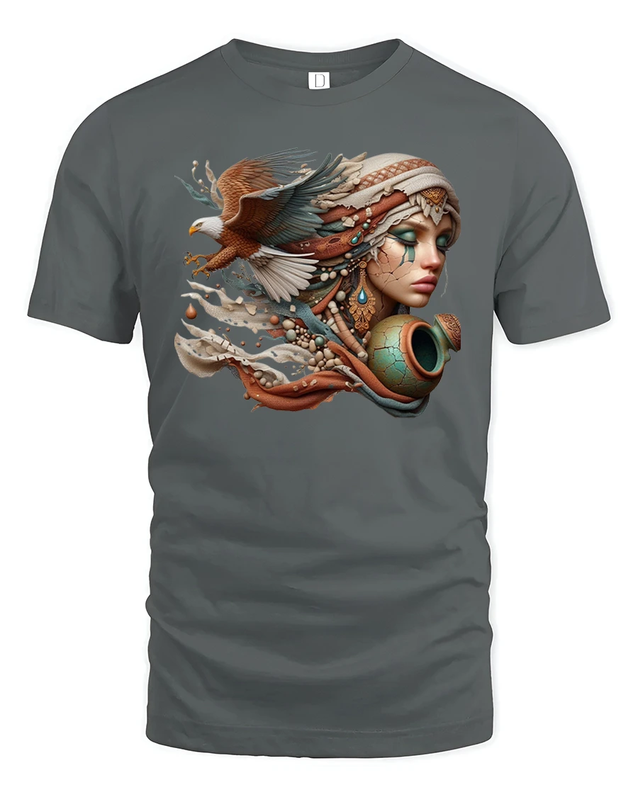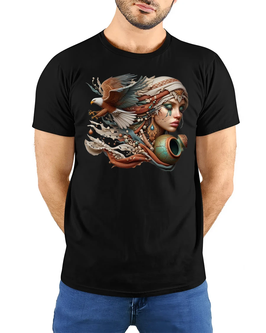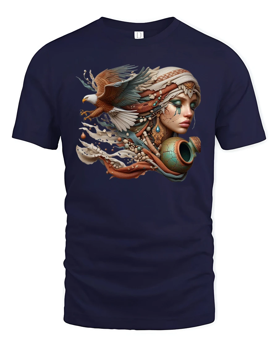 This stunning t-shirt features a breathtaking design of a woman adorned in tribal jewelry, blended with the majestic wings of an eagle in flight.
