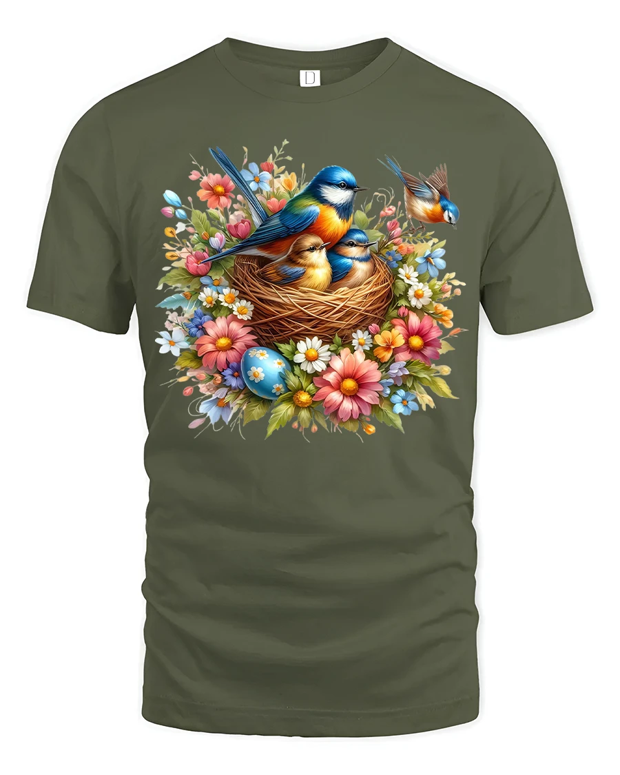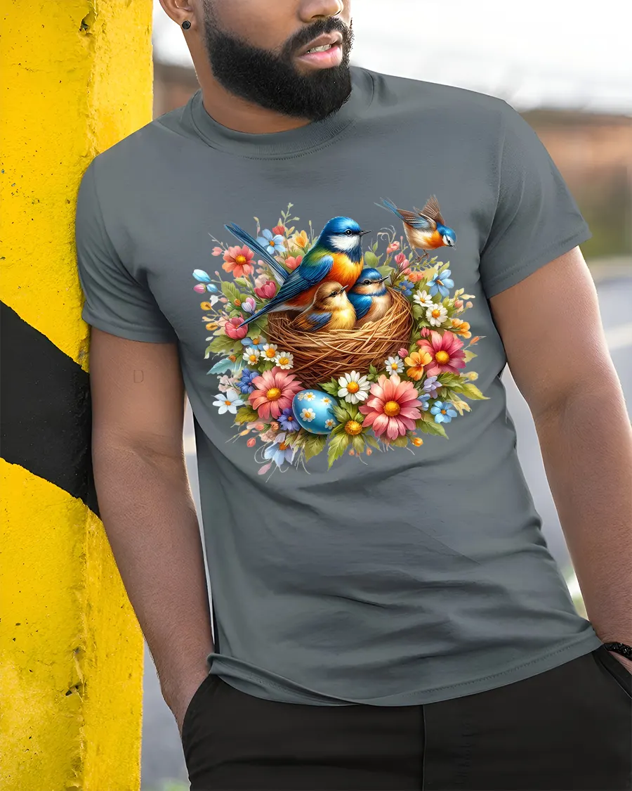 Spring Birds in Nest Floral Nature Art T-Shirt is a vibrant celebration of wildlife, springtime beauty, and the gentle charm of nature. Featuring a mama bird perched on a cozy nest of adorable chicks, surrounded by colorful blossoms, wildflowers, and bright spring eggs, this design captures the joy and warmth of the season. The detailed artwork and radiant colors make this tee perfect for bird lovers, gardeners, and anyone who appreciates peaceful nature scenes.