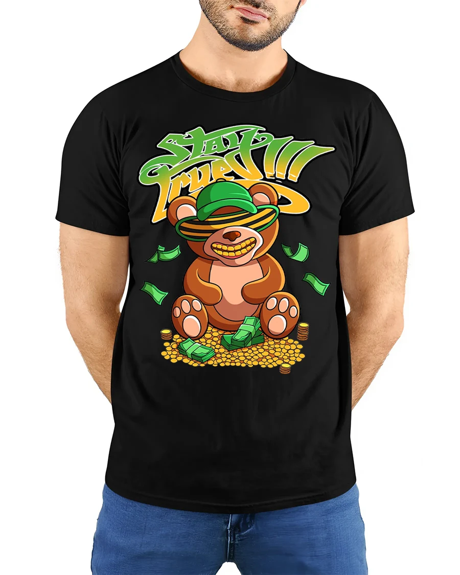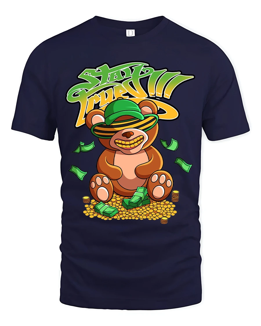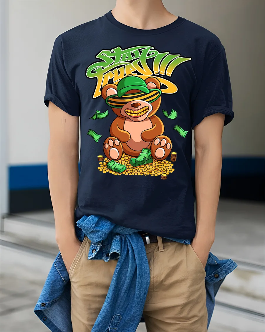 Stay Fresh Money Bear T Shirt delivers a bold playful vibe with a fun cartoon teddy bear surrounded by cash and coins.