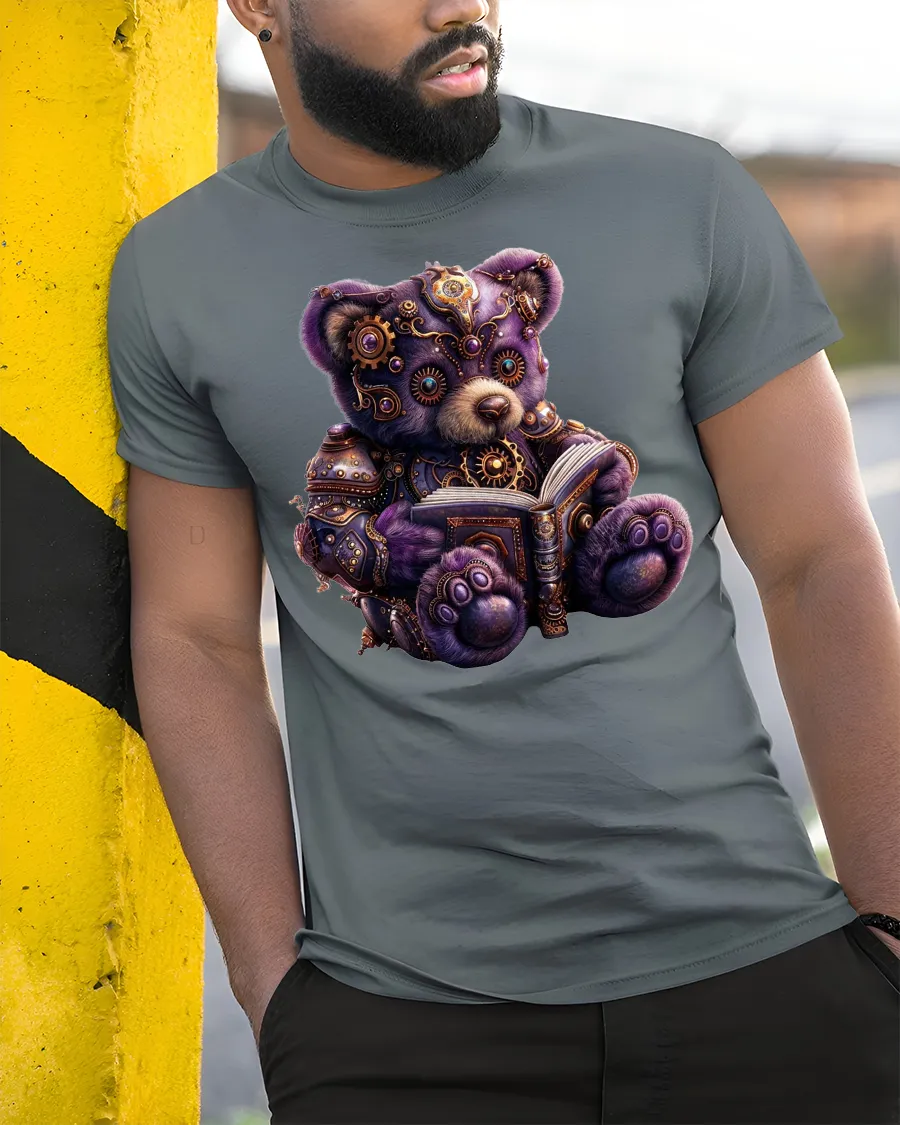 Add this steampunk teddy bear reader tee to your wardrobe and enjoy a truly original design full of charm and fantasy detail.