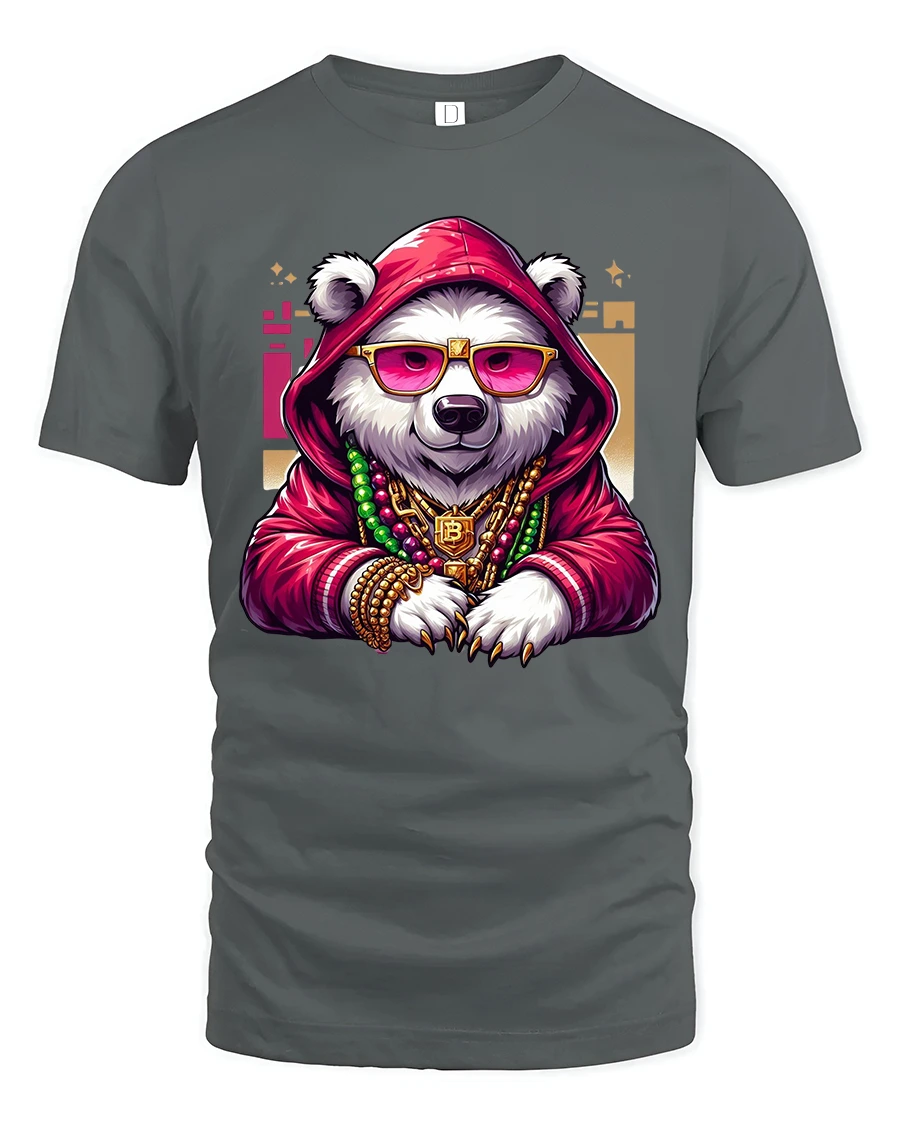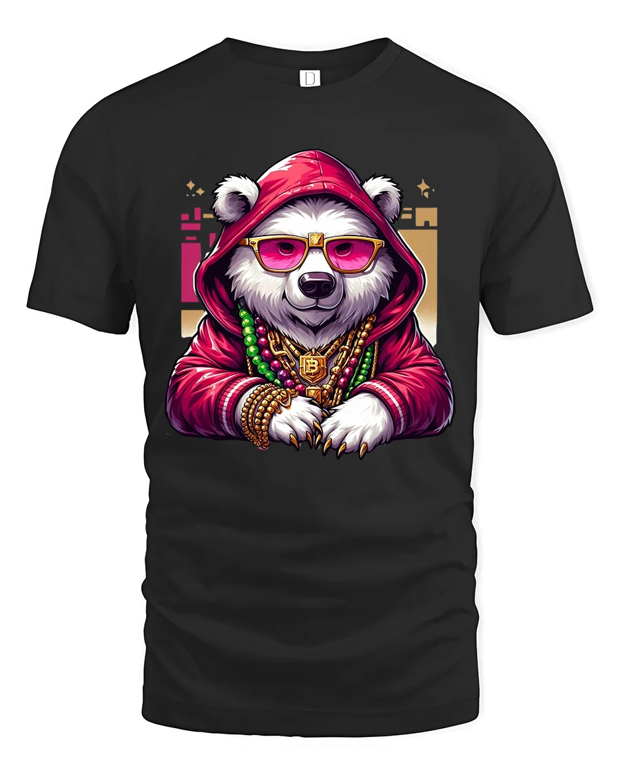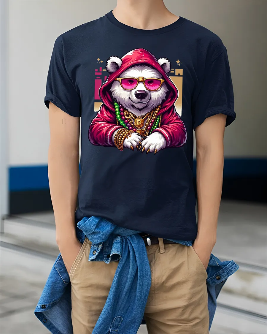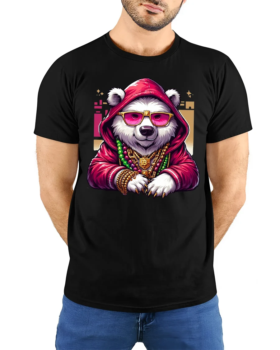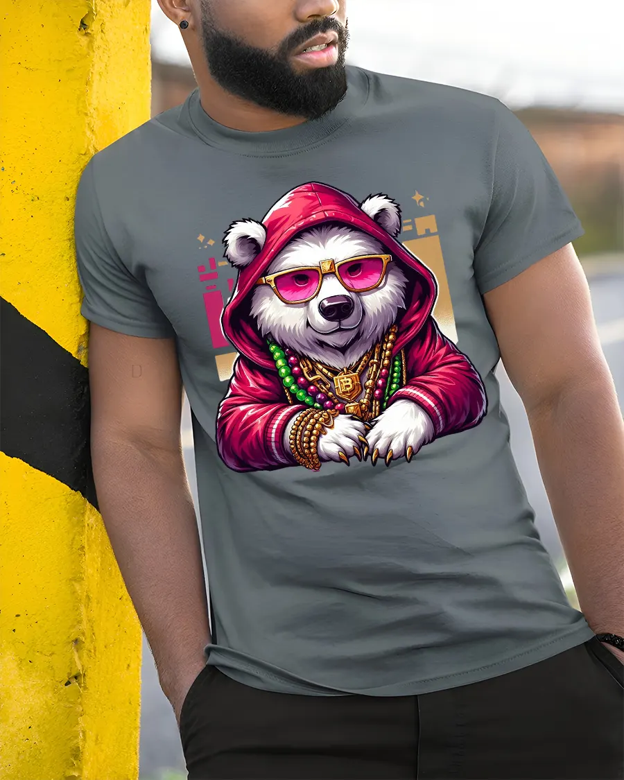 The panda character features a hoodie sunglasses and gold chains creating a powerful hip hop inspired visual that blends attitude with humor.