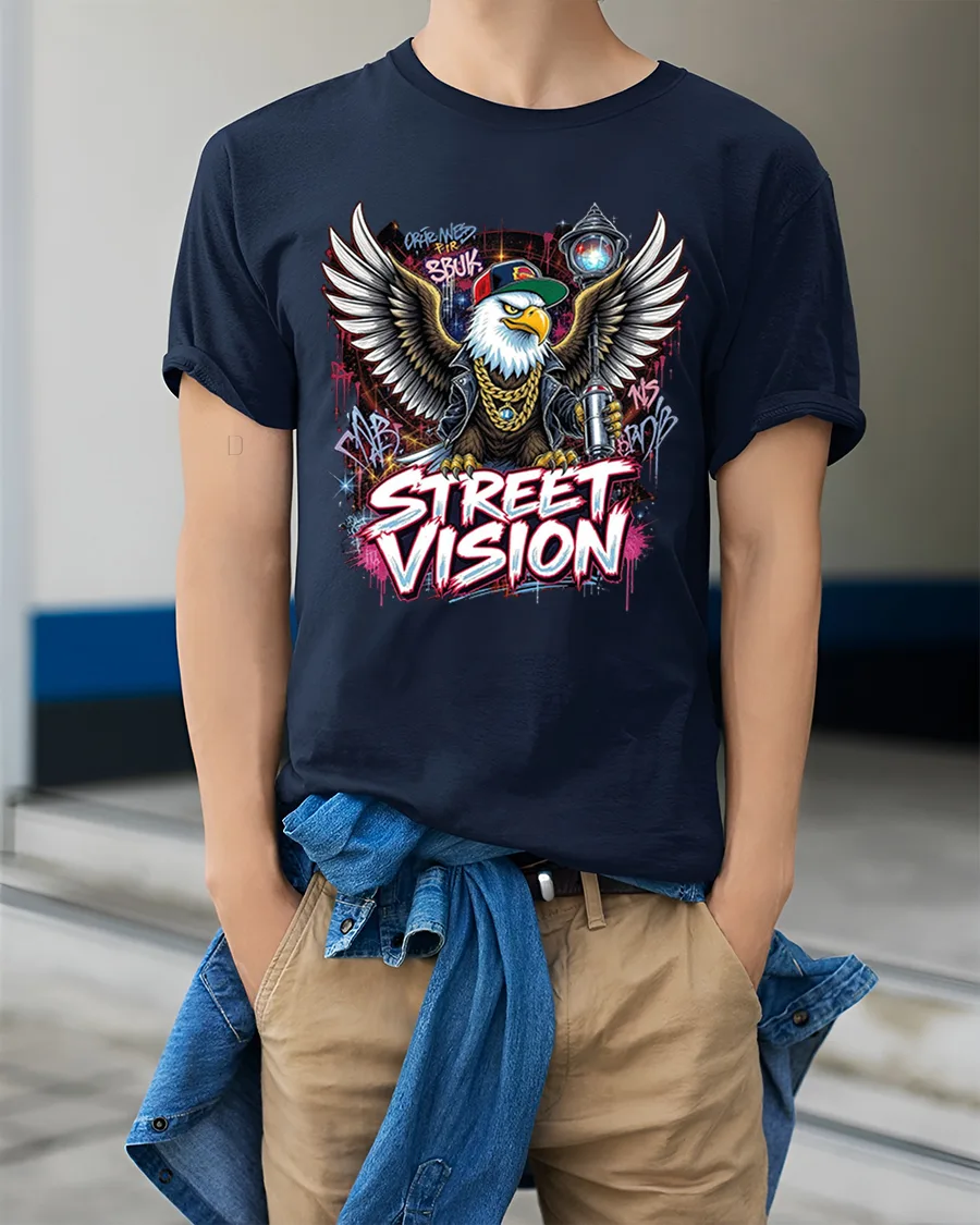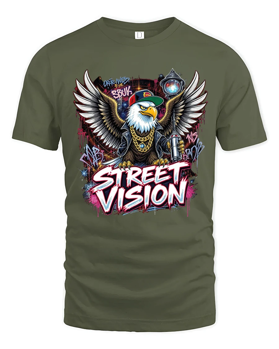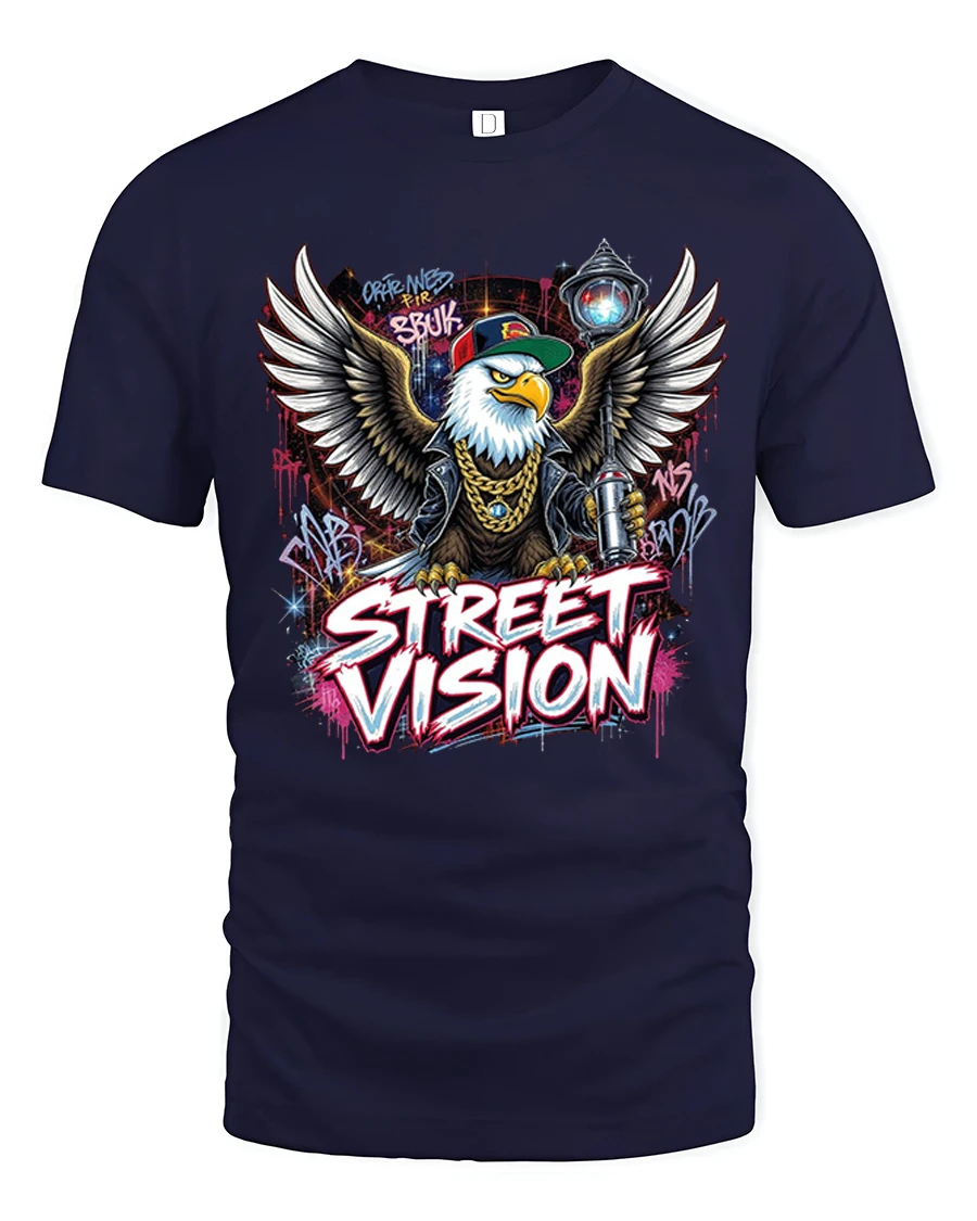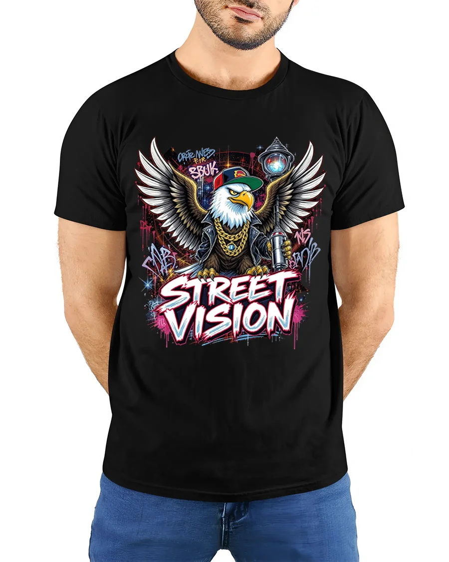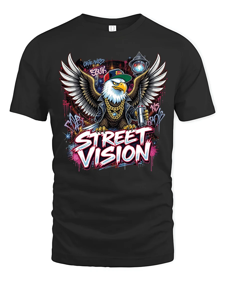 Street Vision Eagle Graffiti Urban Graphic T Shirt brings bold street culture energy into a powerful wearable design. Featuring a fierce eagle rocking a cap and chains with graffiti inspired artwork and dynamic wings, this graphic captures confidence, attitude, and creative urban expression. The vibrant street art details and strong typography make this tee a standout statement in any casual collection.