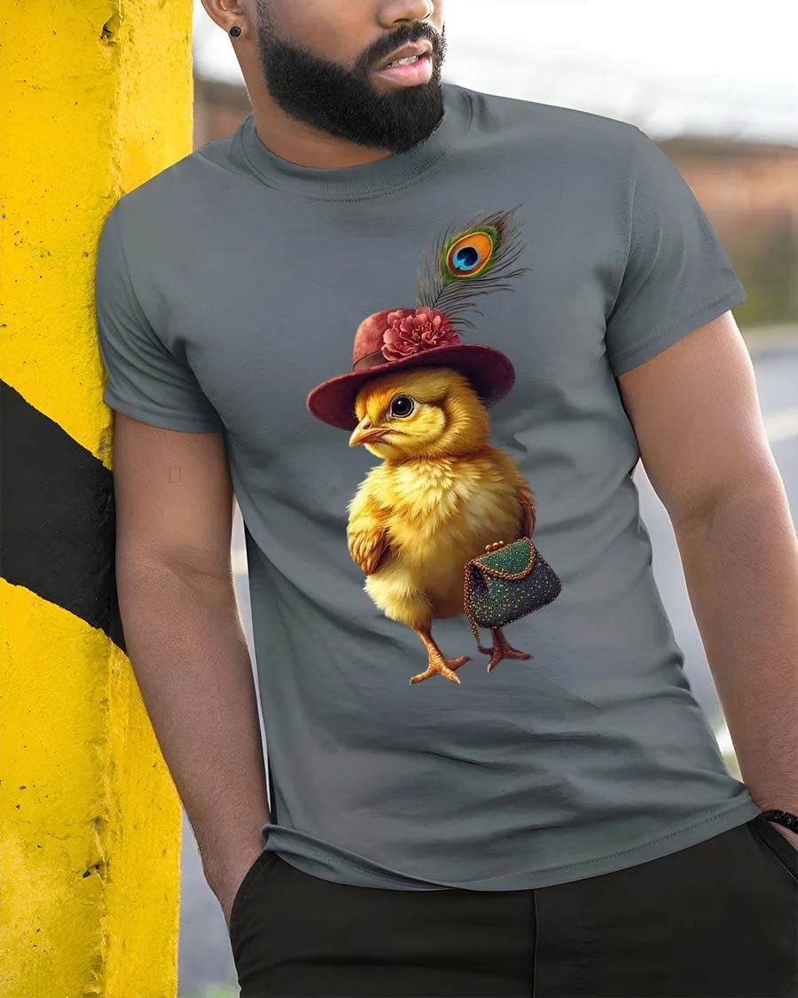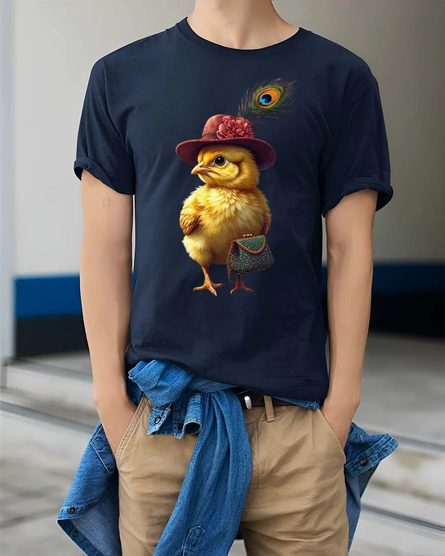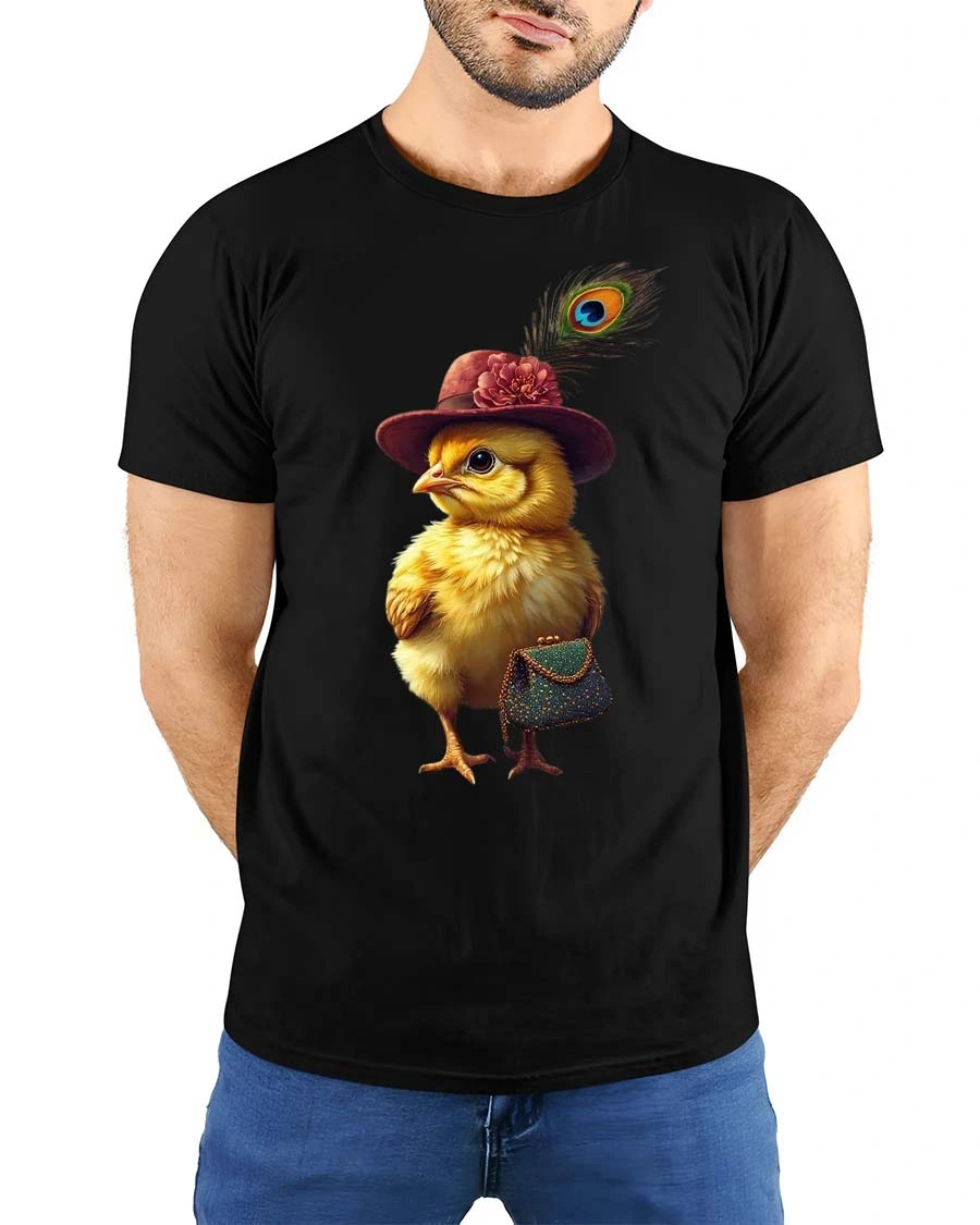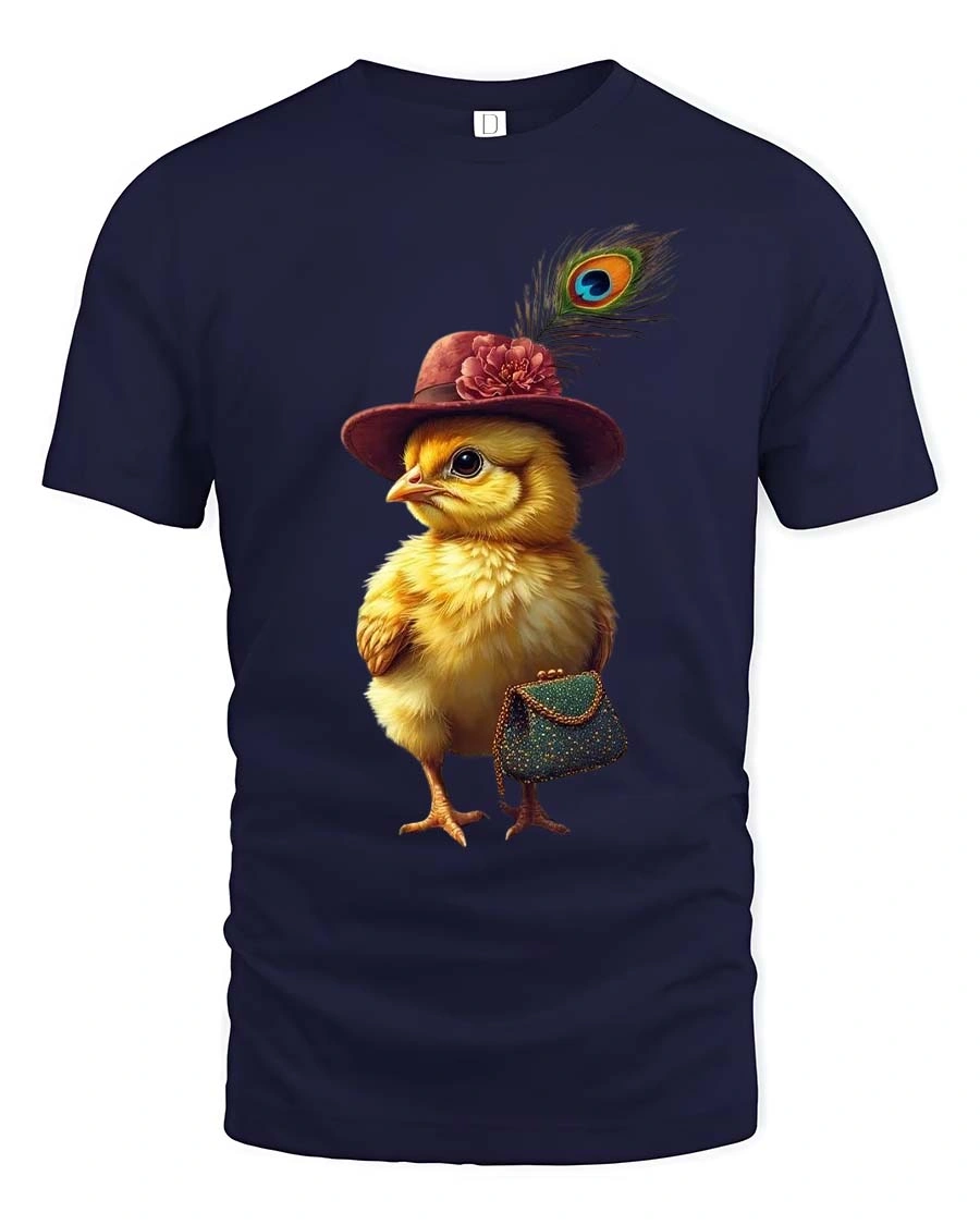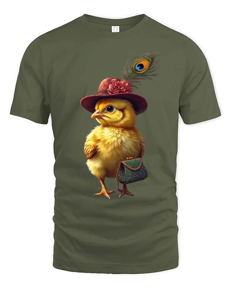 The adorable chick illustration features a fashionable hat accented with a feather and a stylish purse creating a unique character full of personality and fashionable flair.