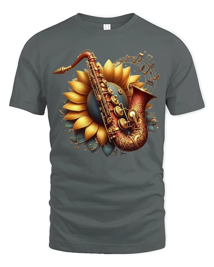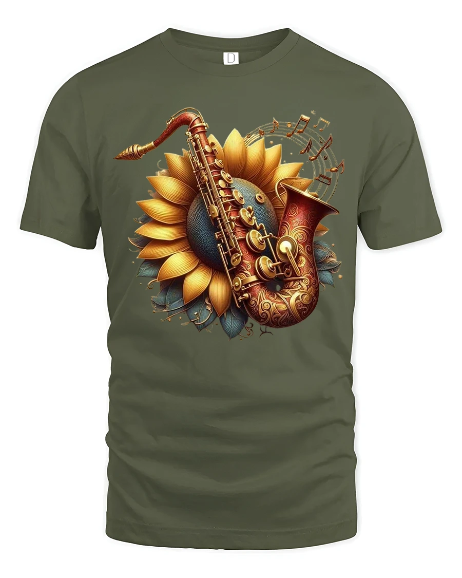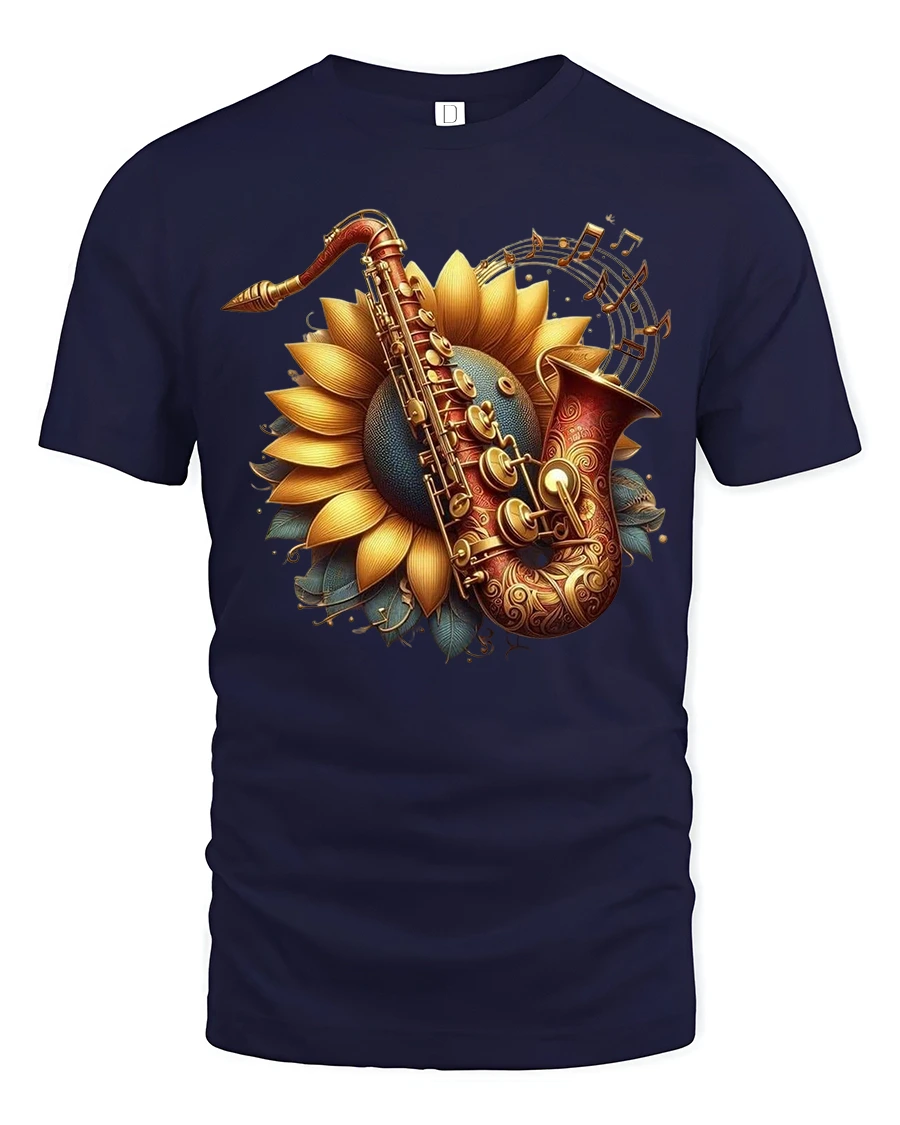 The Sunflower Saxophone Melody Art Tee blends the beauty of nature with the soulful charm of music, featuring a stunning sunflower blooming behind an intricately detailed saxophone. Surrounding musical notes complete the design, creating a warm and artistic expression perfect for anyone who loves jazz, flowers, or creative visual styles. This tee immediately stands out with its rich colors and elegant composition.