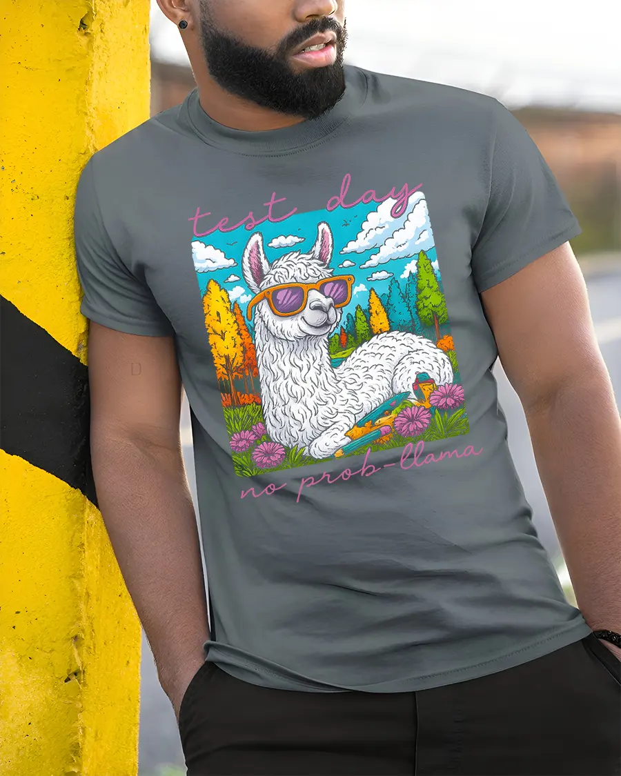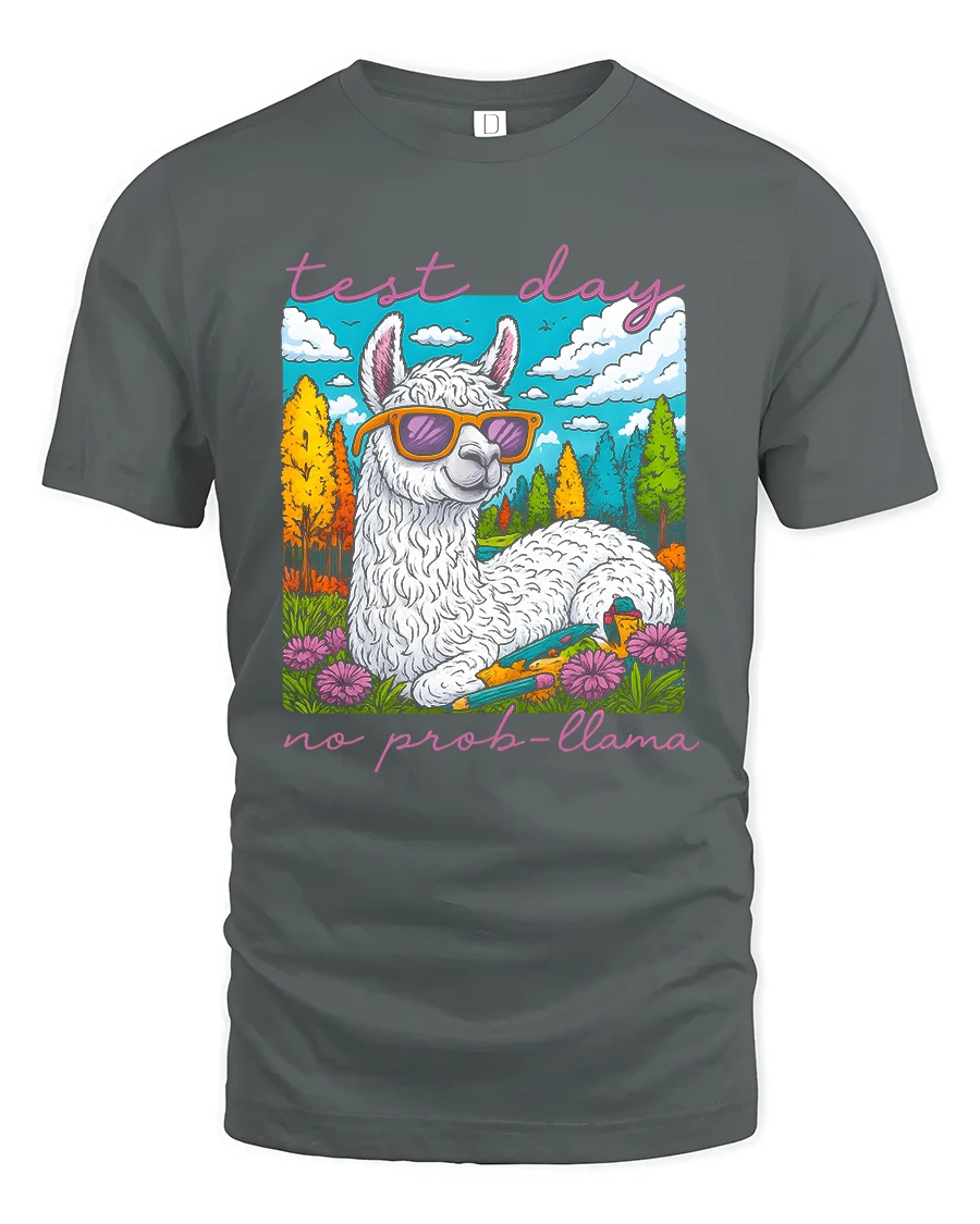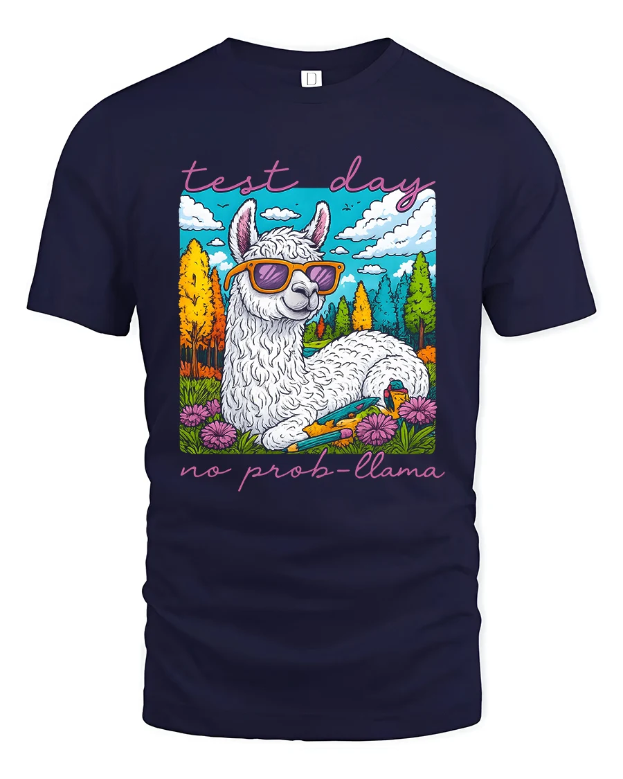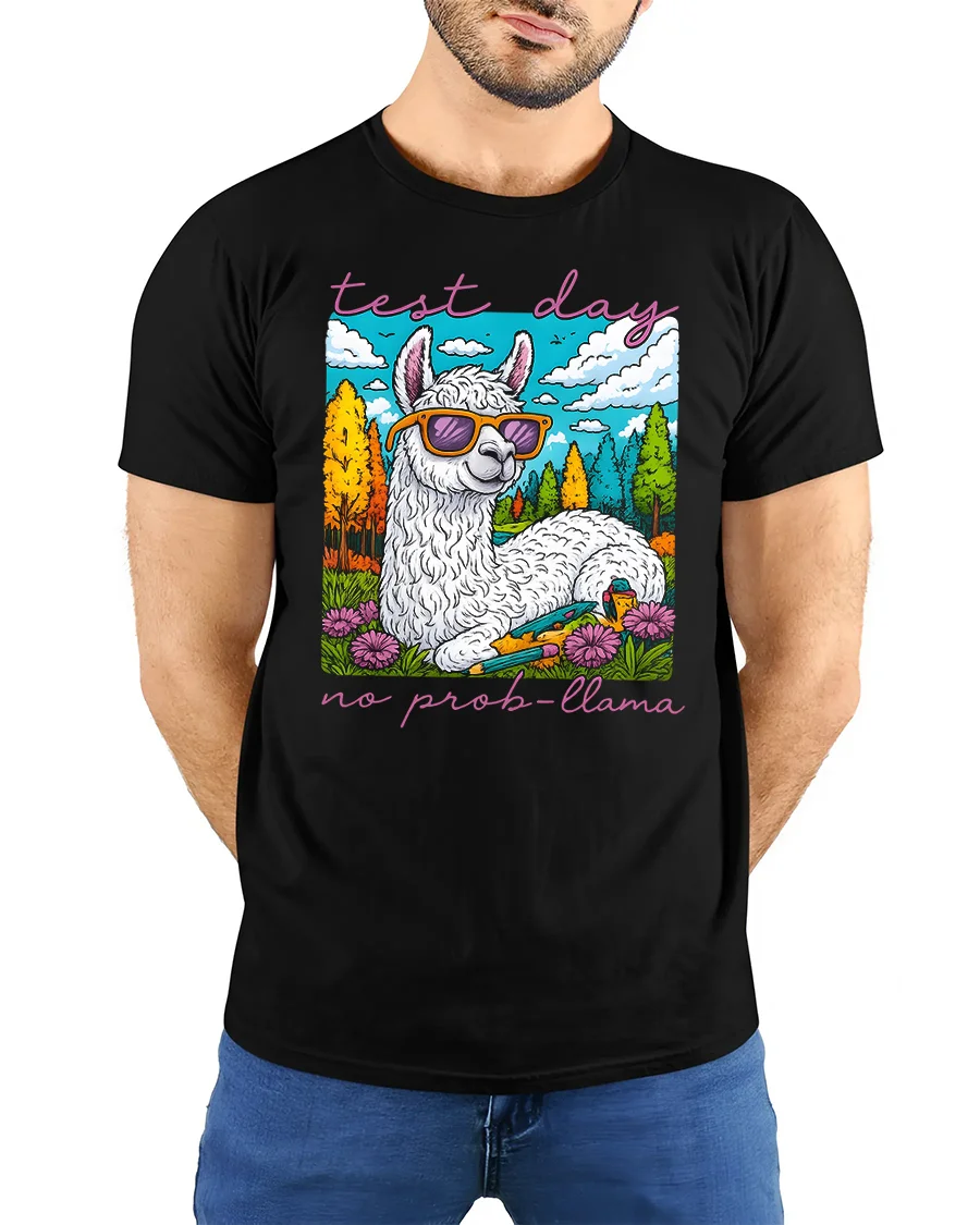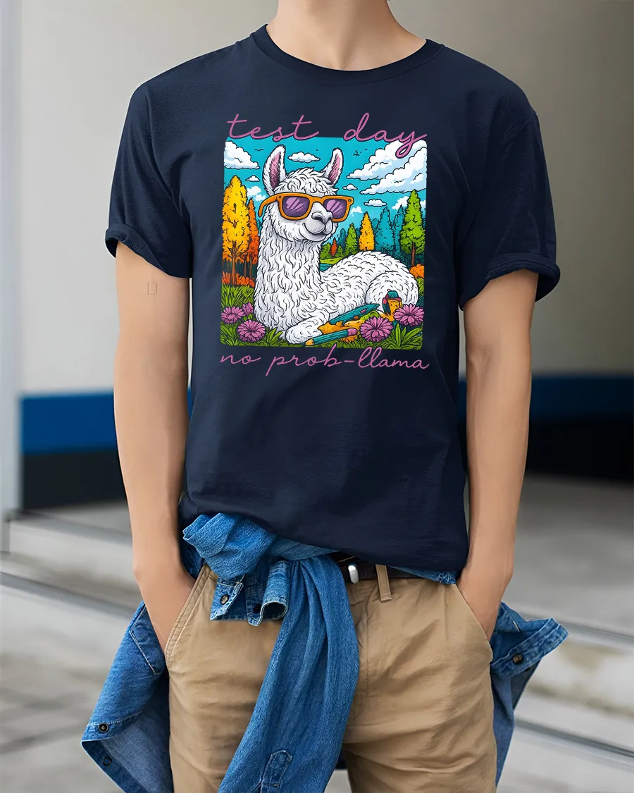 Test Day No Prob Llama Funny Llama Graphic T Shirt delivers humor and confidence with a bright and cheerful cartoon design. Featuring a relaxed llama wearing stylish sunglasses surrounded by a colorful nature scene, this playful artwork brings a calm and carefree message to busy school days. The fun quote adds personality and makes this tee a standout choice that sparks smiles and positive vibes.