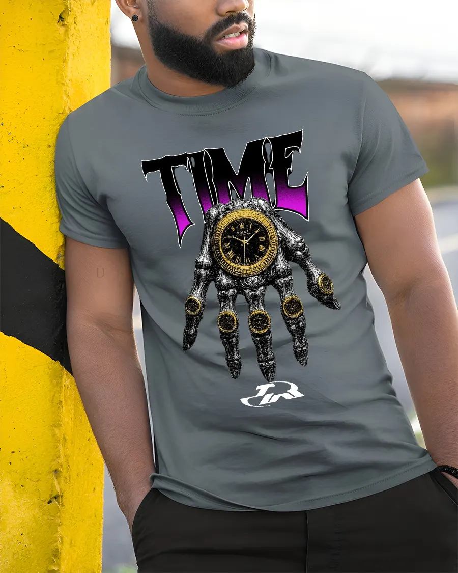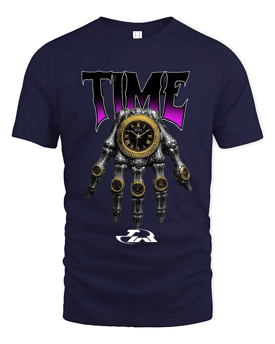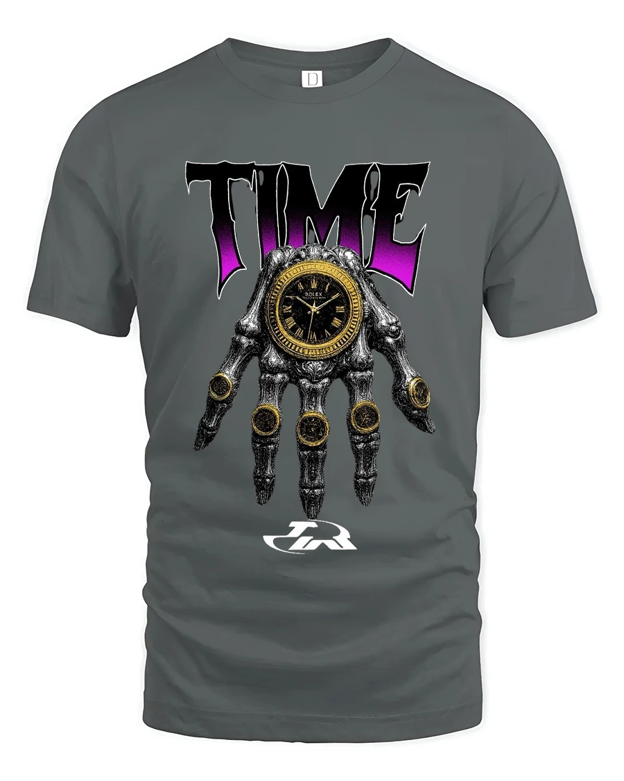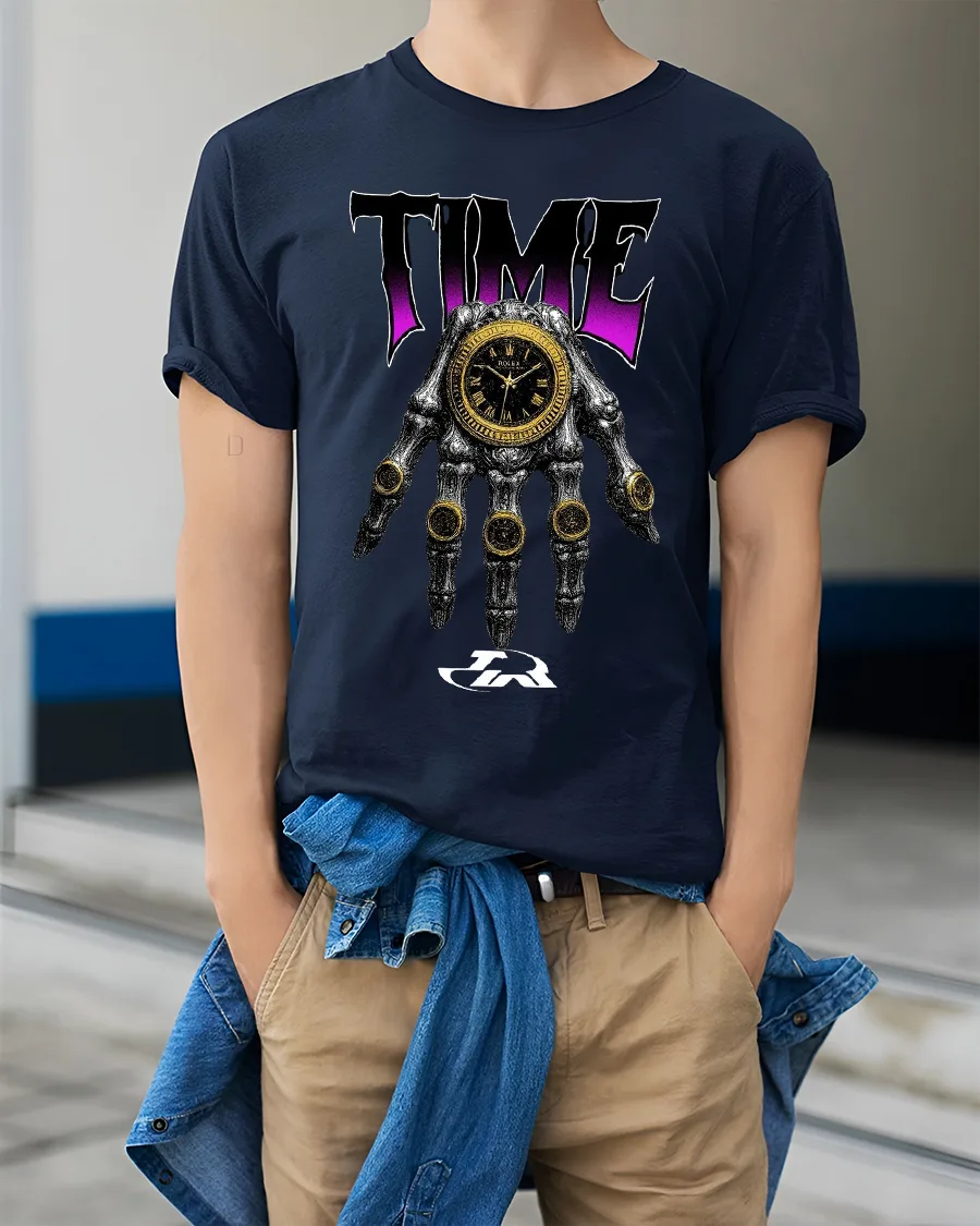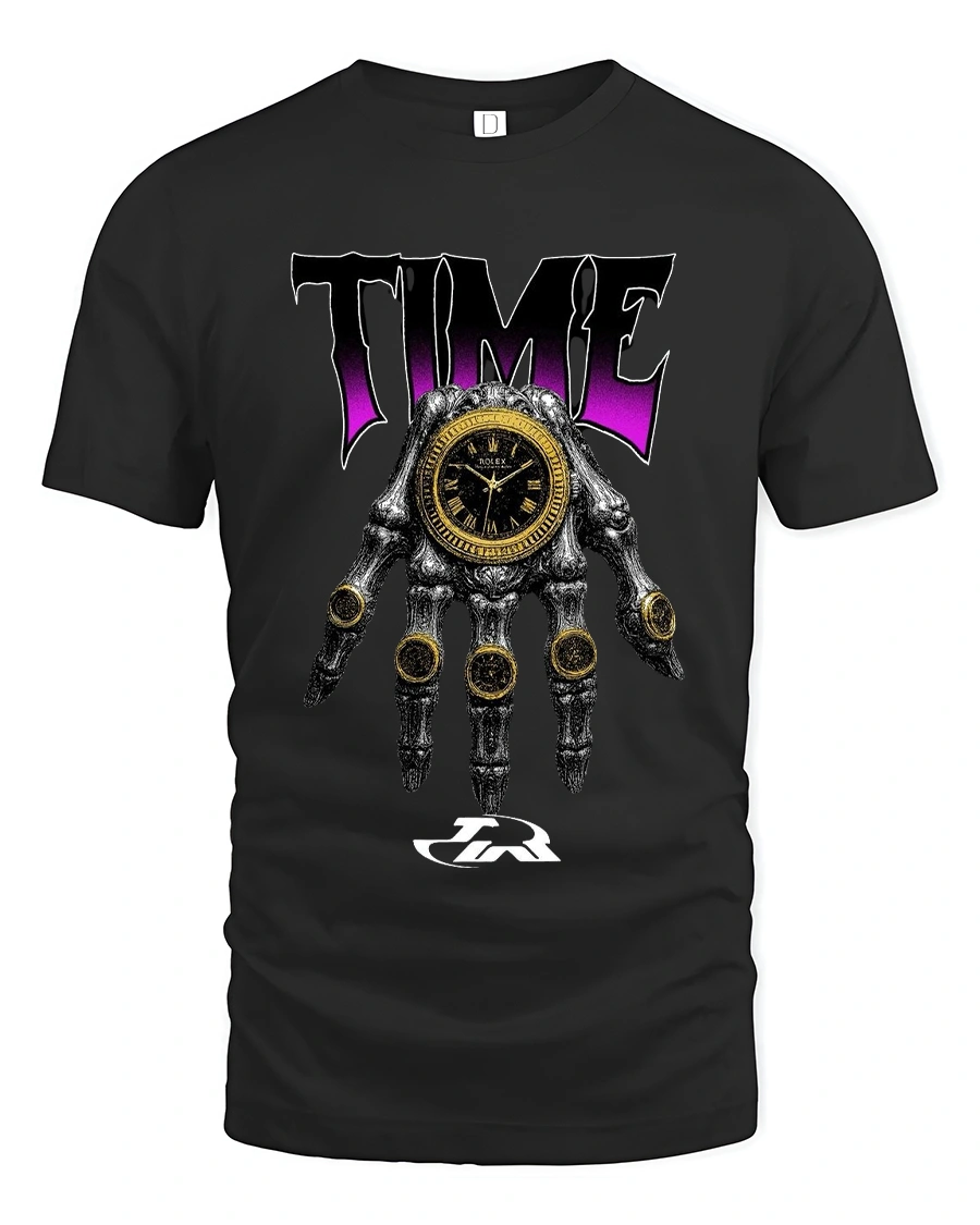 Featuring a detailed skull hand holding a striking timepiece this design blends luxury inspiration with dark artistic streetwear energy.