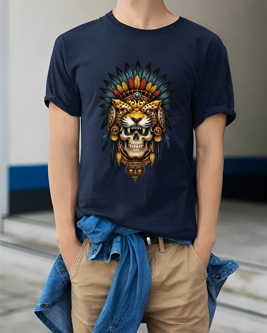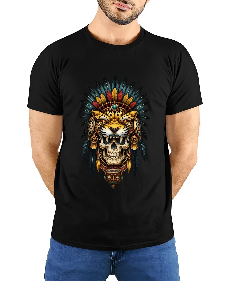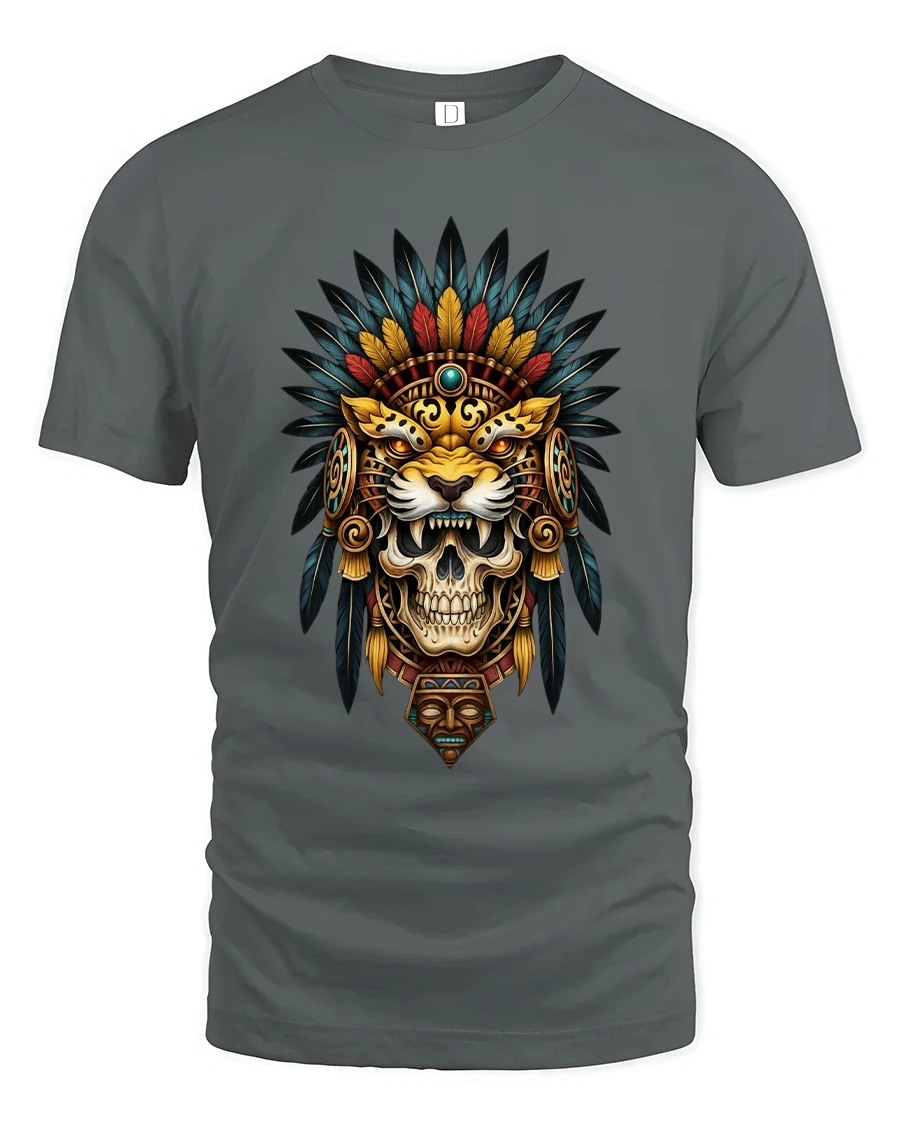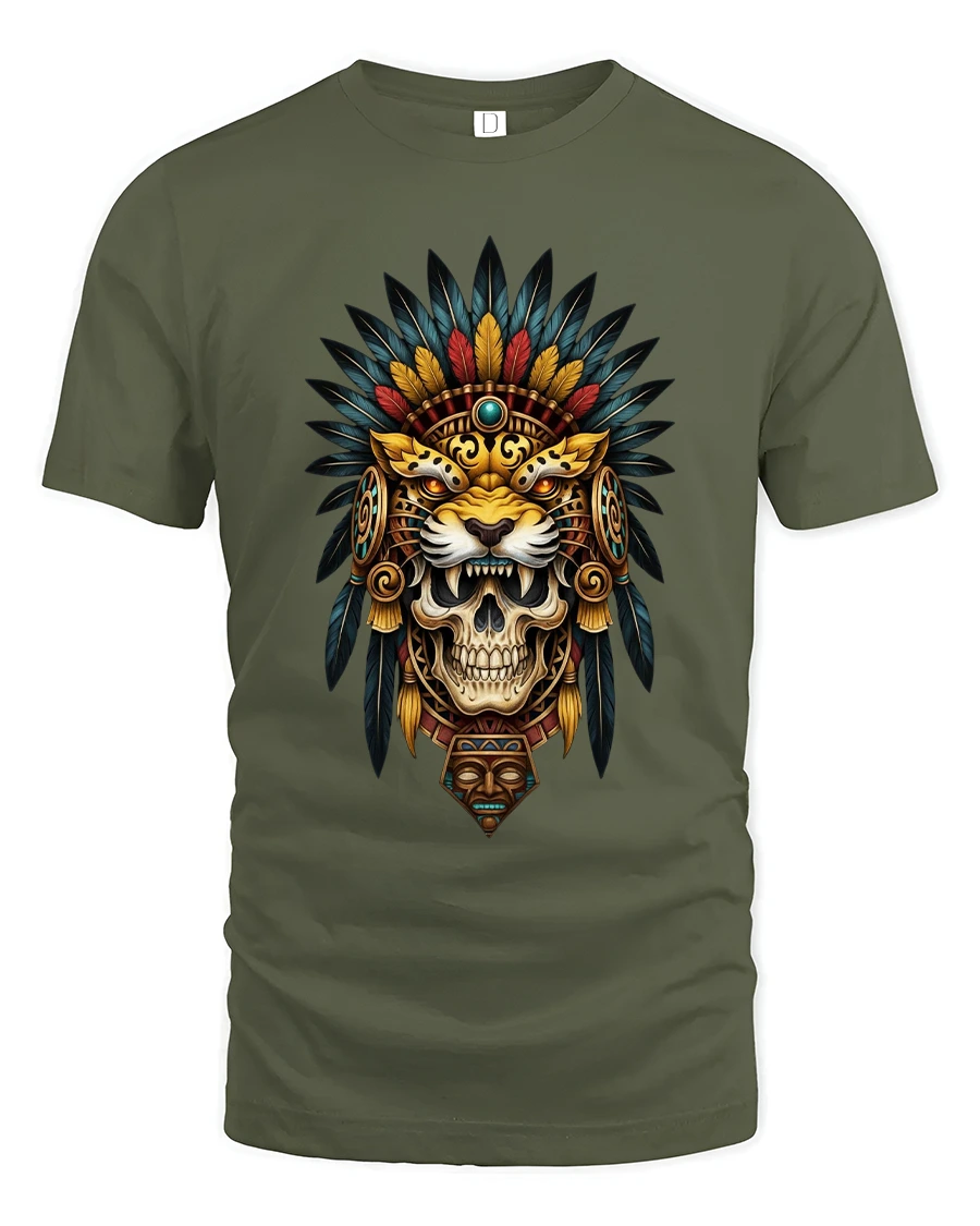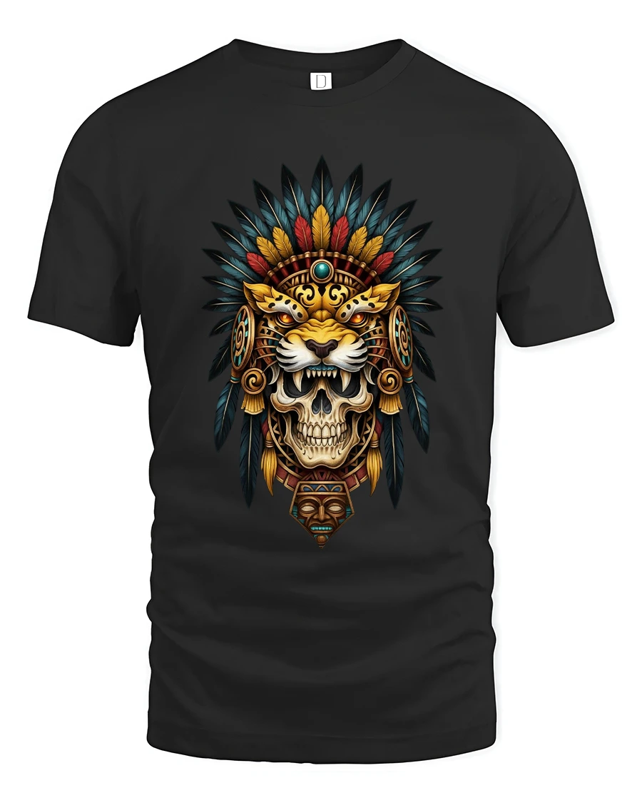 This tee features a powerful skull merged with a lion mask and tribal headdress creating a striking image of courage dominance and warrior spirit.