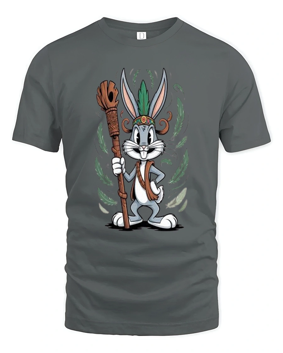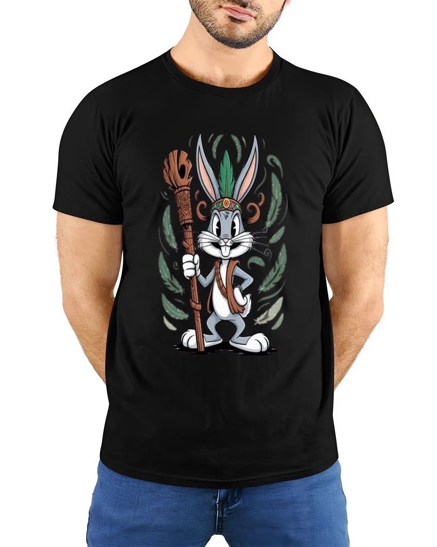 Tribal Warrior Rabbit Cartoon Fantasy Illustration T Shirt Tee blends playful character design with a bold mystical aesthetic.