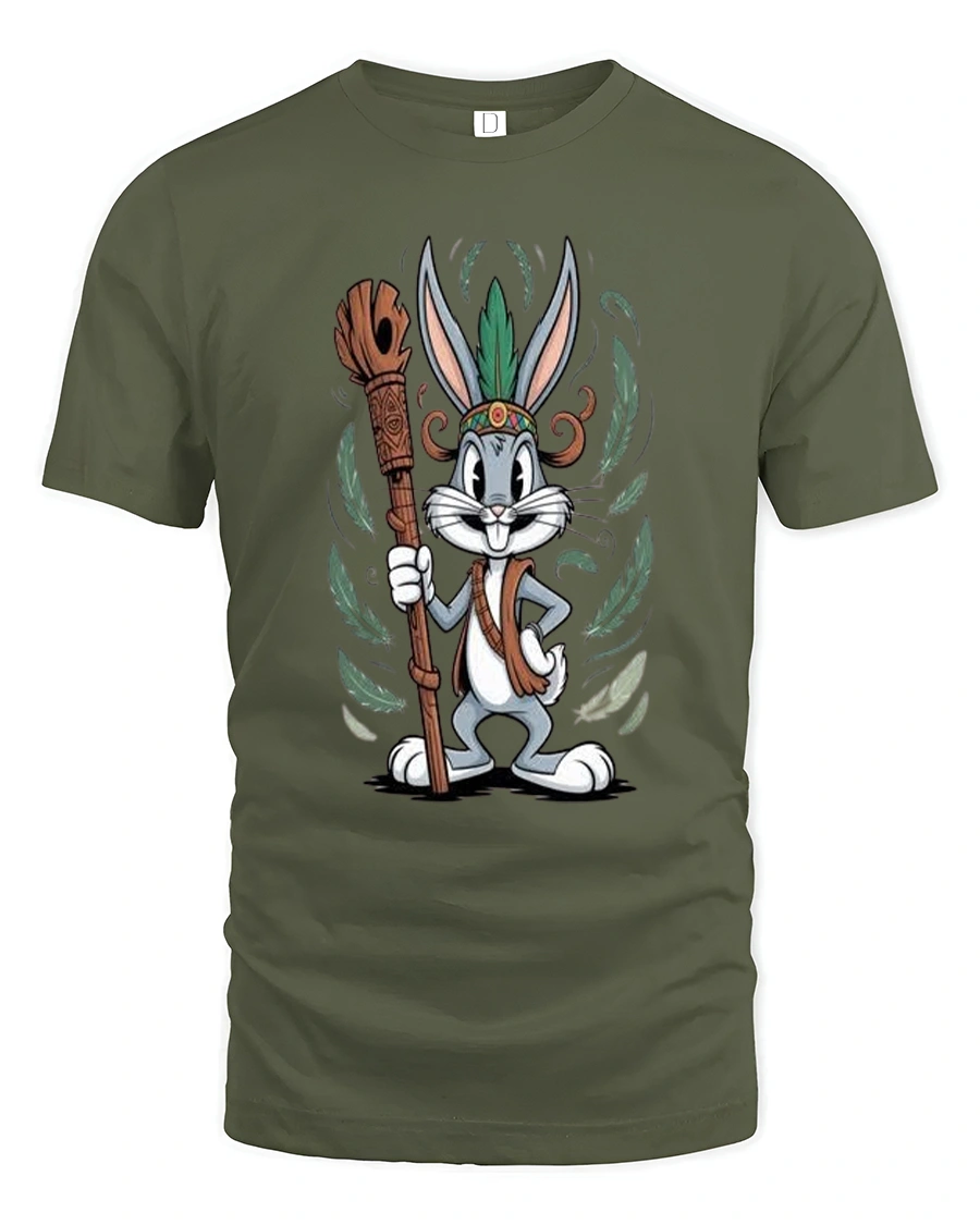 Tribal Warrior Rabbit Cartoon Fantasy Illustration T Shirt Tee is ideal for anyone who enjoys fantasy art and unique animal characters.