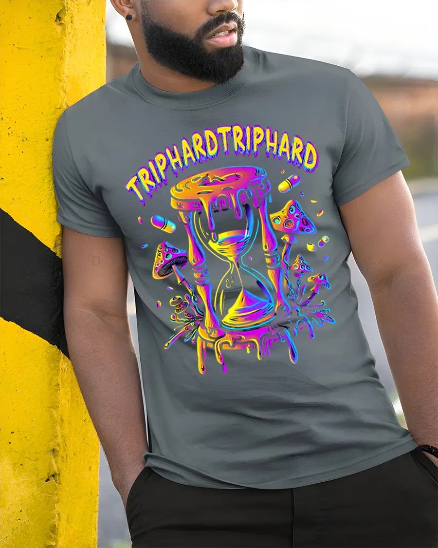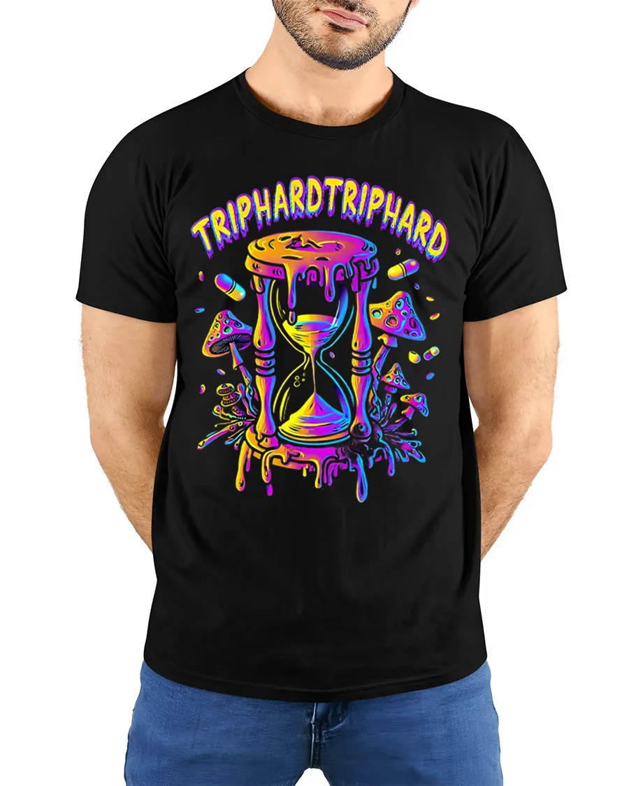 Trip Hard Melting Hourglass Psychedelic Graphic T Shirt is made for those who embrace creativity, individuality, and bold fashion choices. Add this unique graphic tee to your collection and let your outfit reflect a fearless, colorful perspective on time and self expression.