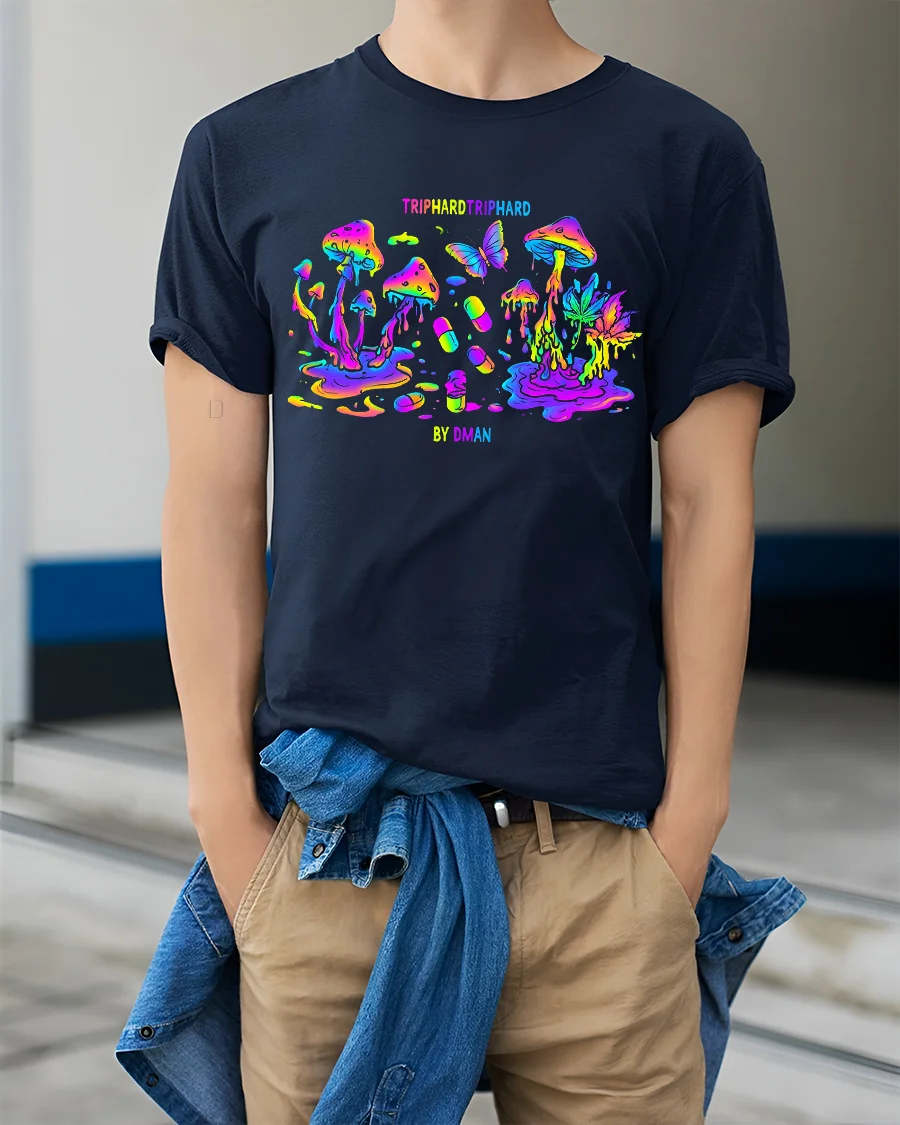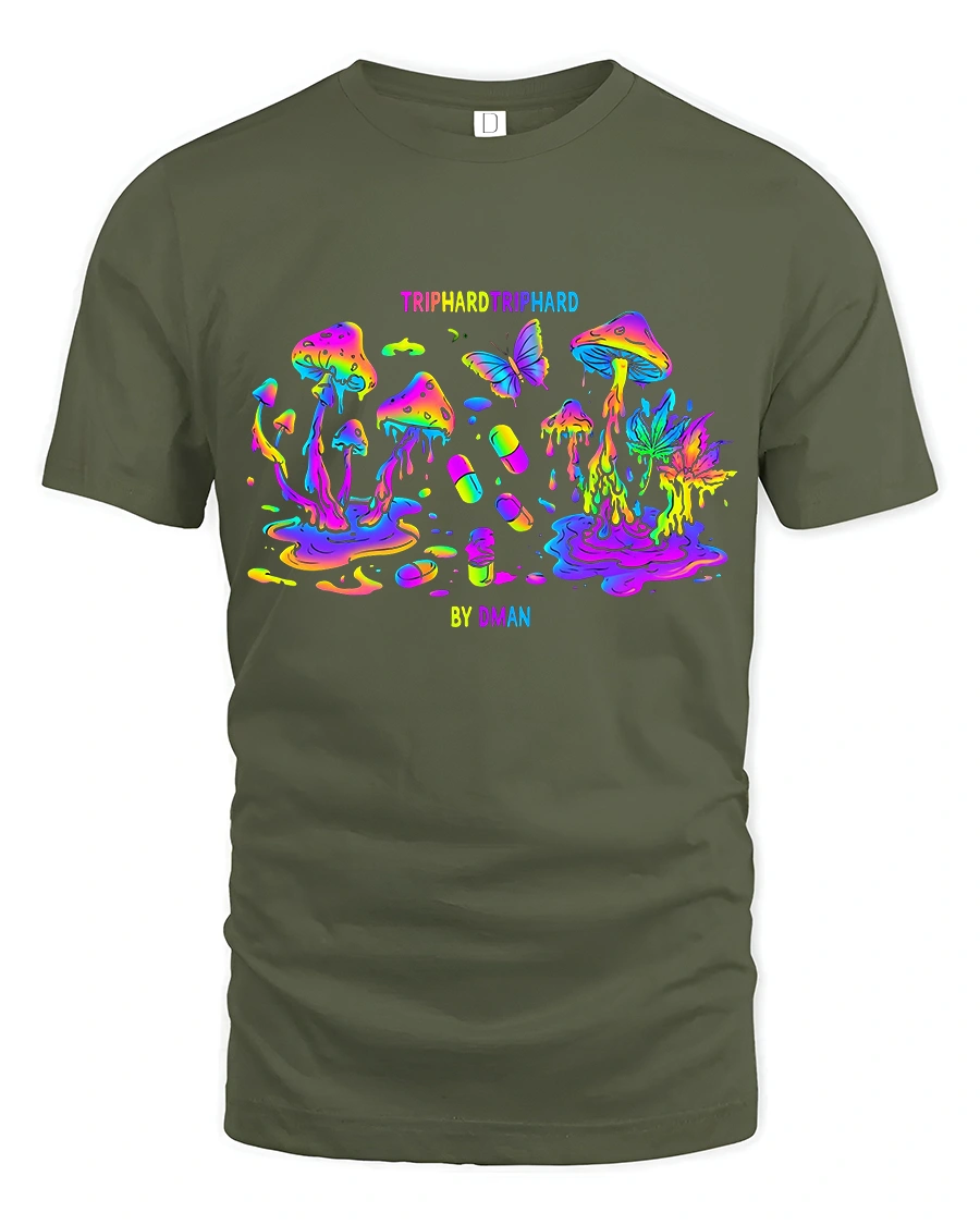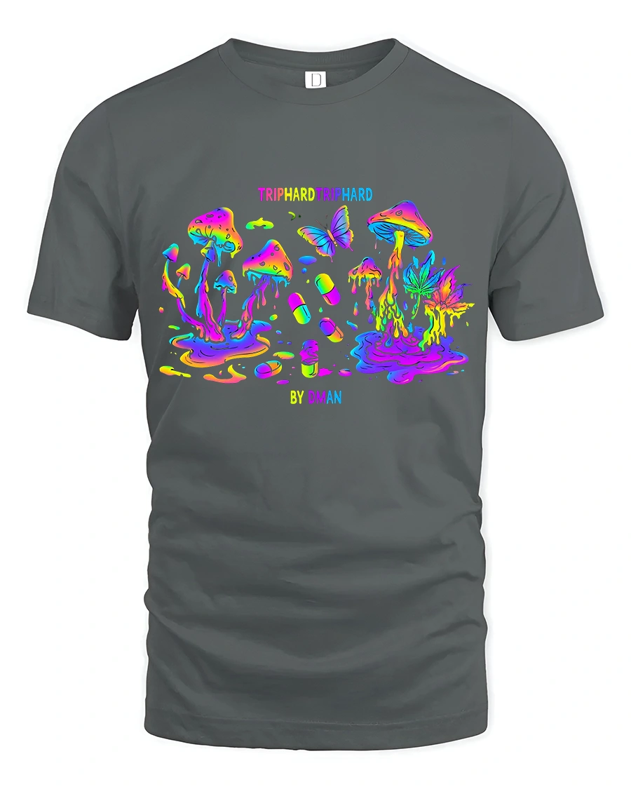 Trip Hard Psychedelic Mushroom Neon Graphic T Shirt explodes with vibrant color and surreal creativity. Featuring melting neon mushrooms, glowing capsules, and bold psychedelic details, this eye catching artwork captures the energy of festival culture and expressive street style. The dynamic design and bright color palette create a powerful visual that instantly stands out in any crowd.