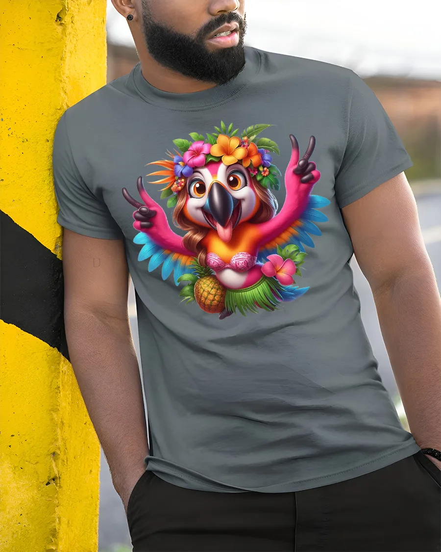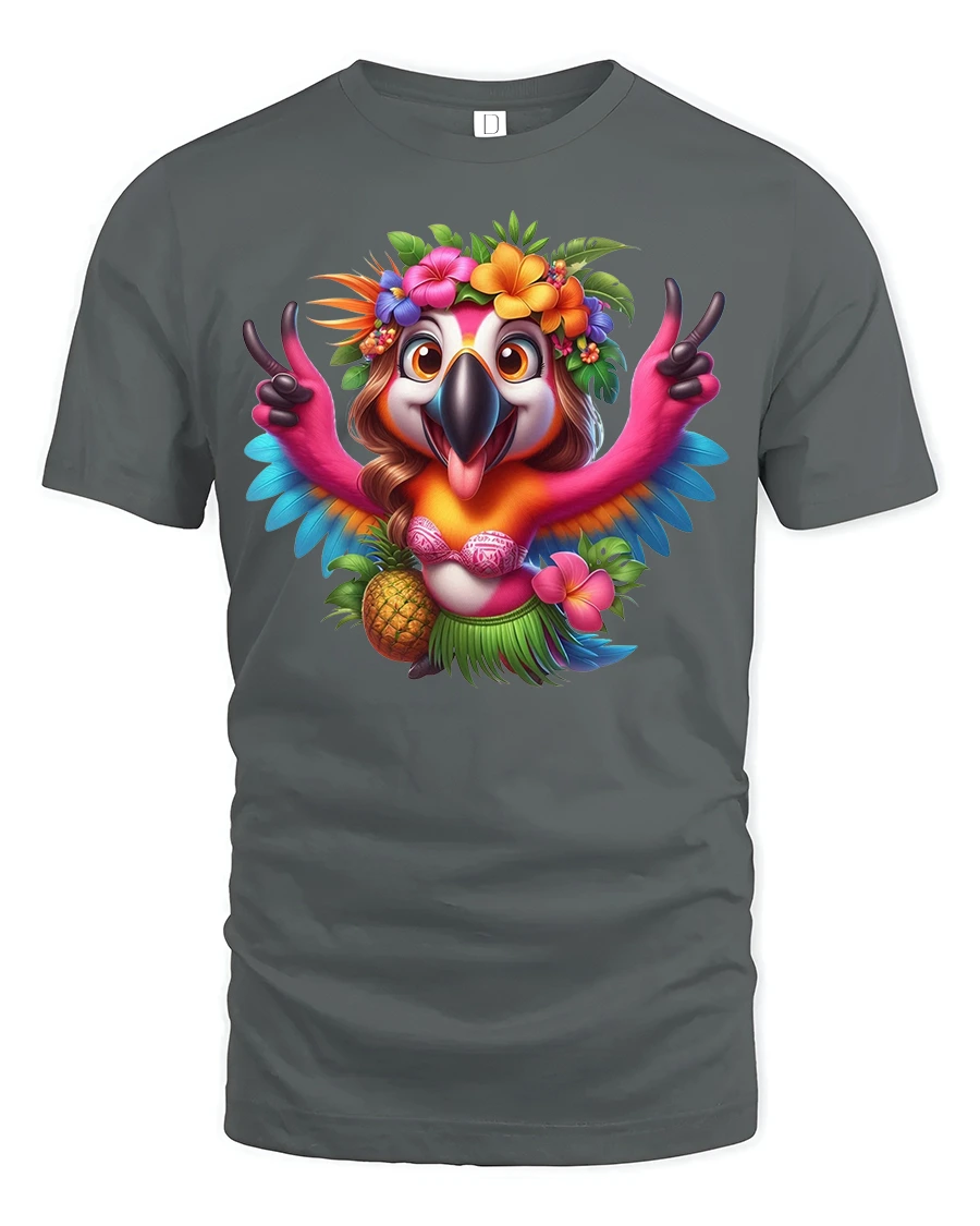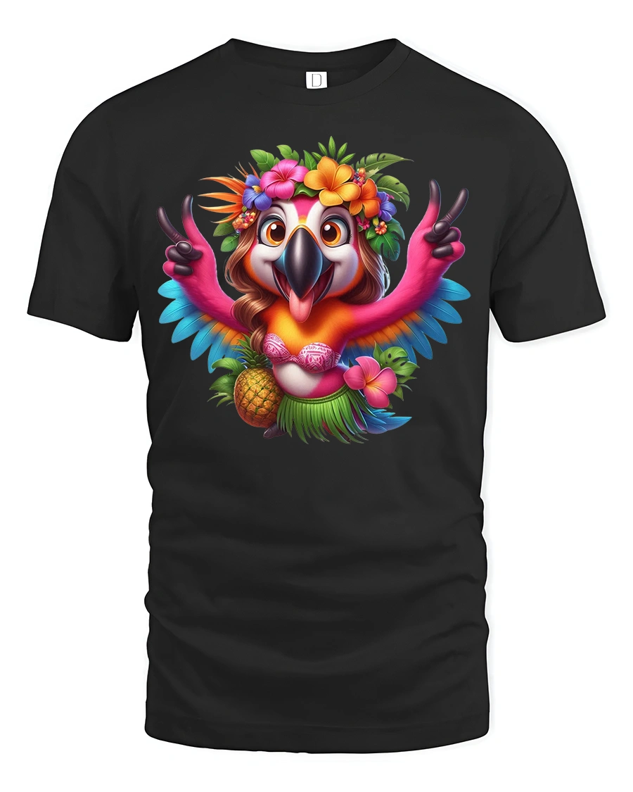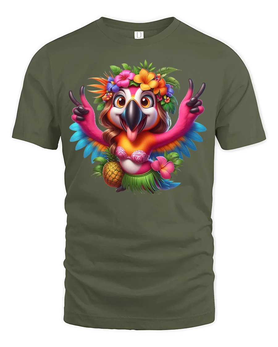 Spread good vibes and island joy with this Tropical Hula Parrot T-Shirt — the ultimate tee for sunny days, beach parties, and endless smiles.