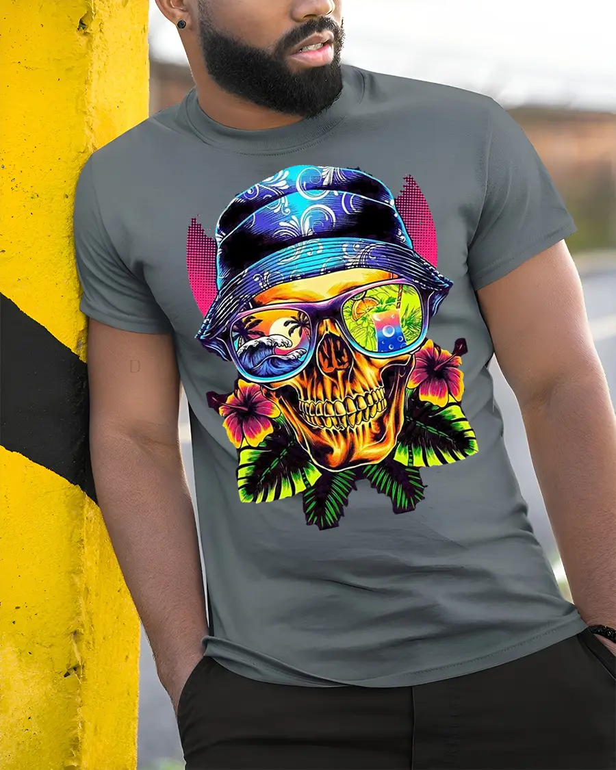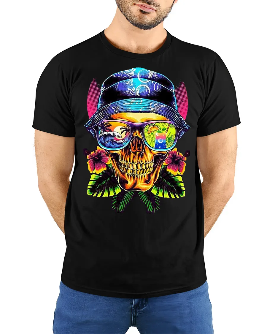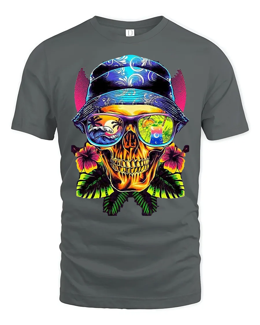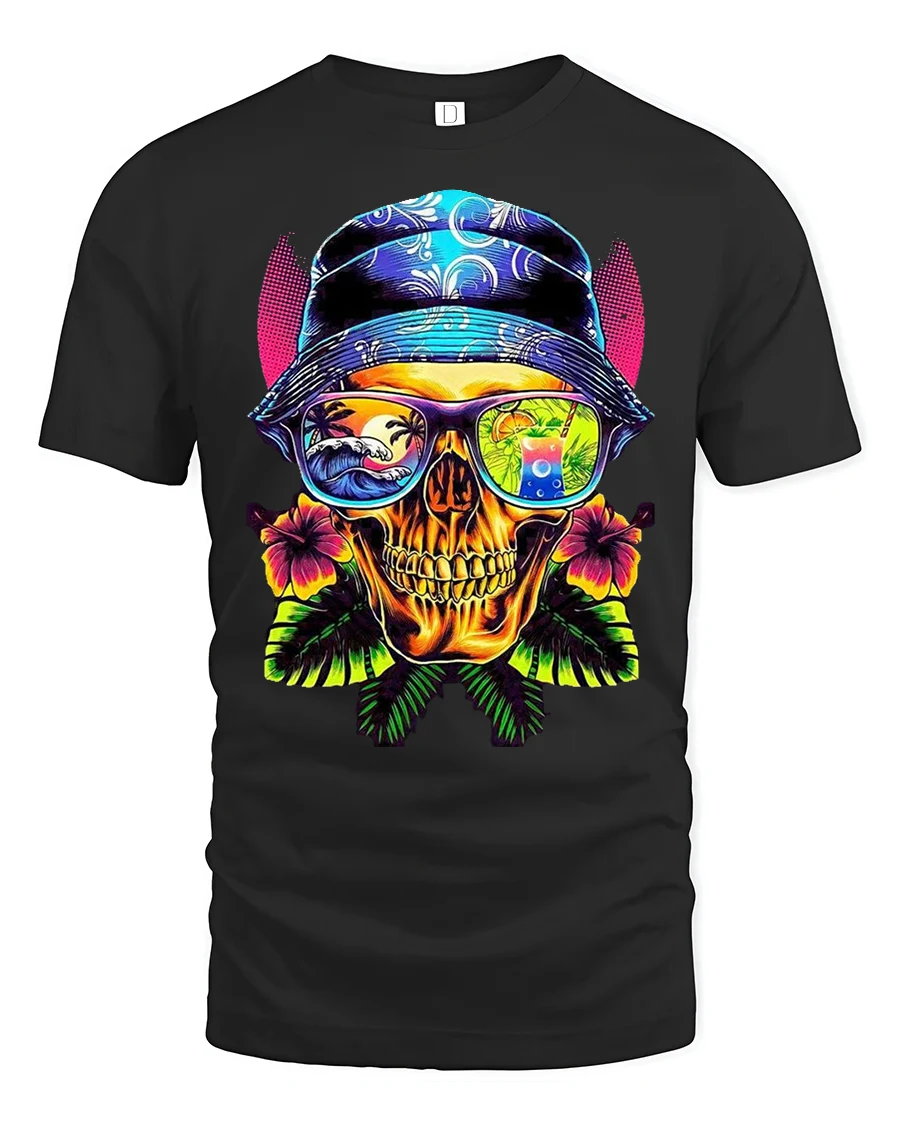 Tropical Skull Vibes Summer Beach Party Graphic TShirt Tee brings bold energy and a vibrant island mood to your wardrobe. The design features a neon skull wearing reflective sunglasses that capture waves, palm trees, and tropical drinks, creating a lively beach scene that instantly stands out. Bright hibiscus flowers and lush leaves frame the artwork, adding a fun and colorful twist that appeals to anyone who loves summer style.