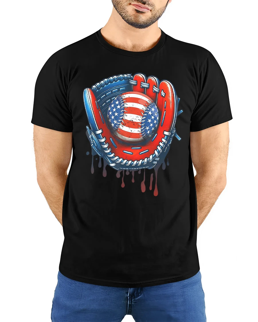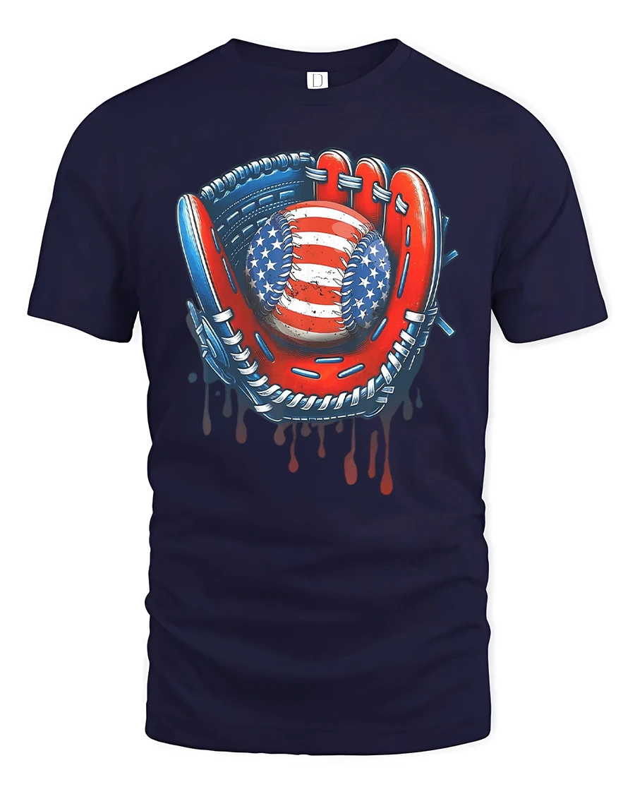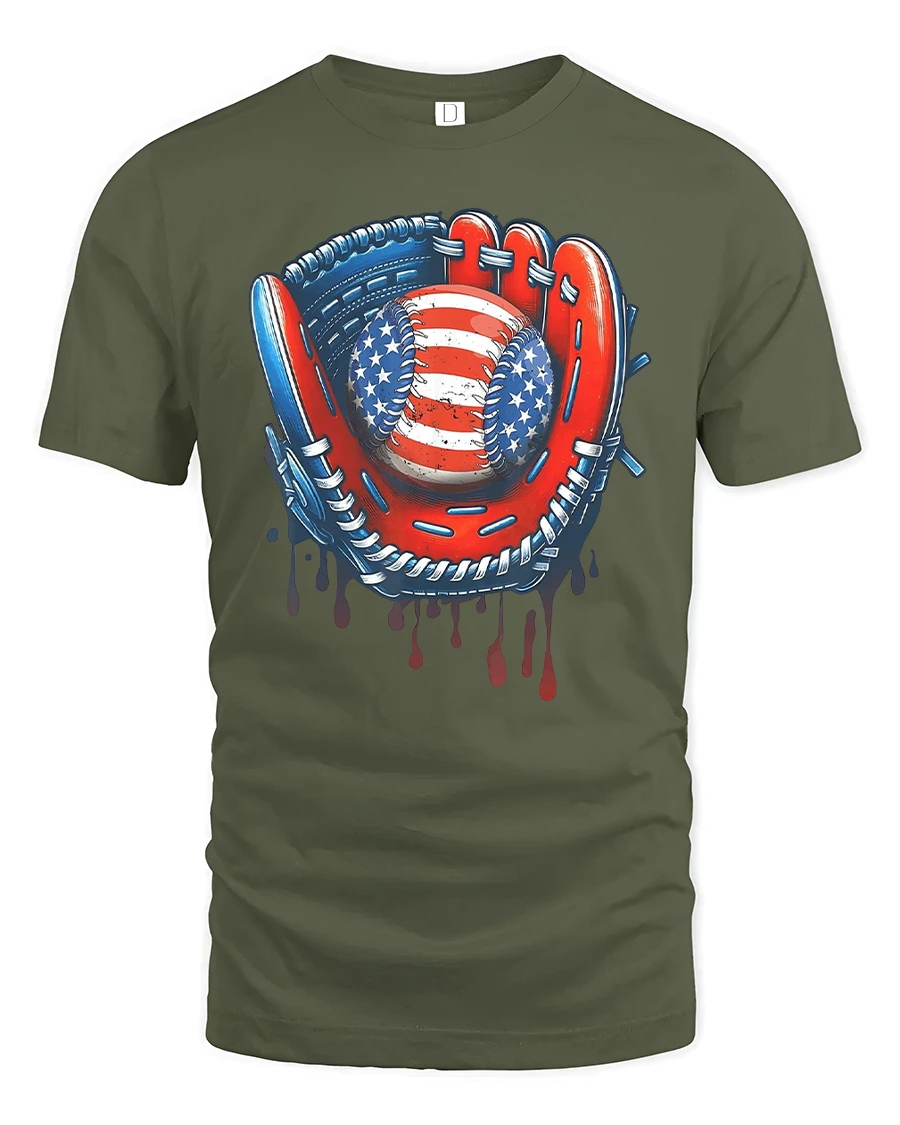 Featuring a bold graphic of a baseball glove holding a red, white, and blue flag ball with dripping paint, this design celebrates freedom and love for the game in one striking look.