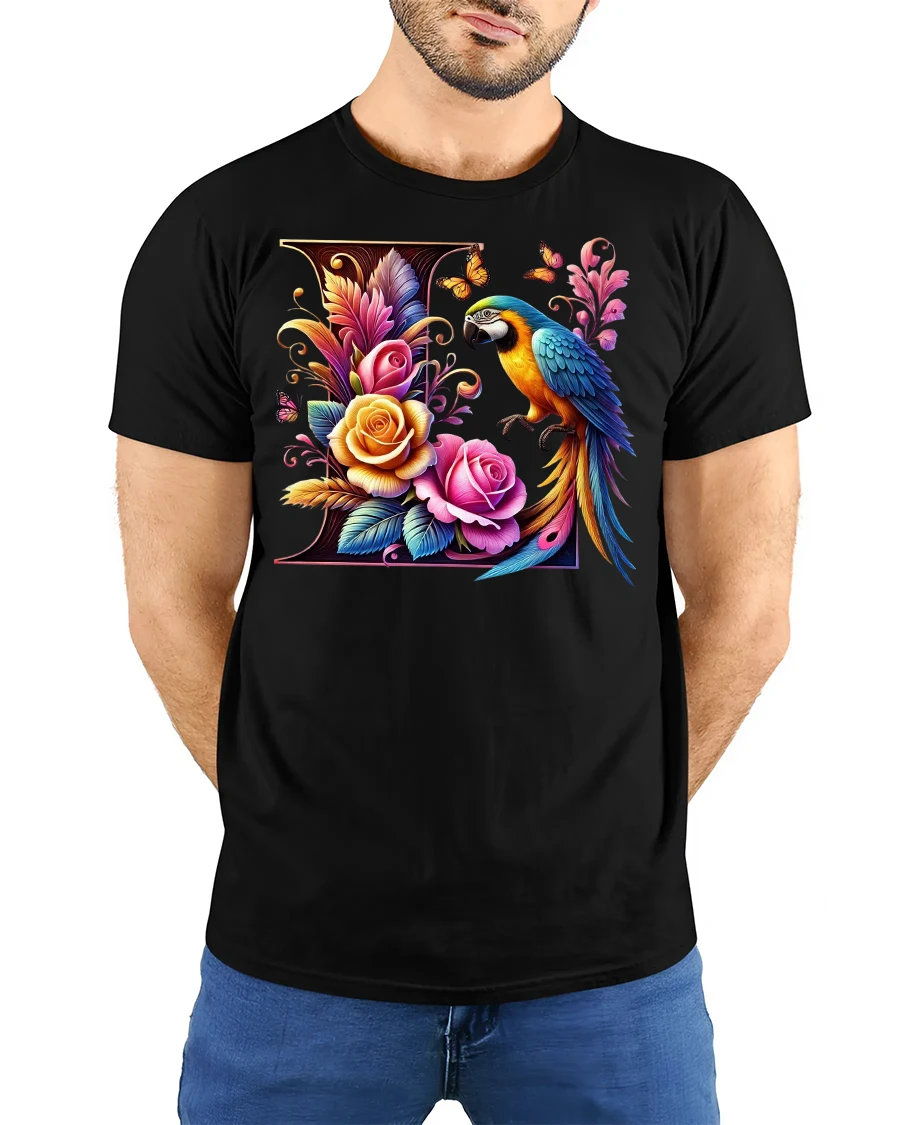 Vibrant Floral Parrot Monogram T-Shirt with Colorful Letter Art delivers a bold and expressive style perfect for anyone who loves exotic birds, floral motifs, or personalized monogram-inspired designs. This beautifully illustrated tee features an intricately detailed parrot perched beside a stunning arrangement of roses and leaves, all wrapped around a decorative letter form. The rich color palette and artistic composition make this tshirt a standout piece for everyday wear or special occasions.