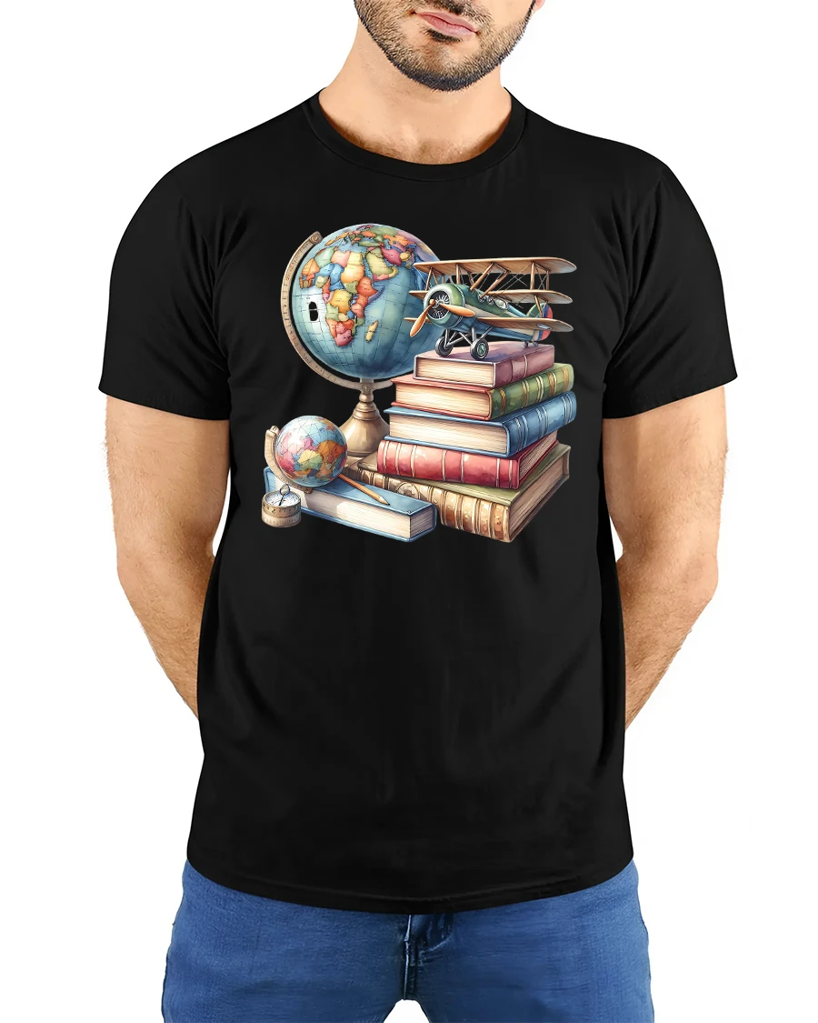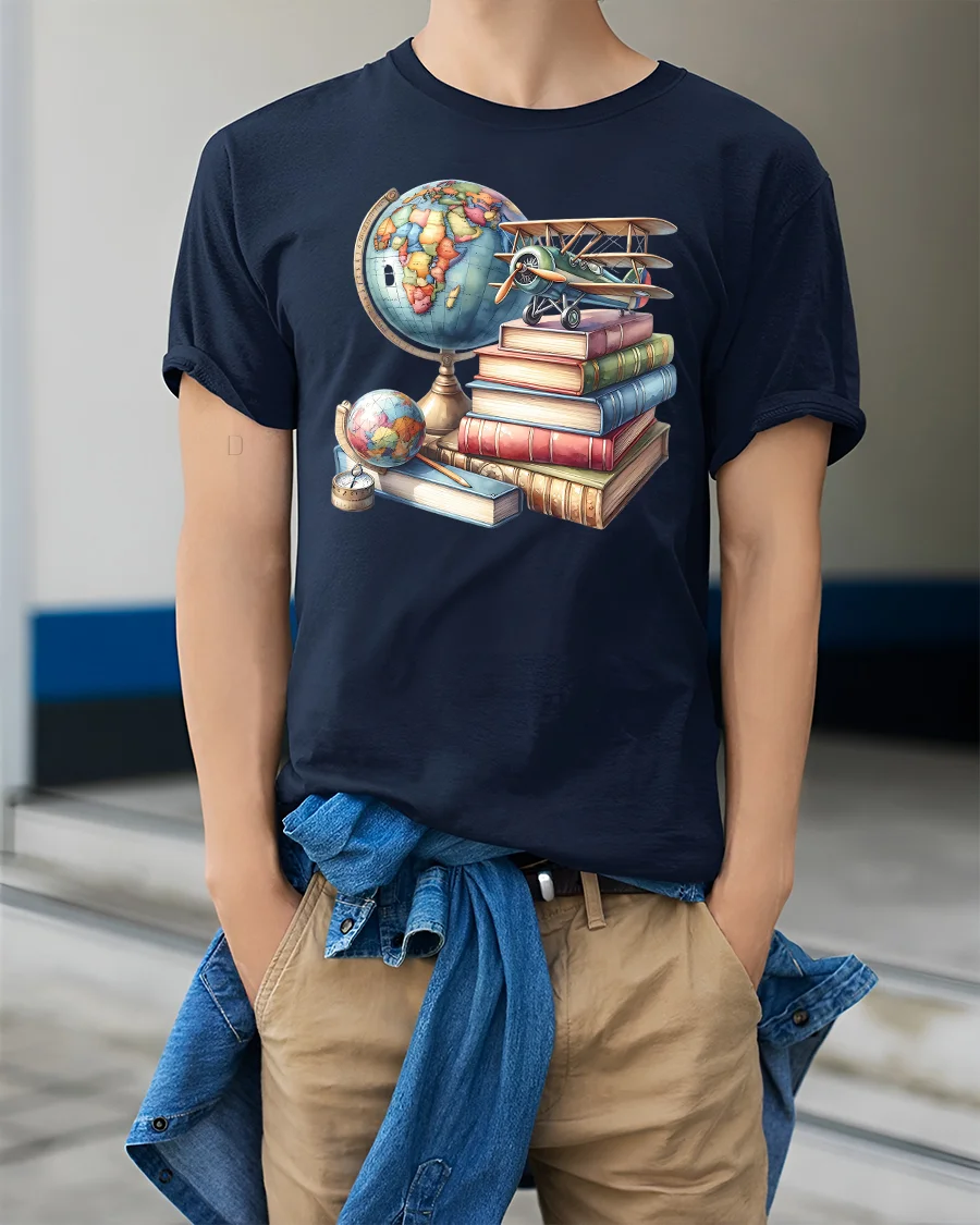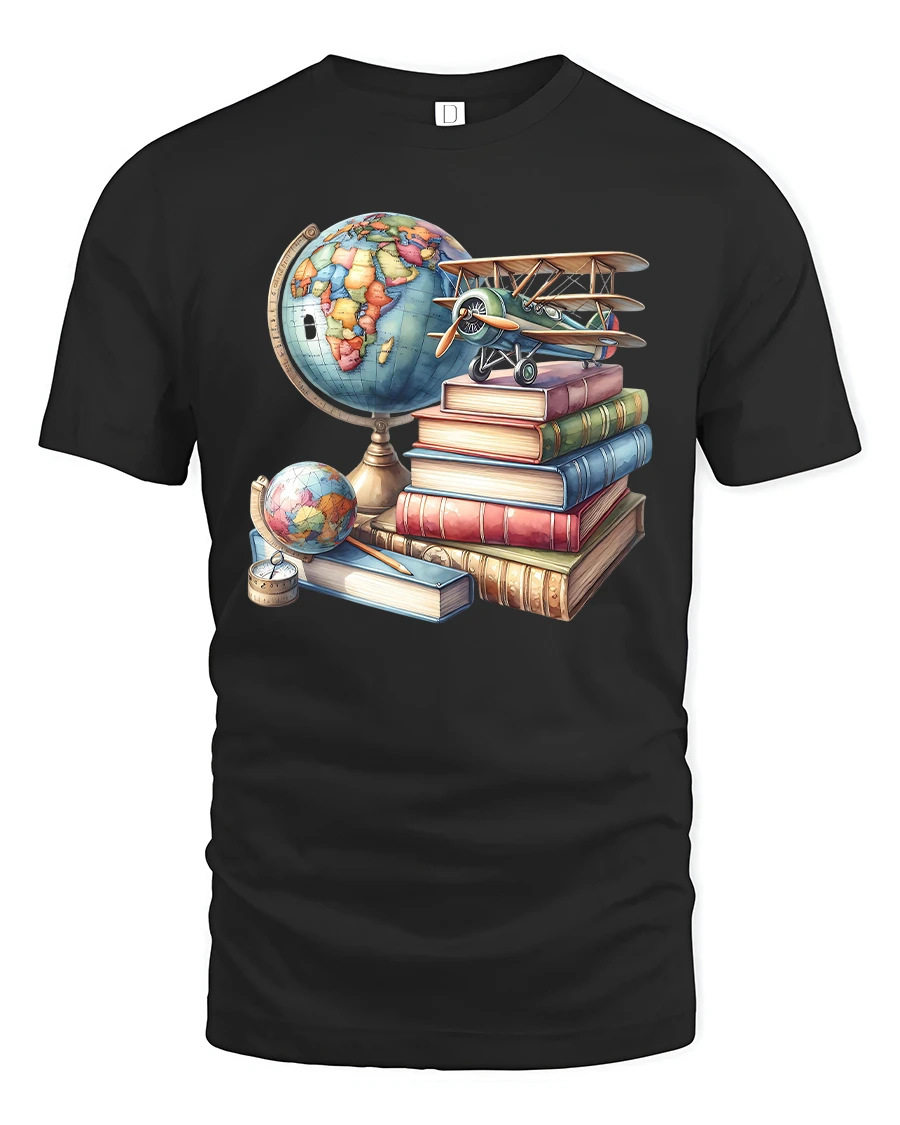 Made with soft, breathable fabric, this t-shirt provides comfortable all-day wear—ideal for school, work, travel, or casual outings. The high-quality print captures the intricate artistry of the globe, book covers, and vintage airplane, keeping colors vibrant wash after wash. Whether paired with jeans, khakis, or a cozy cardigan, it adds a thoughtful, intellectual touch to everyday style.