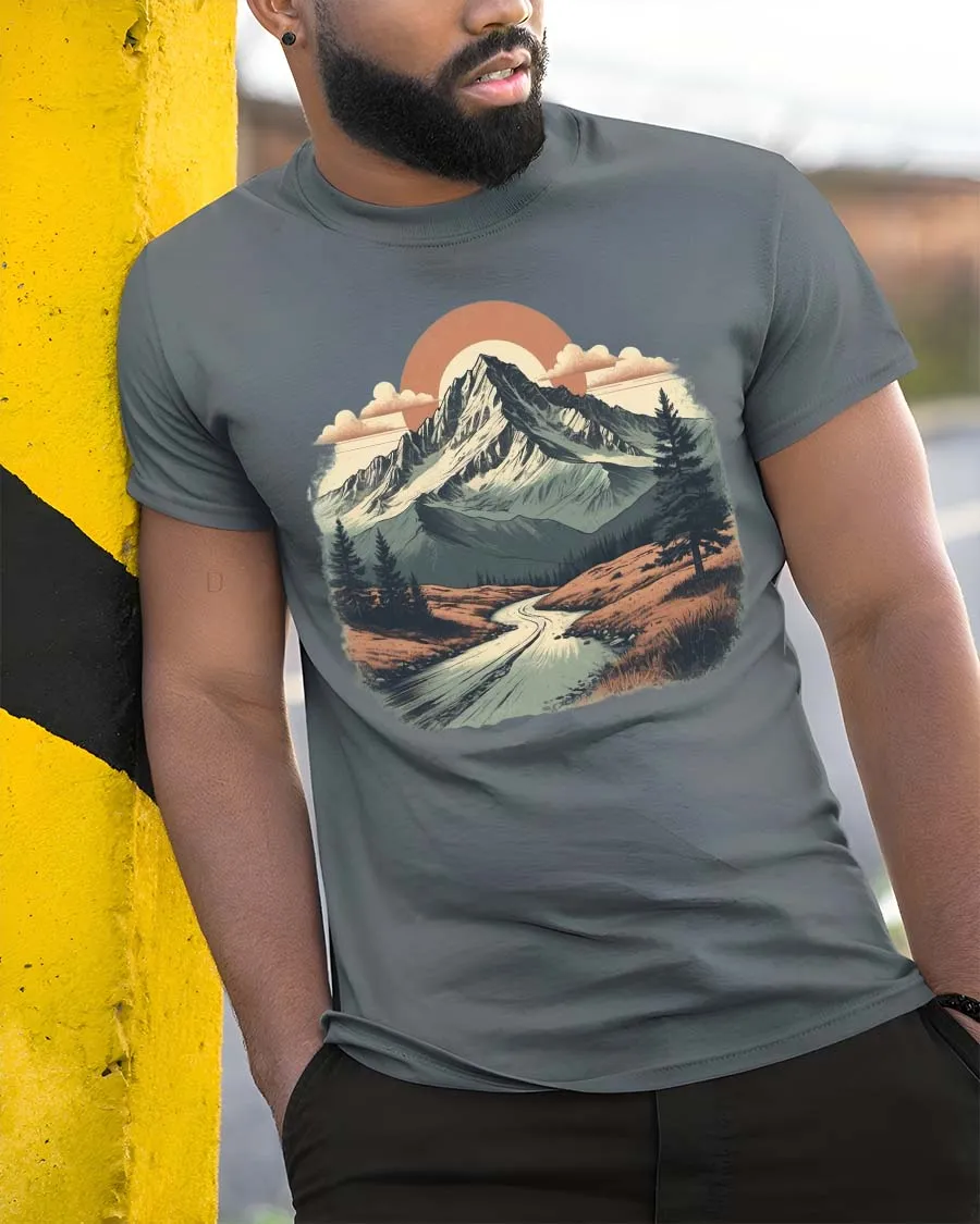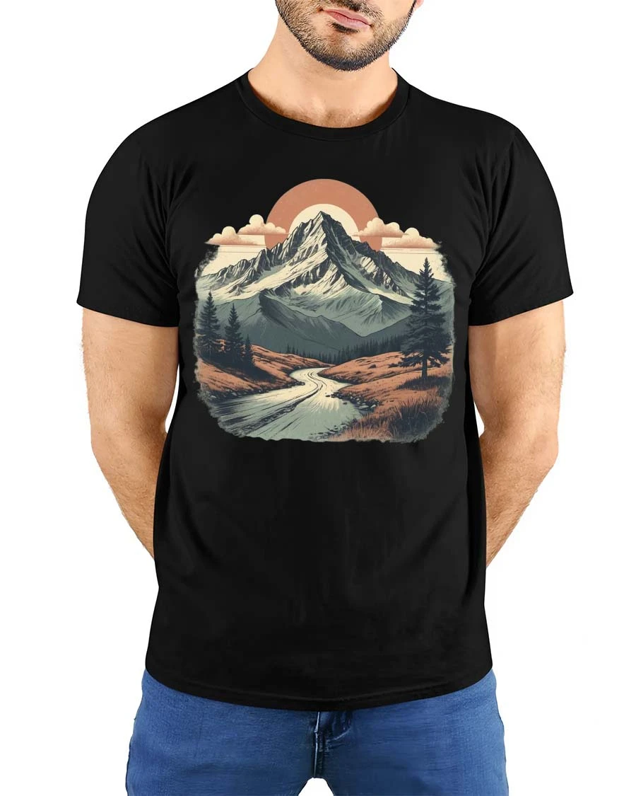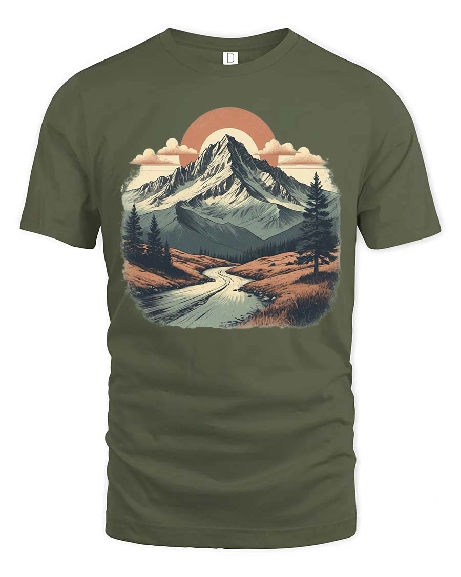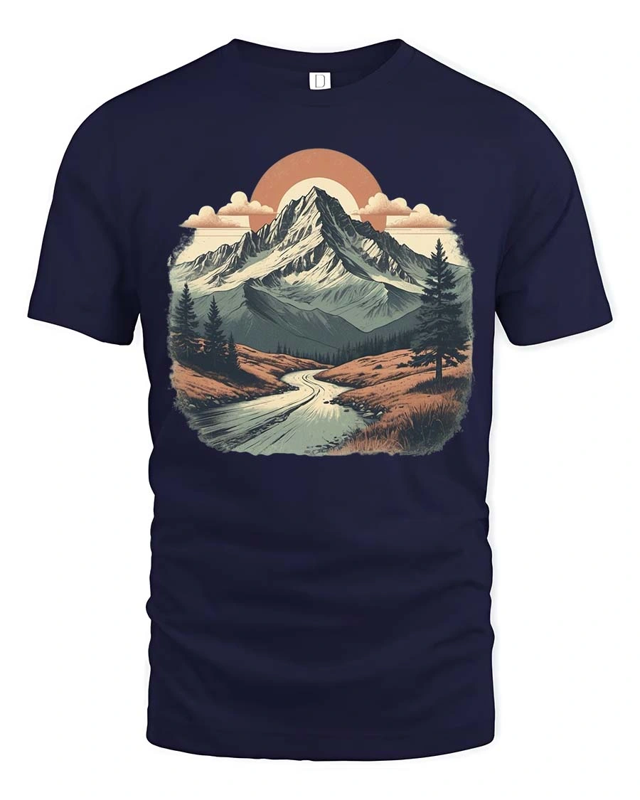 Vintage Mountain Landscape Scenic Nature Adventure Tshirt showcases a peaceful outdoor scene that captures the beauty and calm of the natural wilderness.