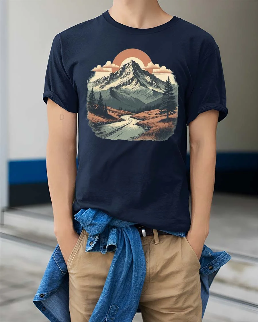 The mountain landscape illustration adds a sense of adventure and natural beauty to everyday fashion while expressing a love for the outdoors and scenic exploration.
