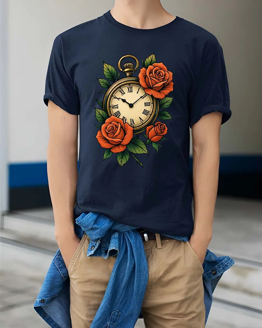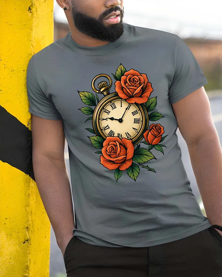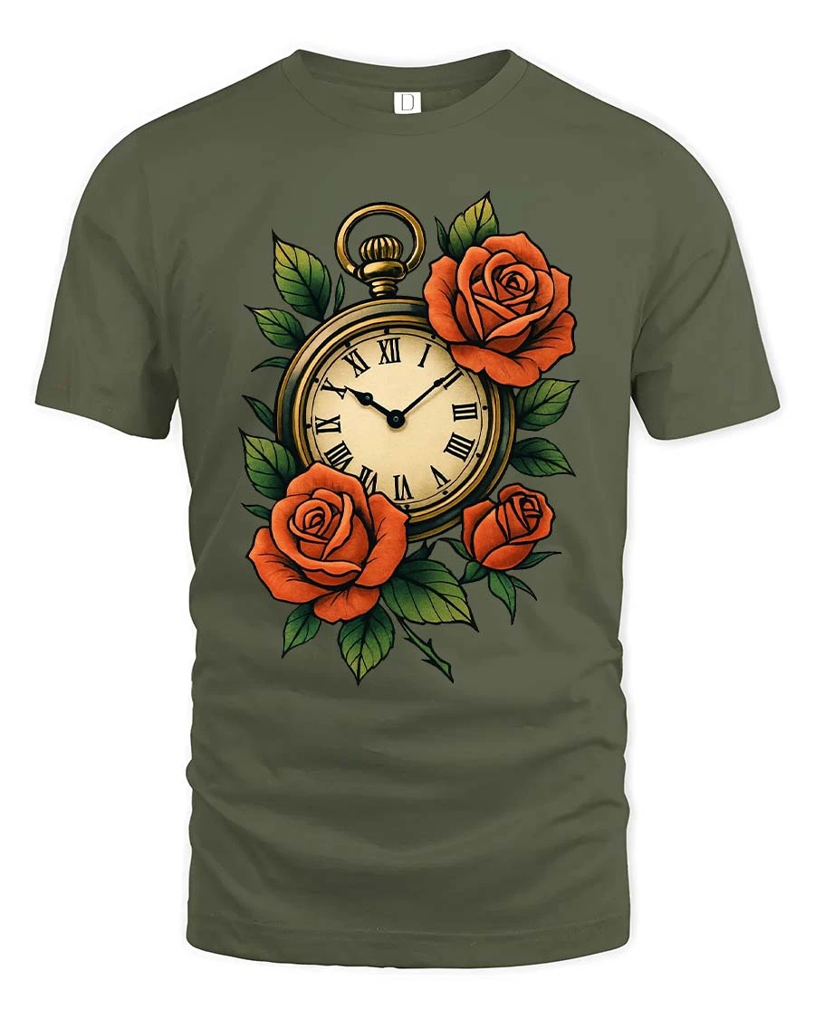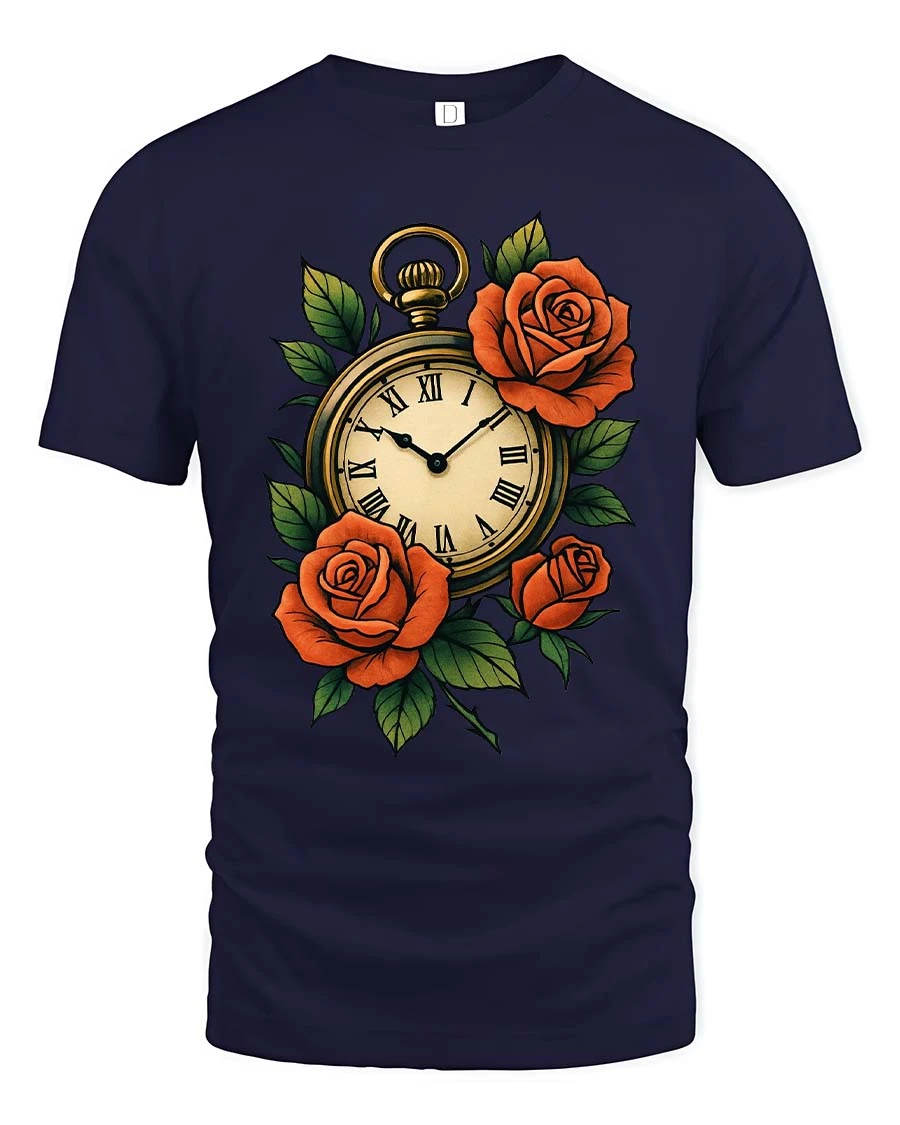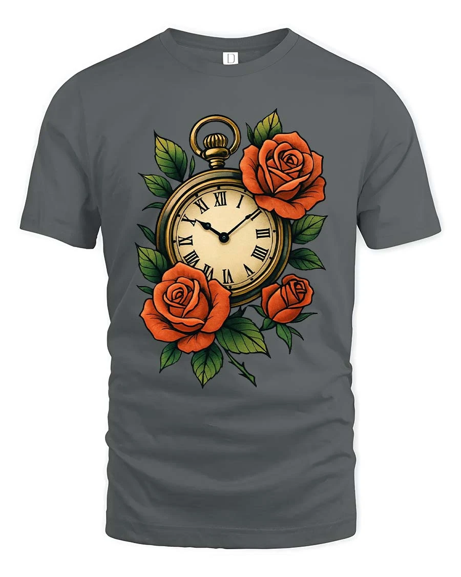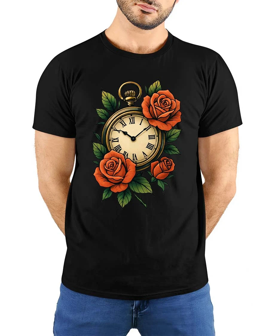 Featuring a classic pocket watch surrounded by blooming roses and lush leaves, this graphic tee captures the essence of vintage charm and symbolic beauty.