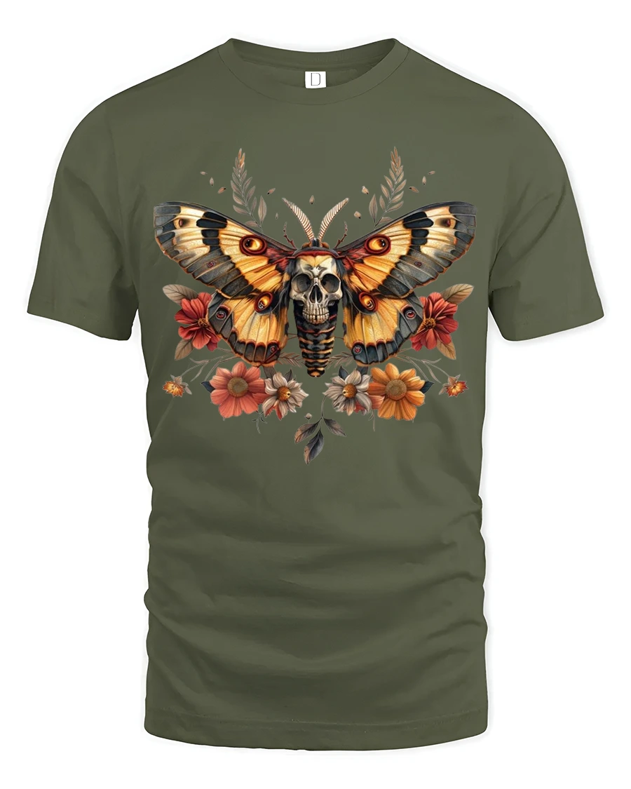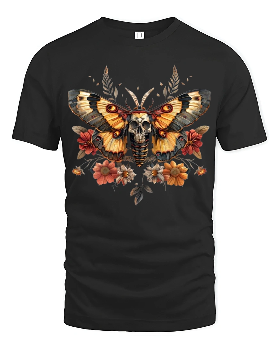Vintage Skull Moth and Autumn Floral Art Tee brings together gothic elegance and natural beauty in a bold and detailed graphic perfect for those who love unique artistic apparel. This tee features a stunning moth with wings fully spread, centered around a dramatic skull motif surrounded by warm autumn flowers. The combination of earthy orange tones and intricate linework gives this shirt a vintage, alternative style that stands out in any wardrobe.