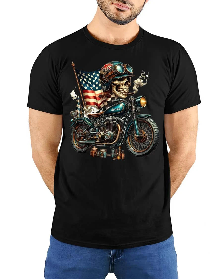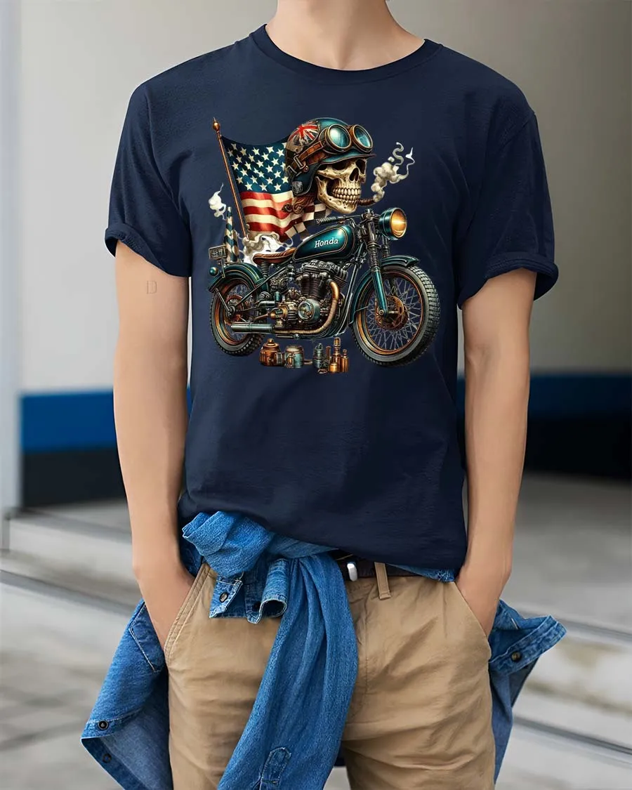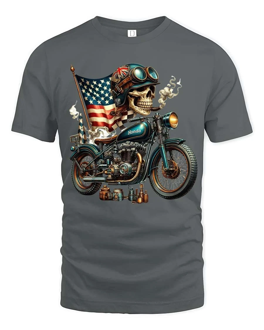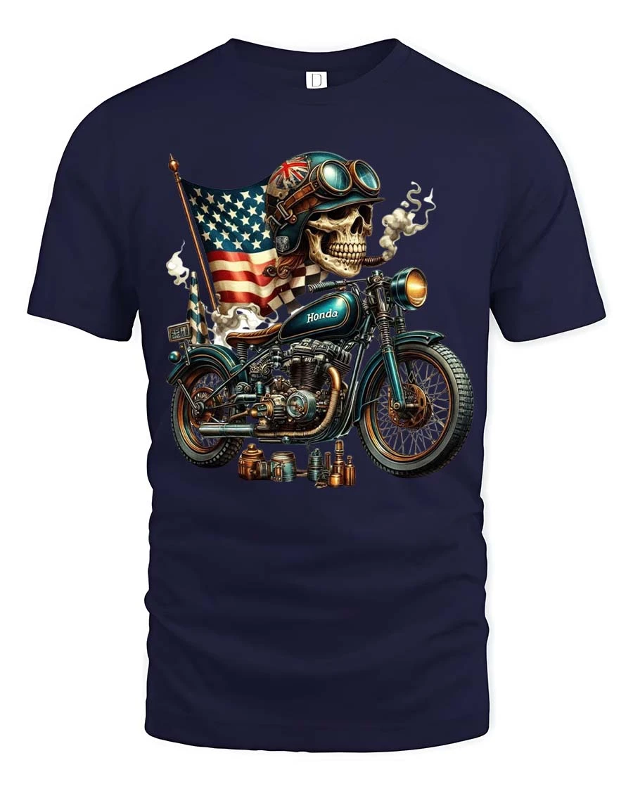 Vintage Skull Rider Motorcycle Graphic Tee Patriotic Tshirt blends classic biker attitude with patriotic inspiration through a detailed illustration featuring a skull rider and iconic American flag element.