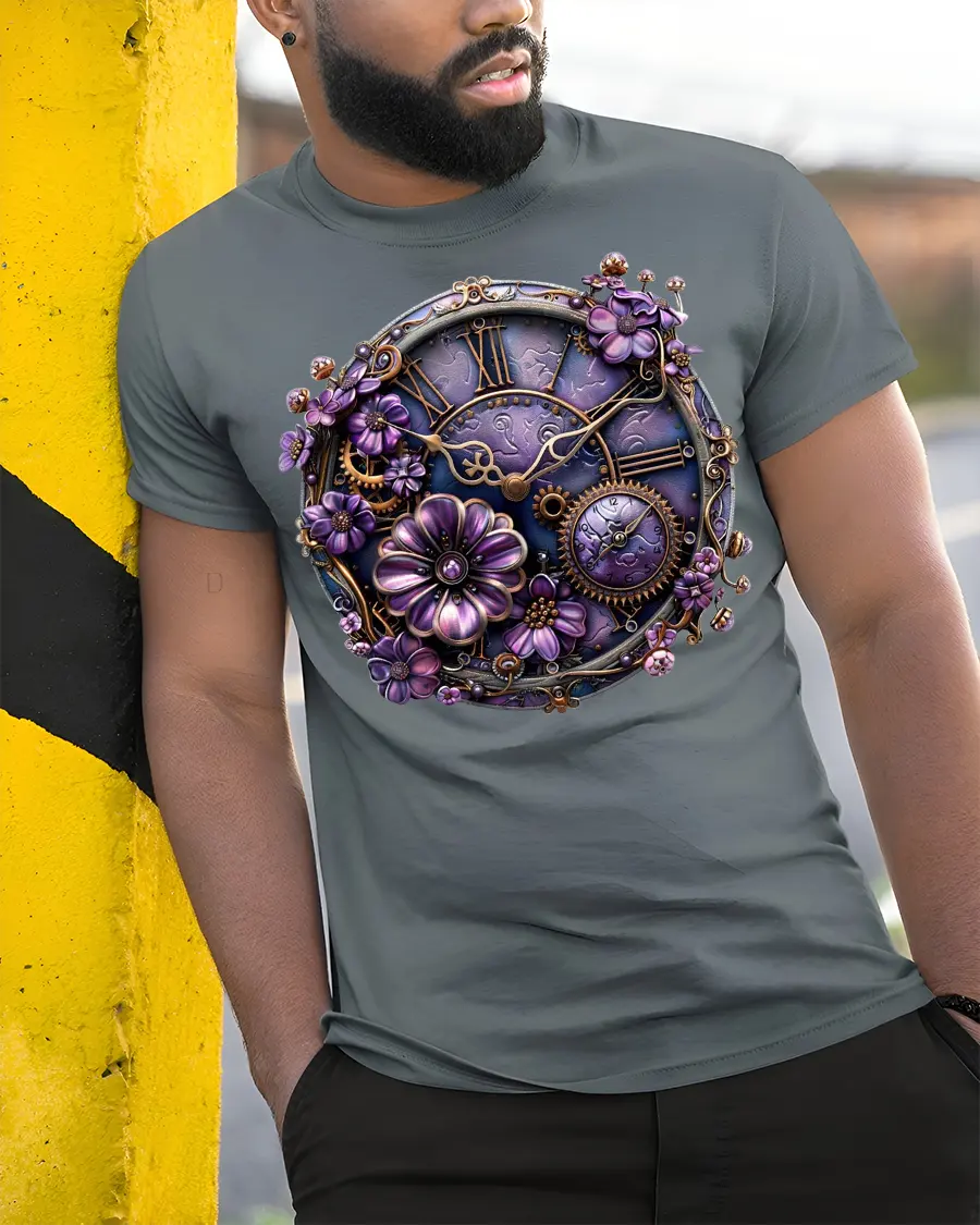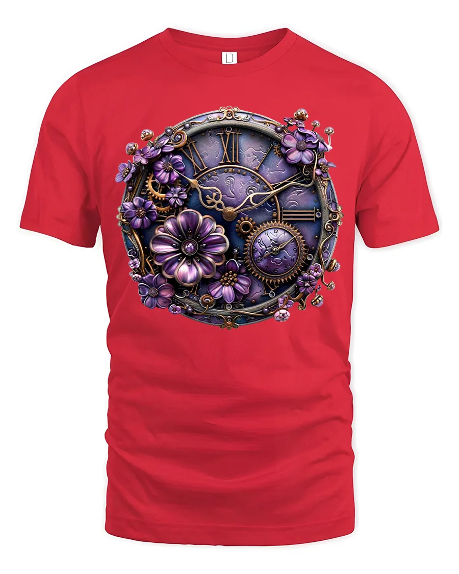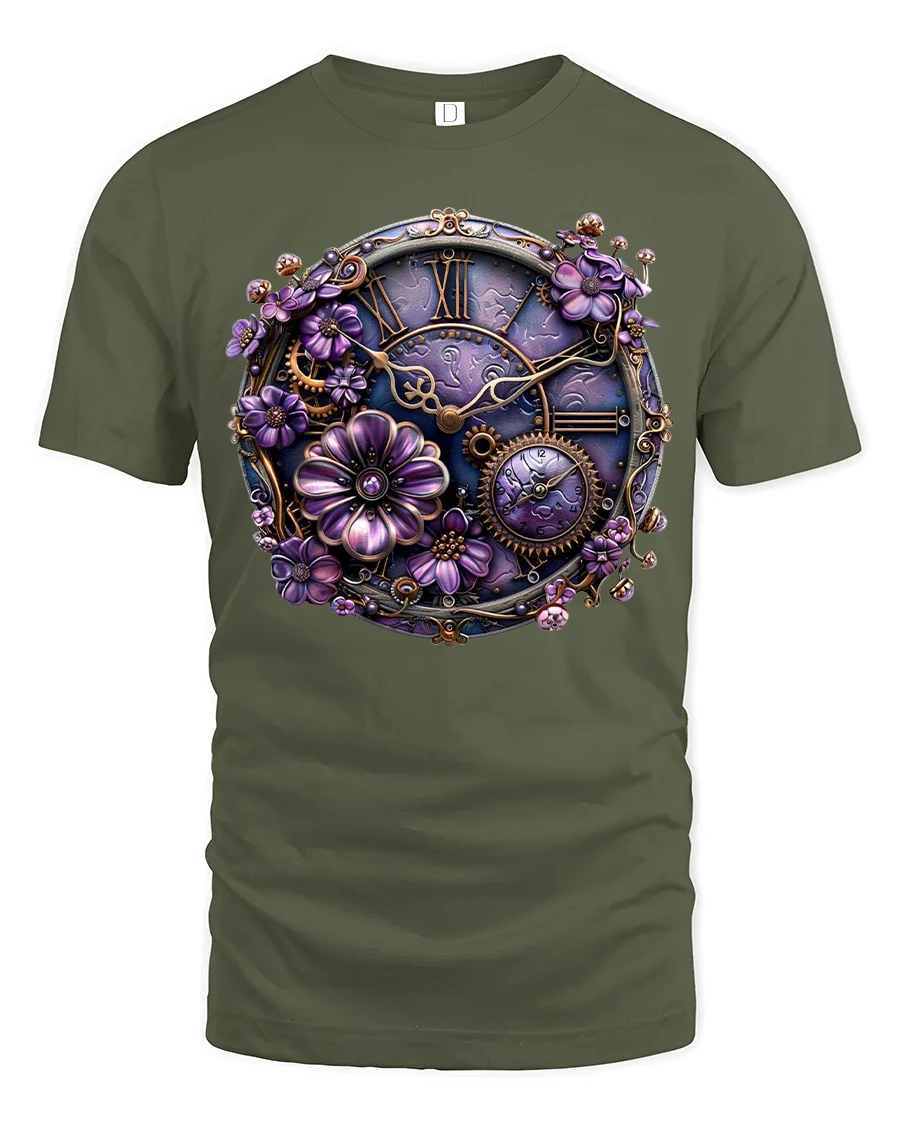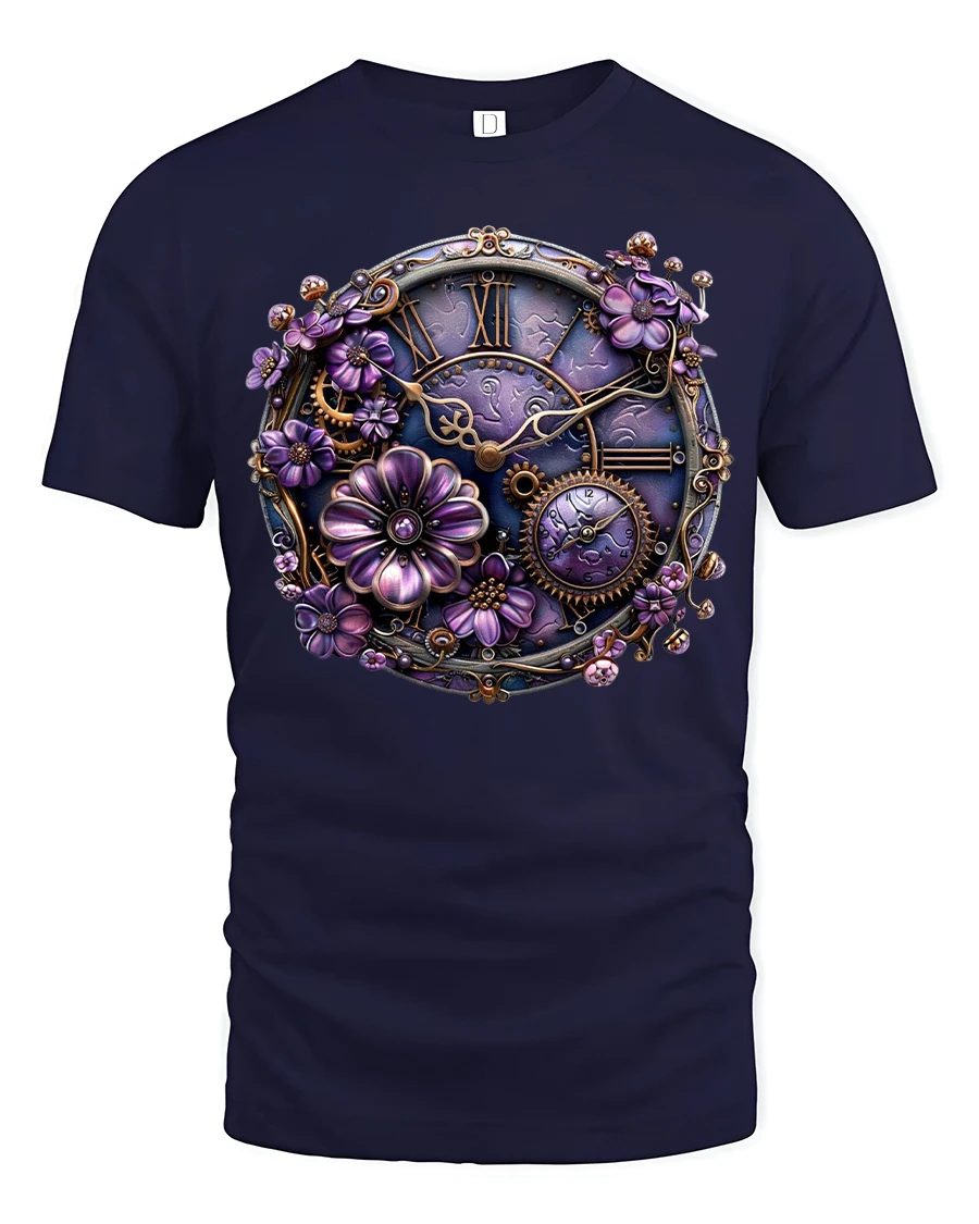 Vintage Steampunk Floral Clock Art Tee With Elegant Purple Gears brings together the perfect fusion of romance, fantasy, and mechanical artistry. This stunning design blends intricate clockwork gears with blooming purple flowers, creating a breathtaking visual centerpiece that instantly draws attention. Crafted for fans of steampunk, vintage aesthetics, and unique wearable art, this tee offers both creativity and character in every detail.