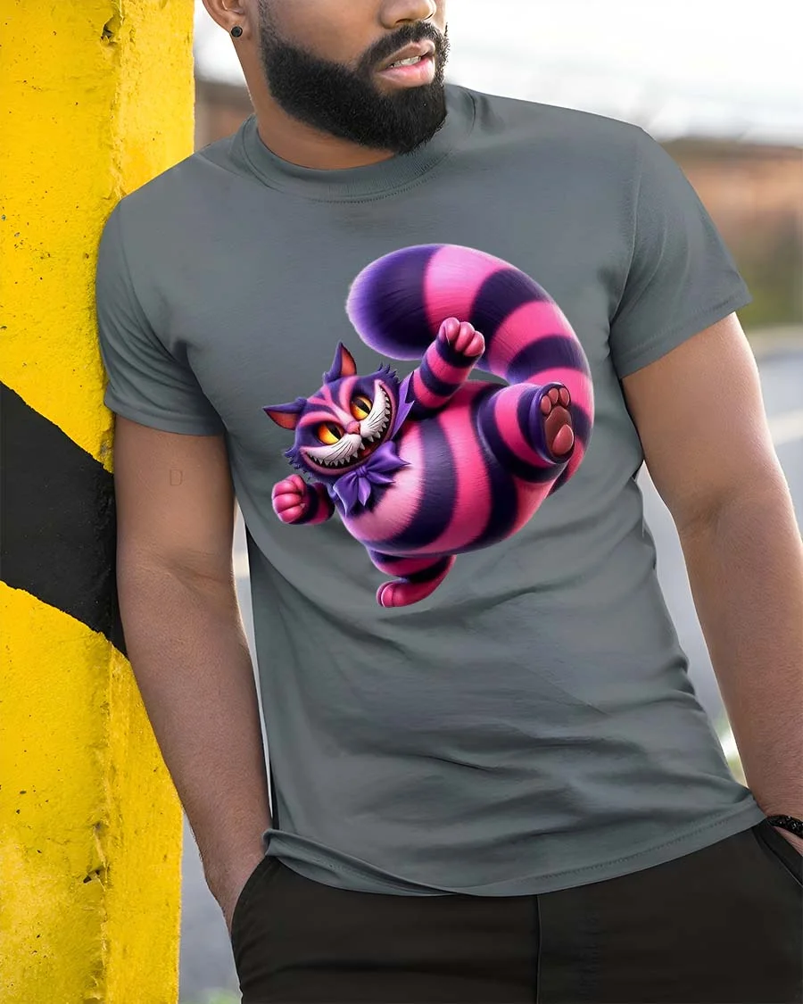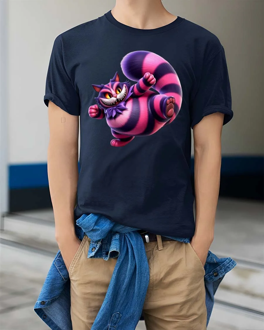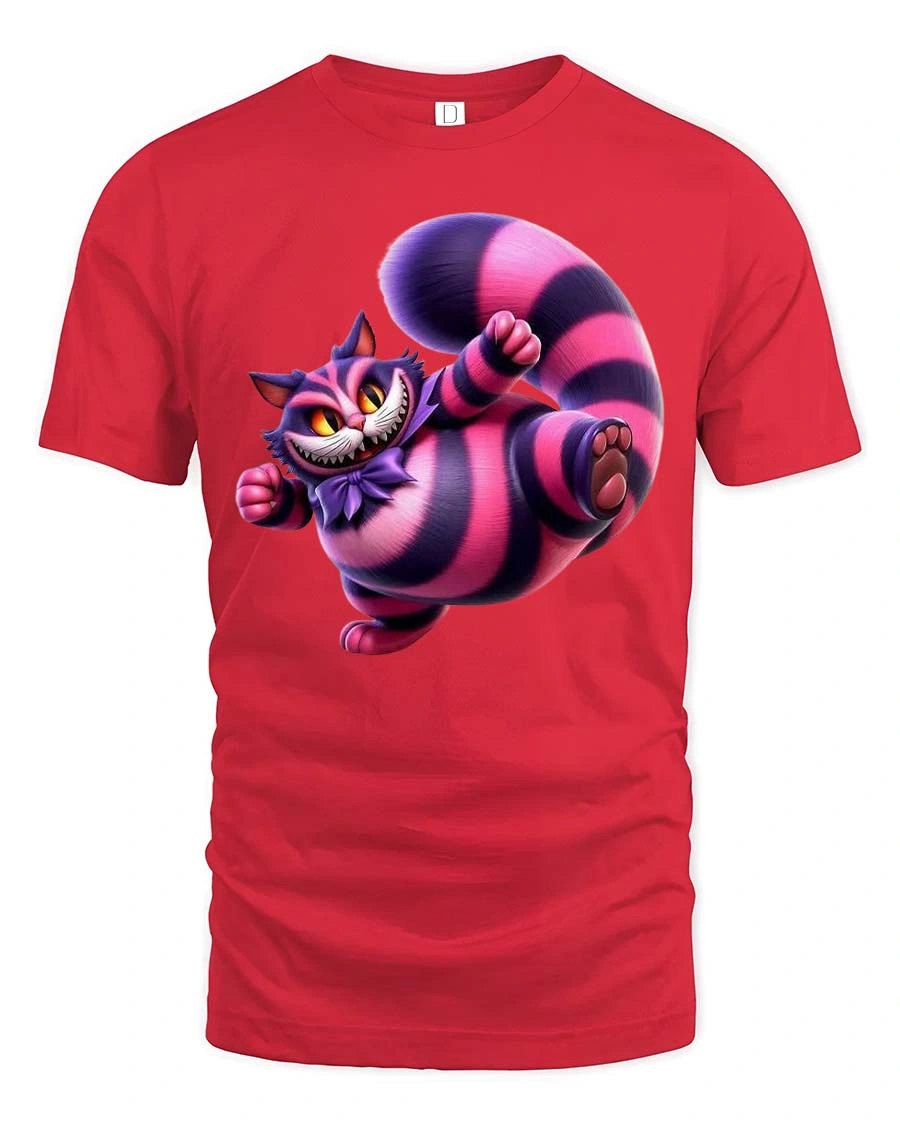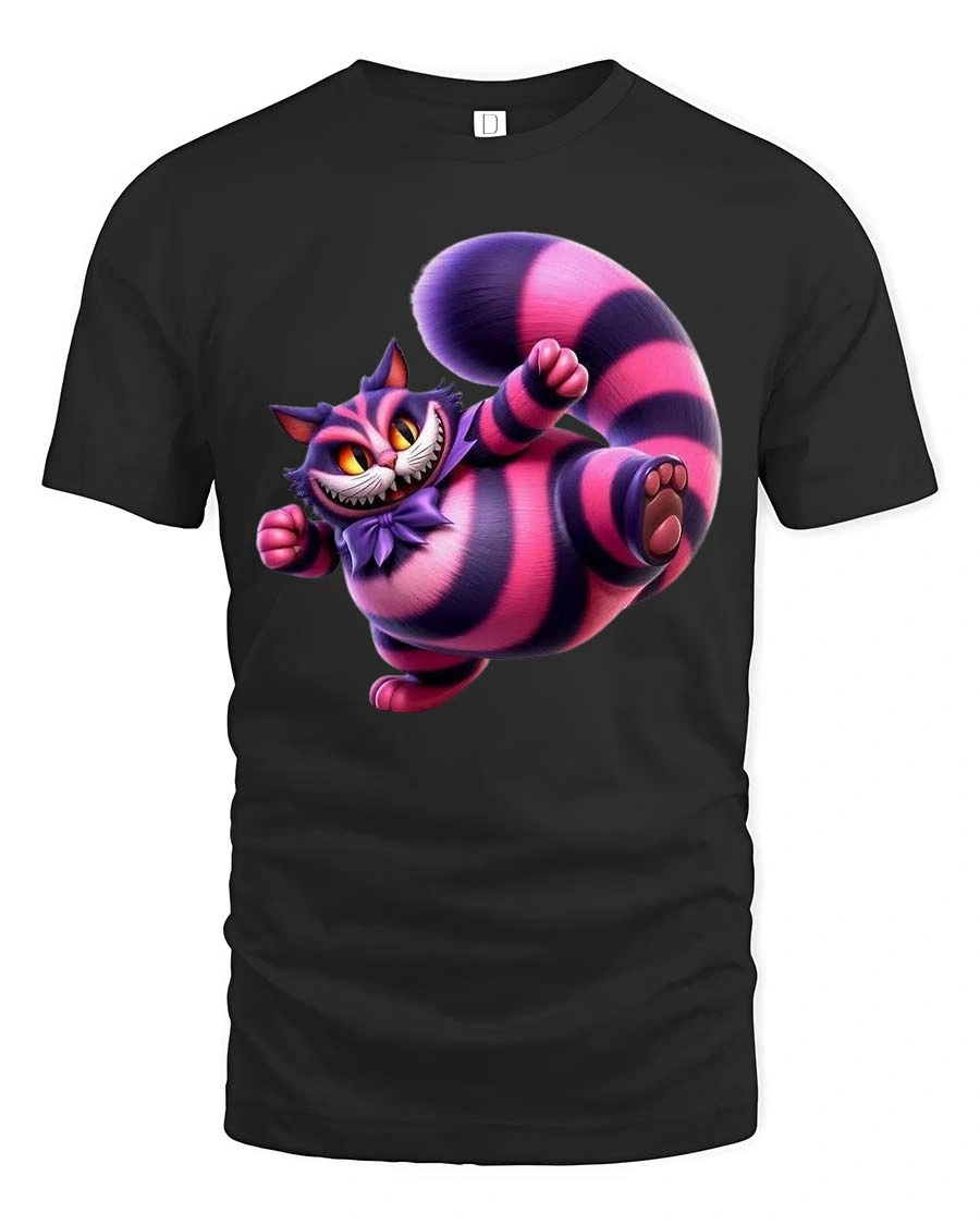 Whimsical Striped Cheshire Cat Cartoon Fantasy Graphic Tshirt brings playful fantasy energy to life with a bold and mischievous illustrated cat character.